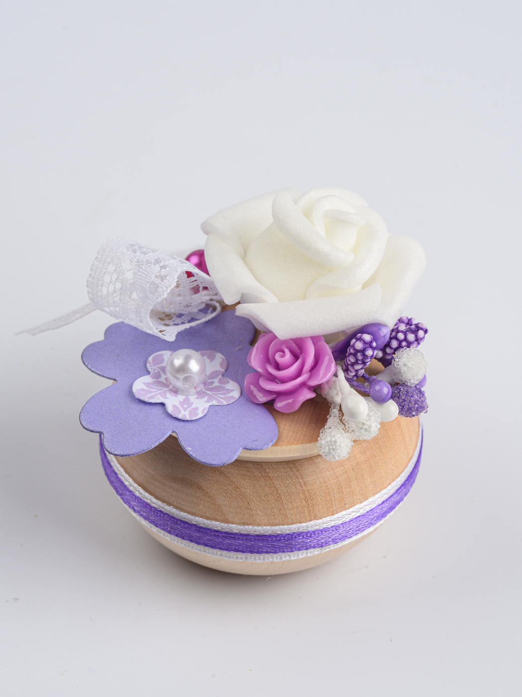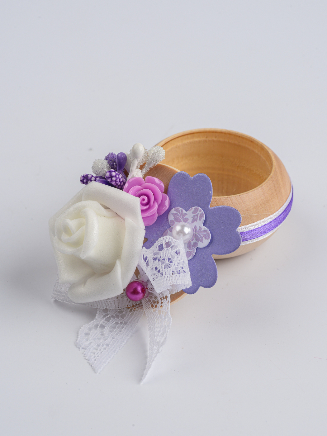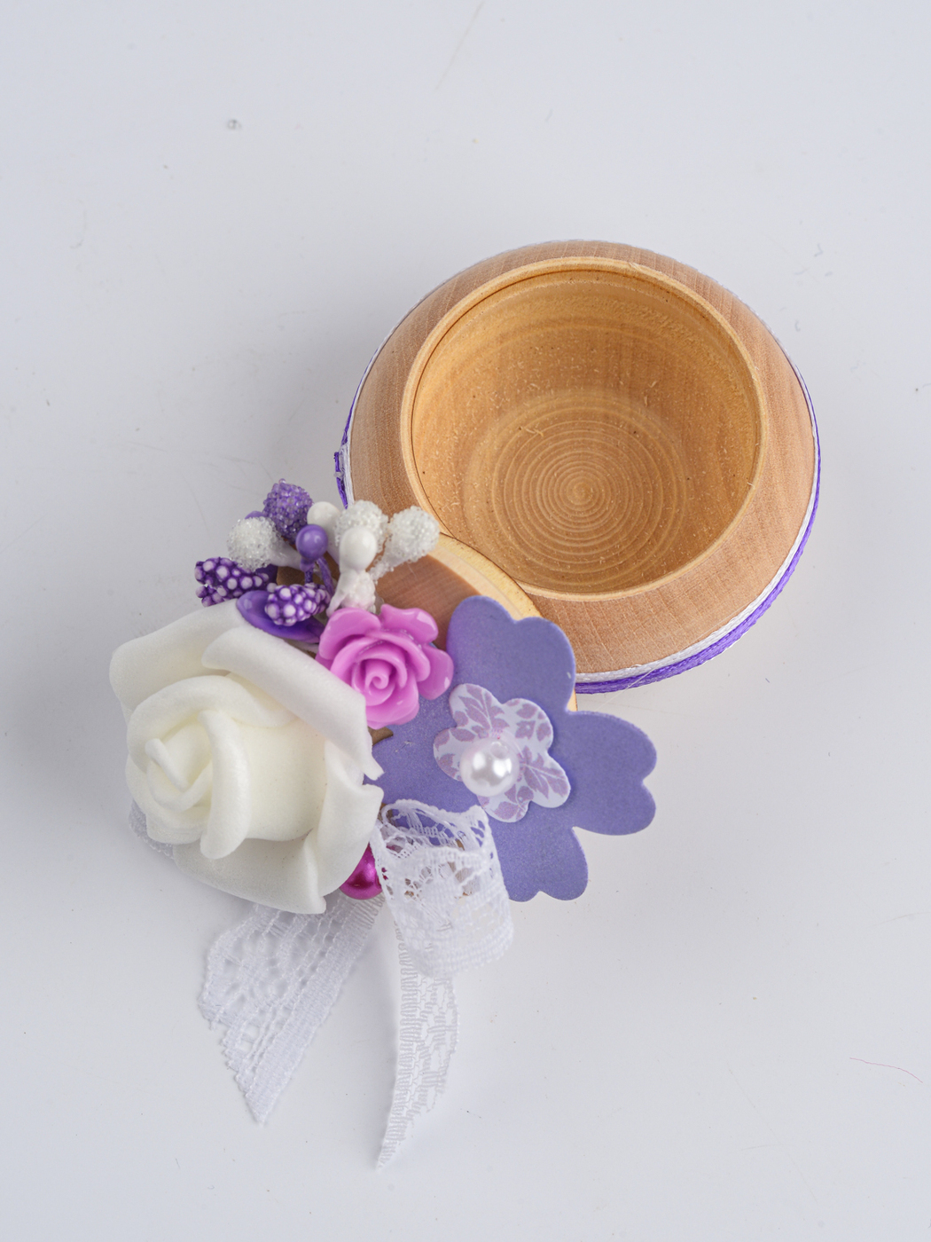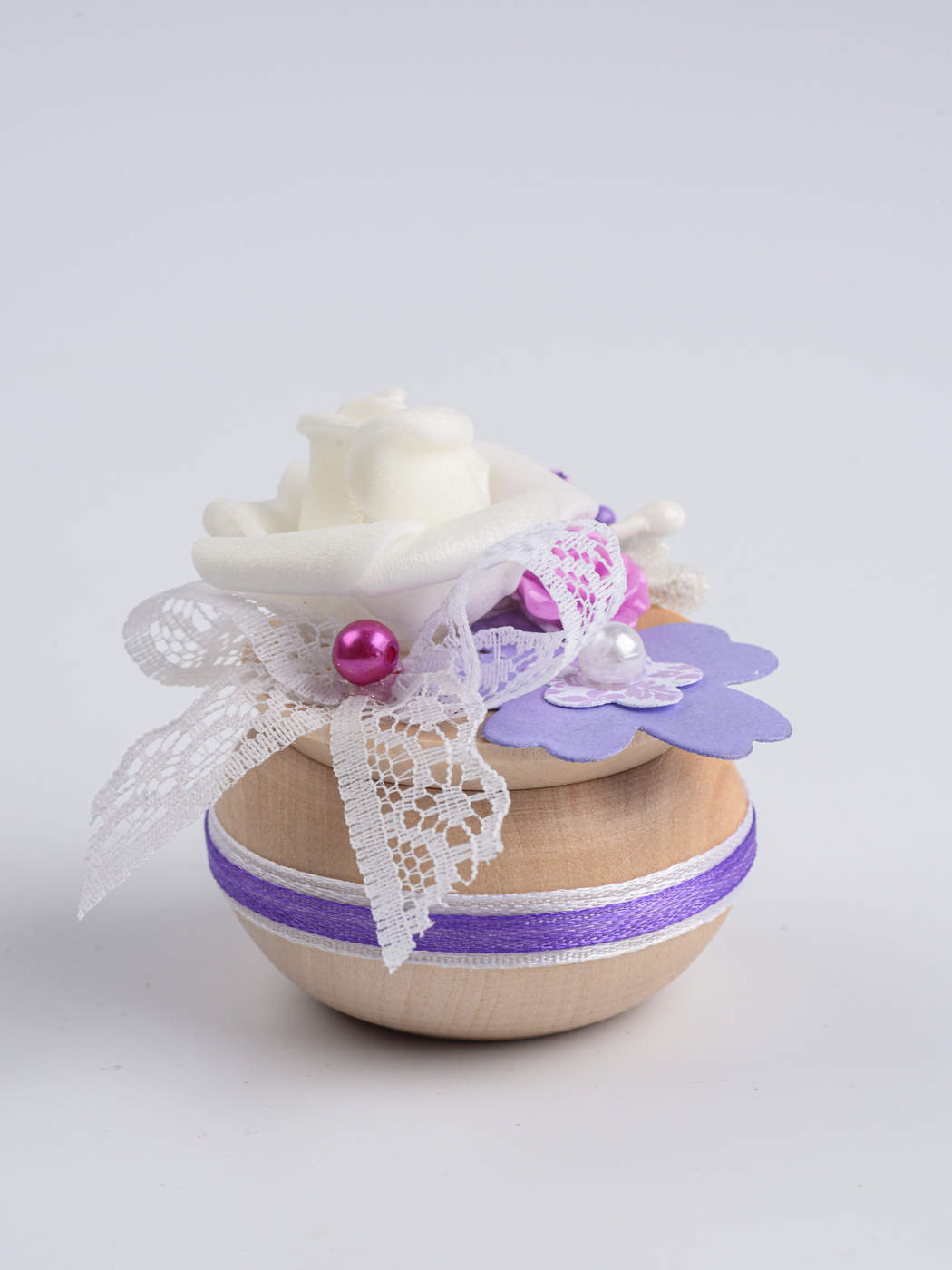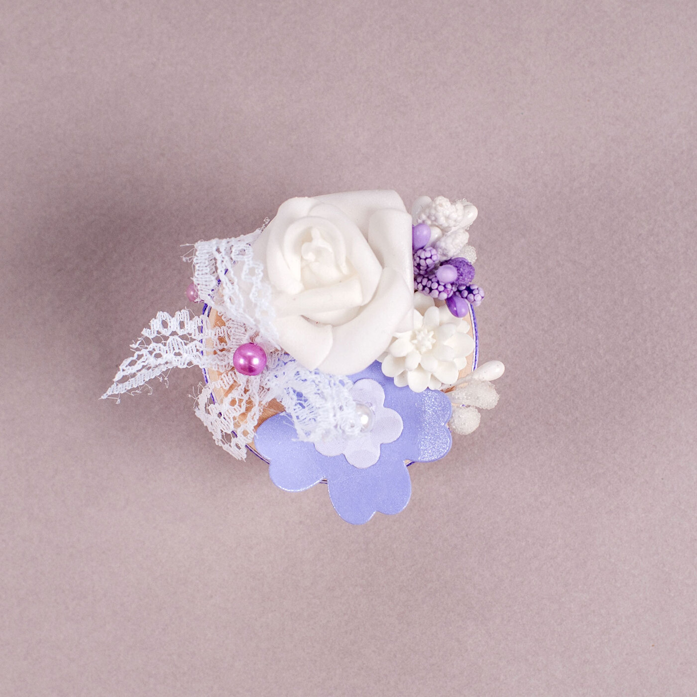 Маленькая свадебная солонка для встречи караваем "Сюита" из дерева с латексными розами, кружевом и атласным декором в белой и лиловой гамме
