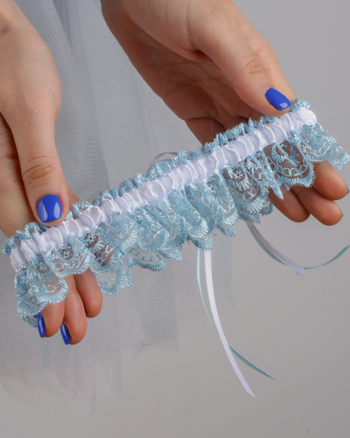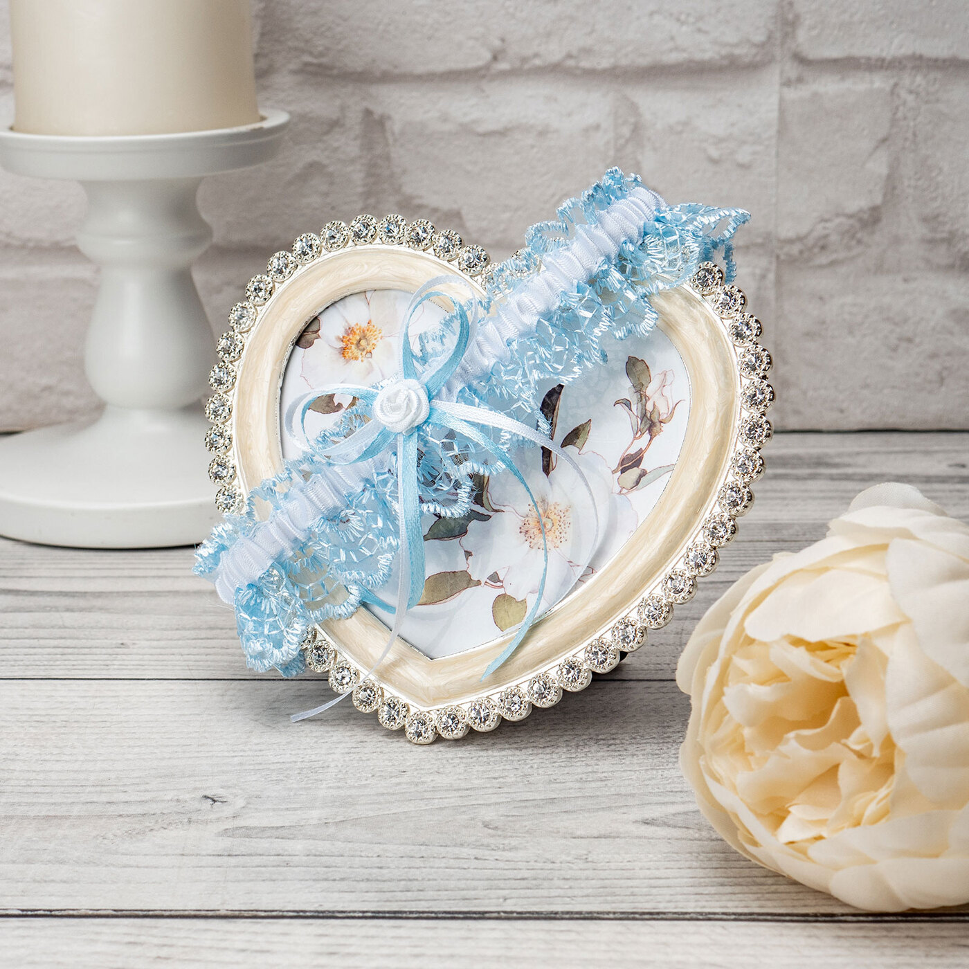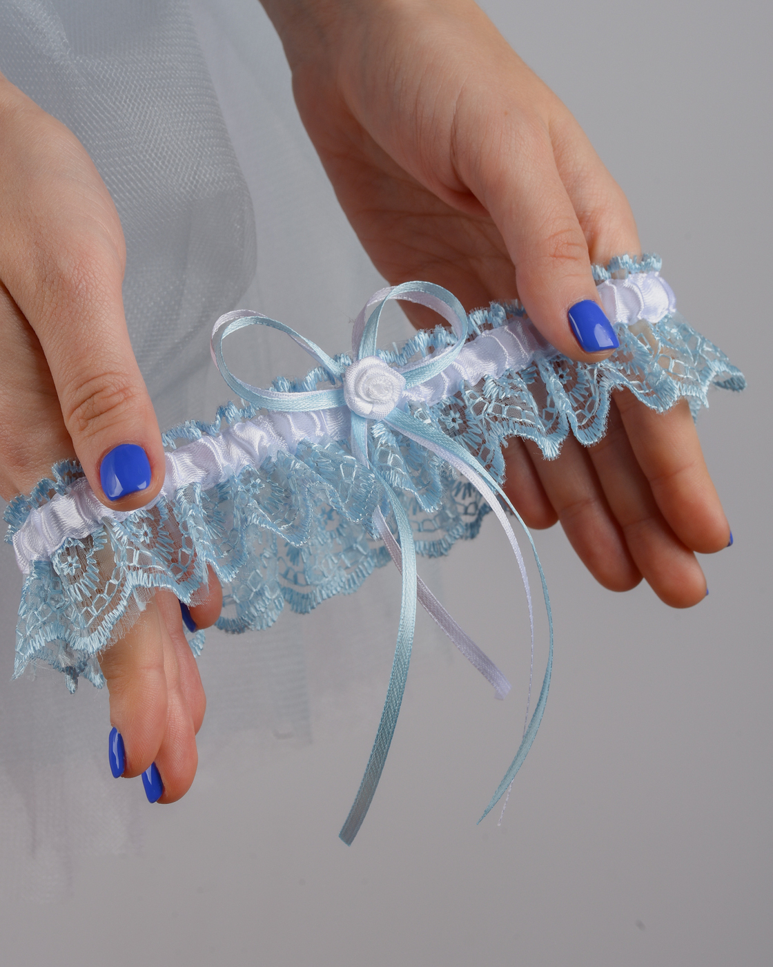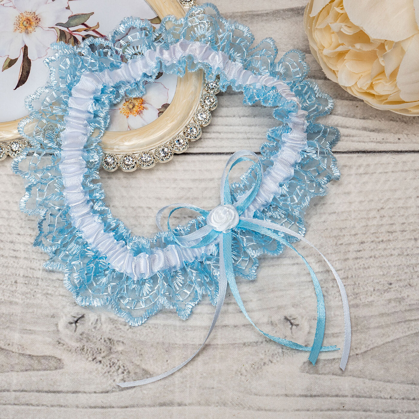 Атласная подвязка "Гжель" для невесты на свадьбу и фотосъемку из голубого и белого атласа с бантом и украшением из сверкающих страз
