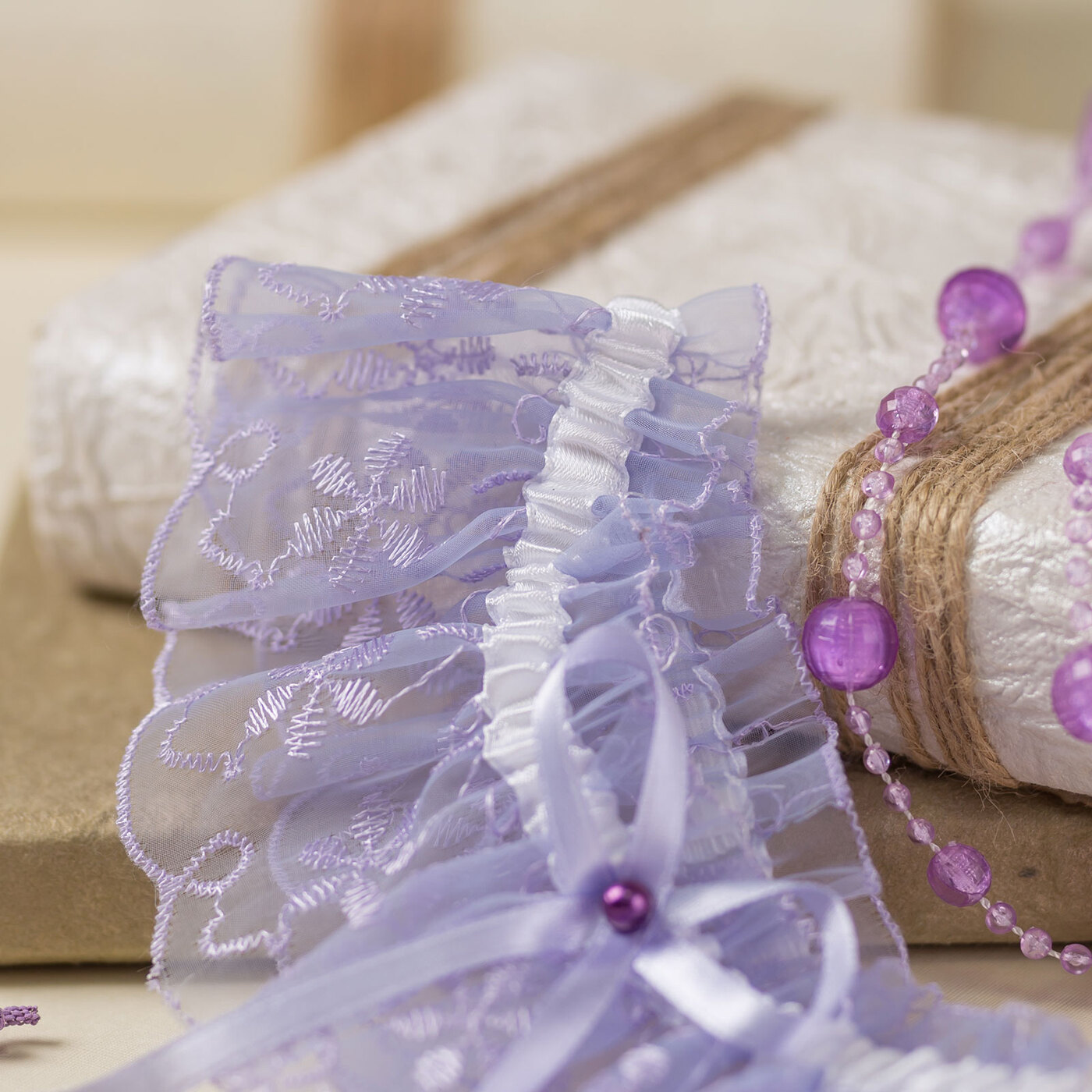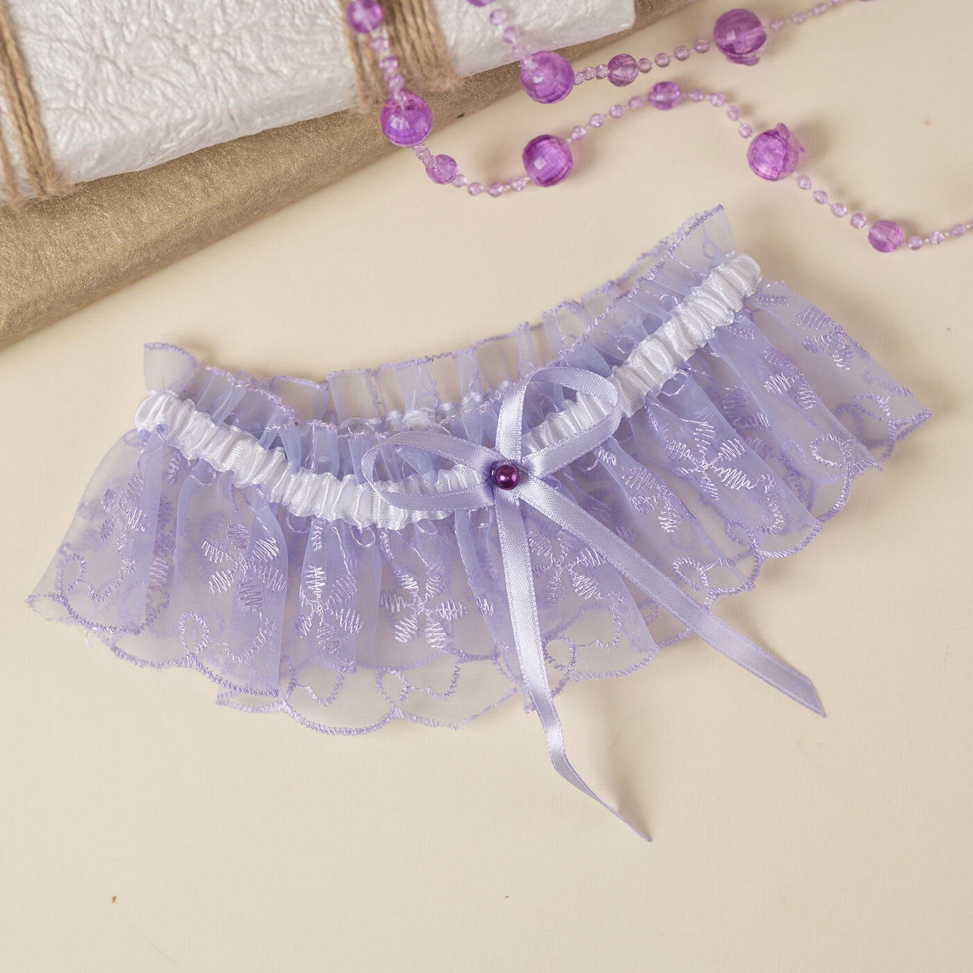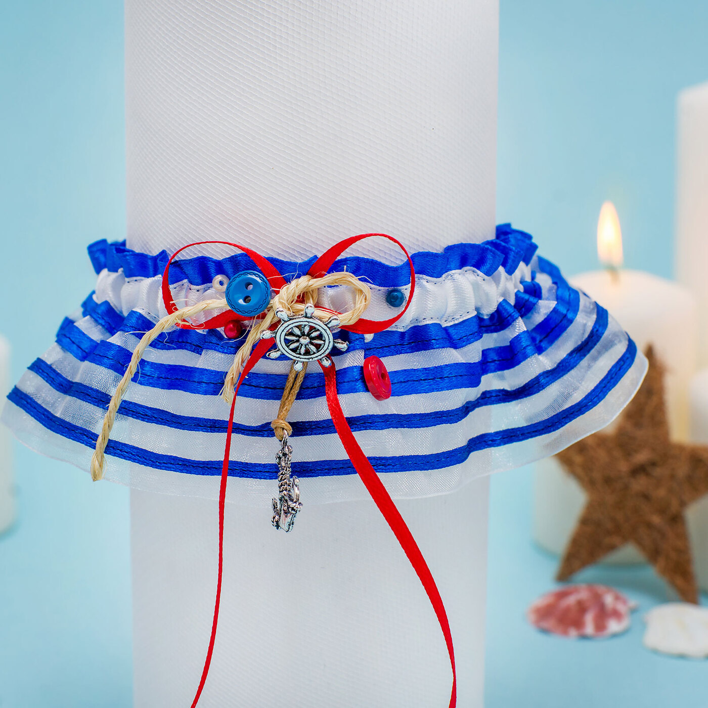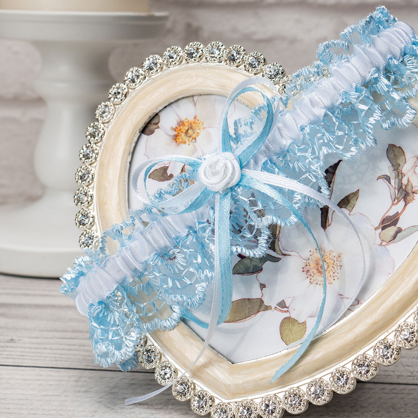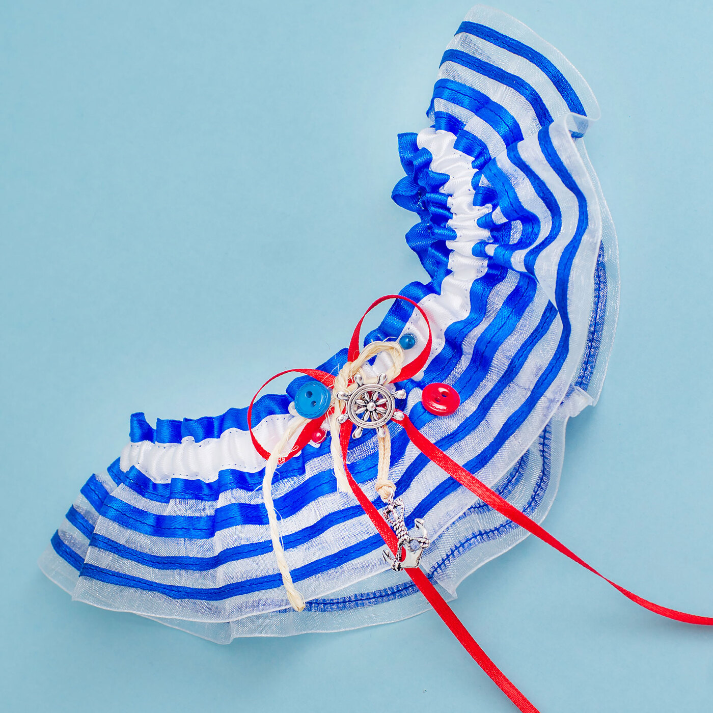 Атласная подвязка "Гжель" для невесты на свадьбу и фотосъемку из голубого и белого атласа с бантом и украшением из сверкающих страз