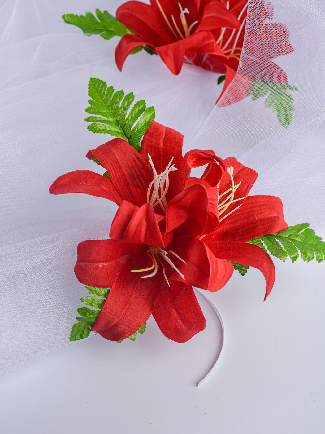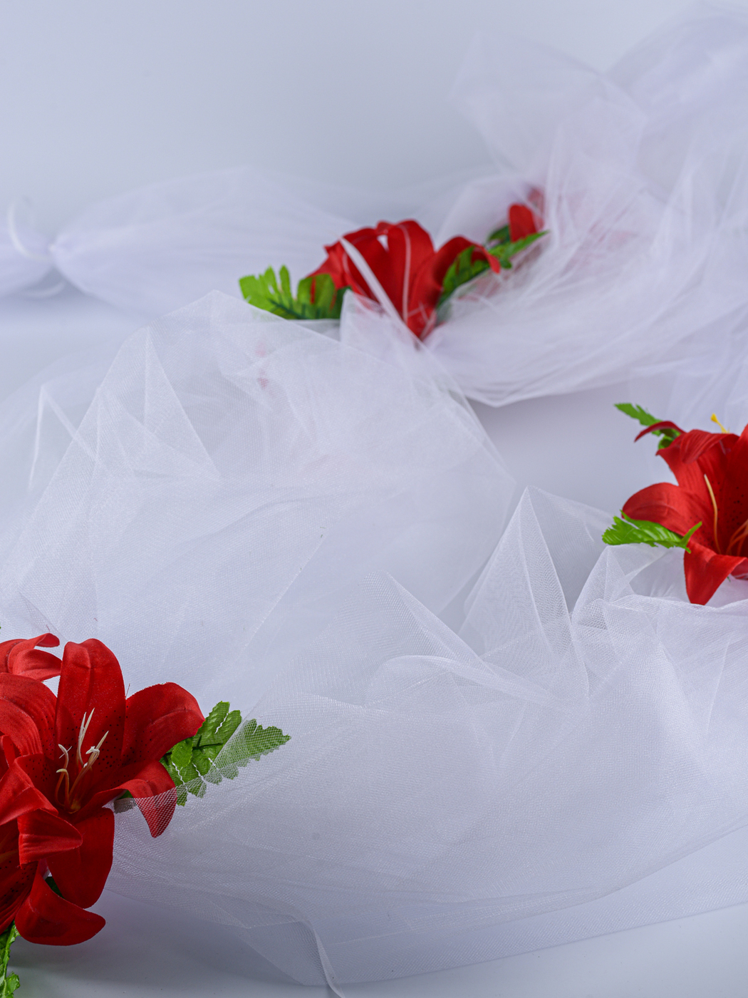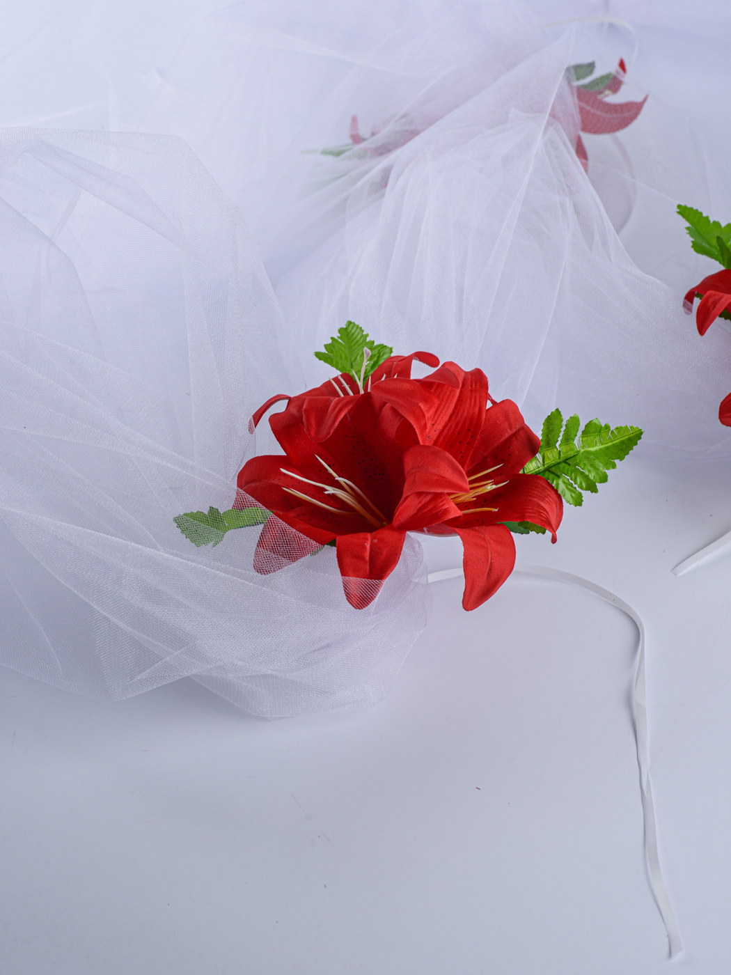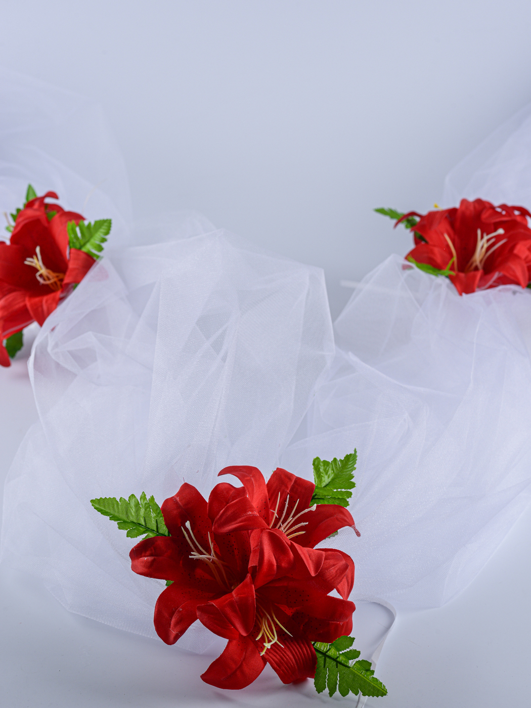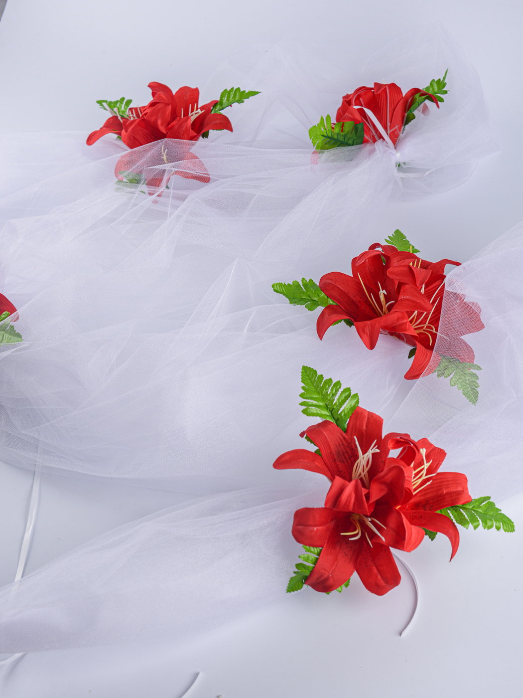 Декоративная лента на капот машины жениха и невесты из белого фатина с красными лилиями из текстиля