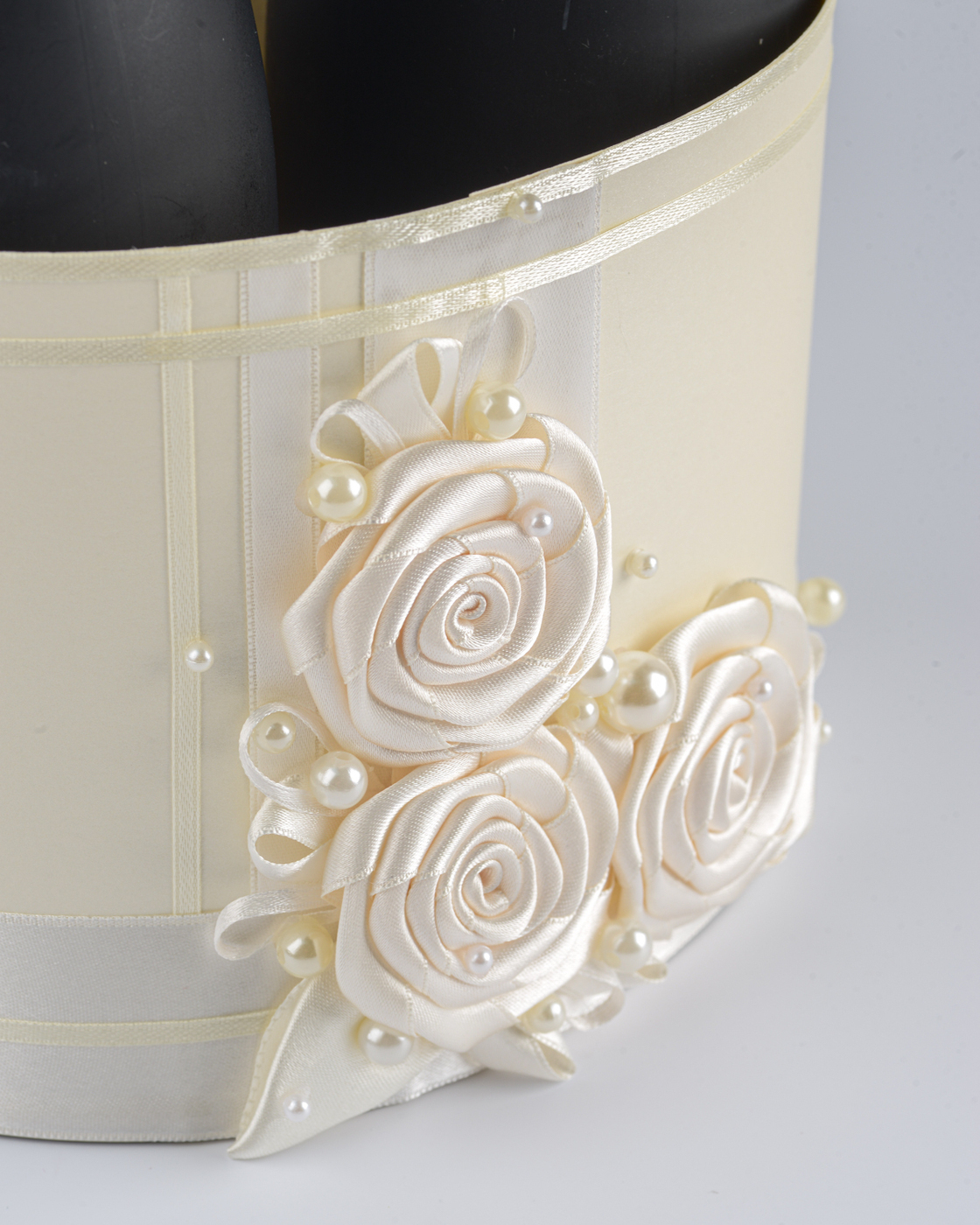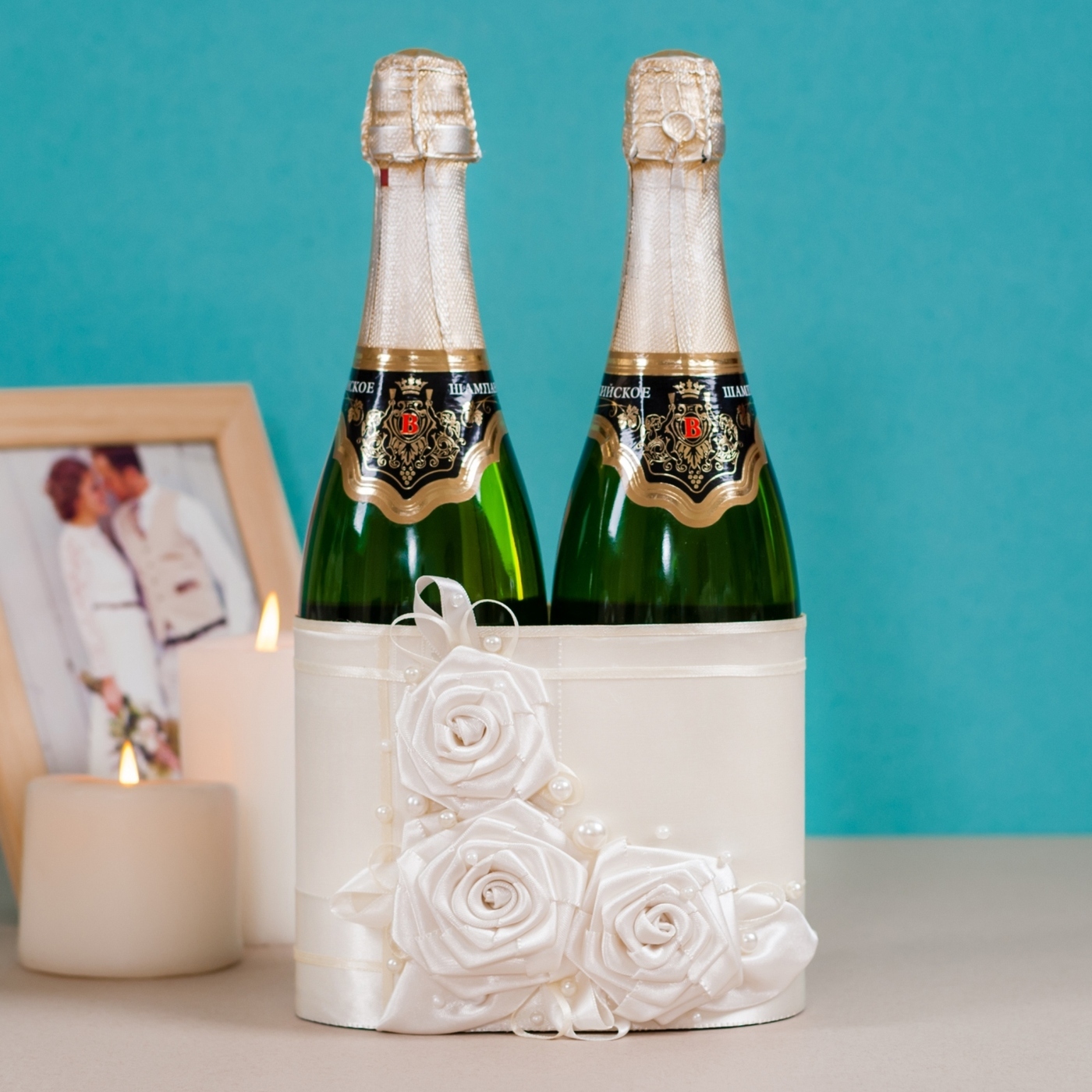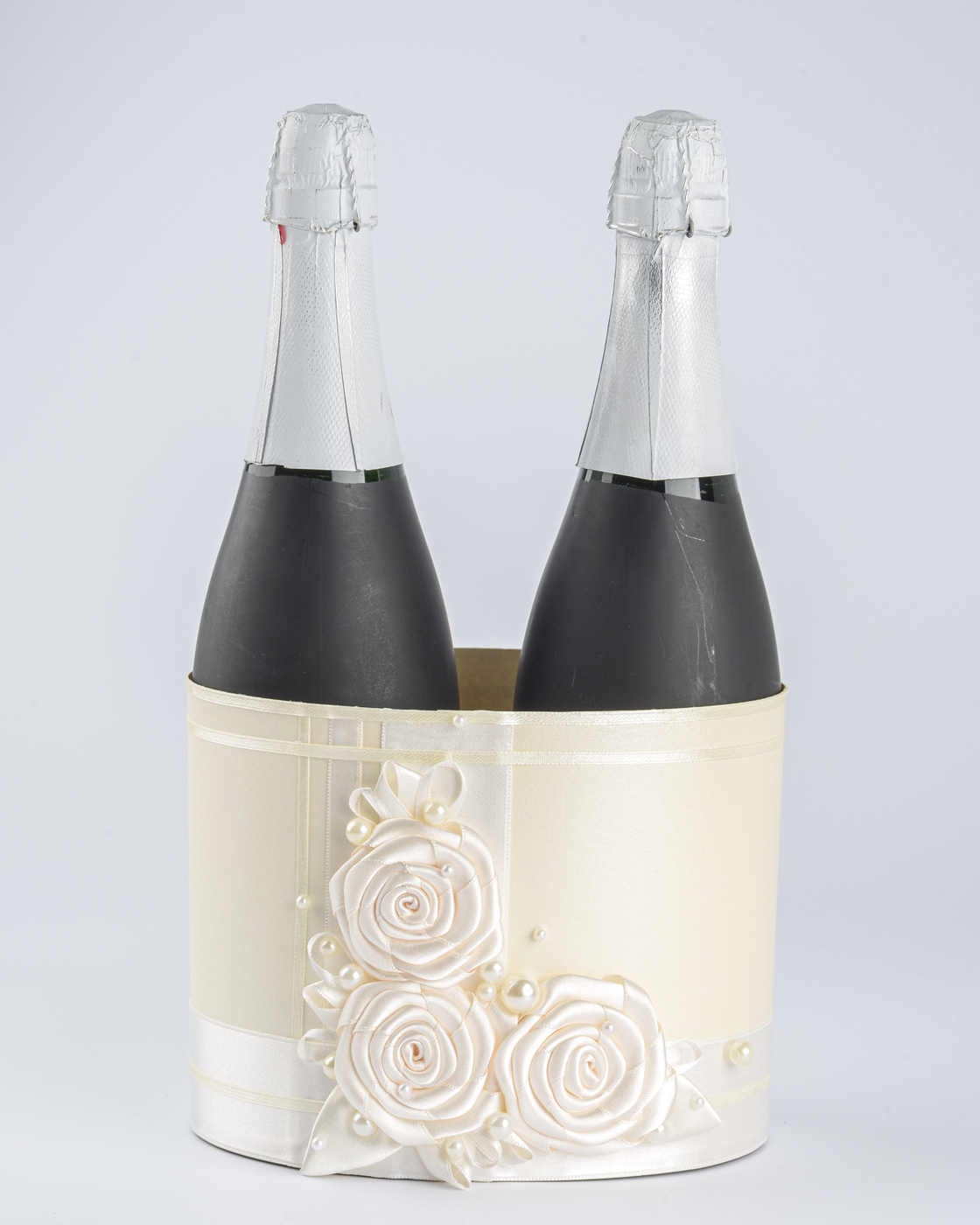 Украшение для свадебного шампанского "Портофино" в виде тубуса для двух бутылок с атласными розами айвори и жемчужными бусинами
