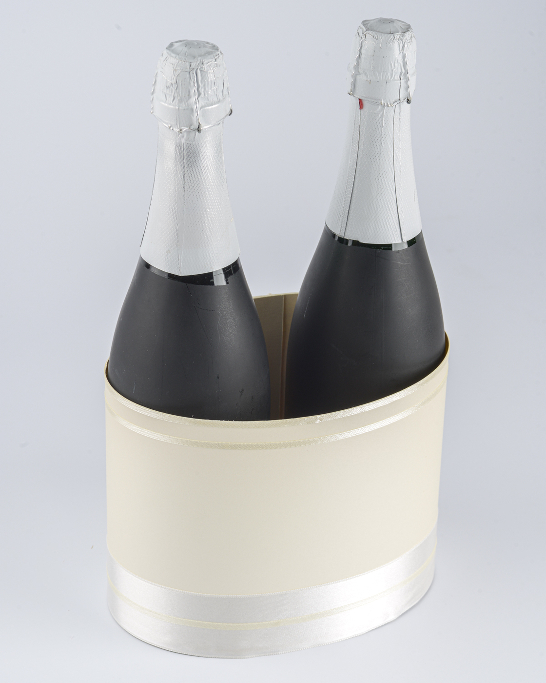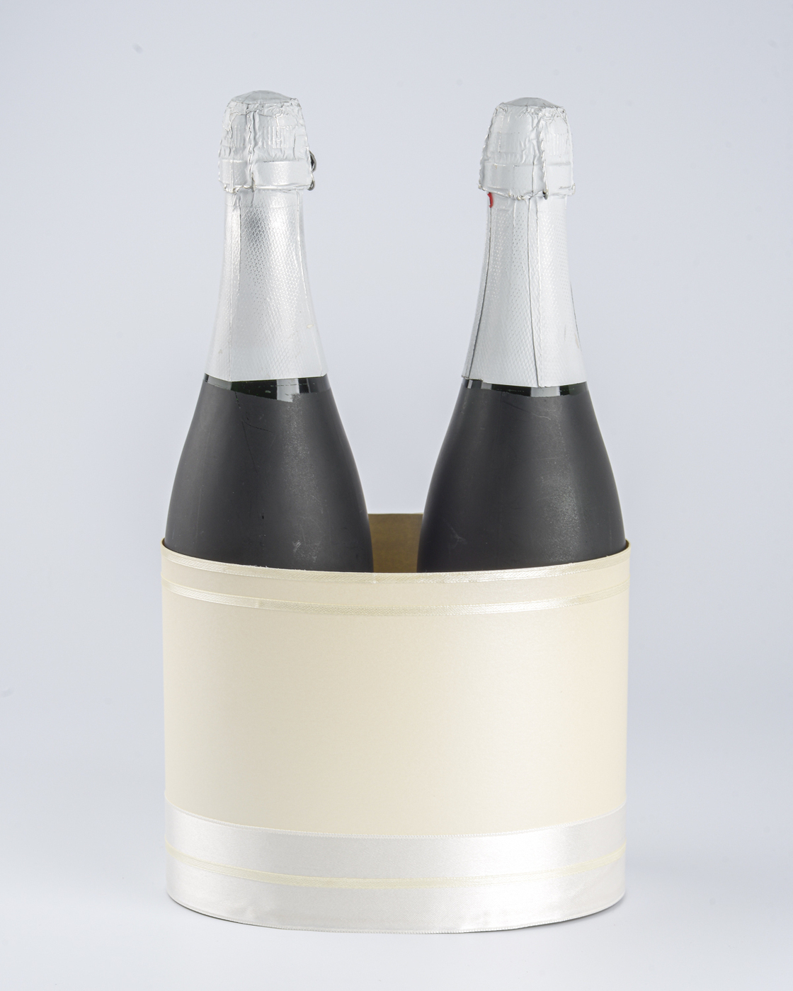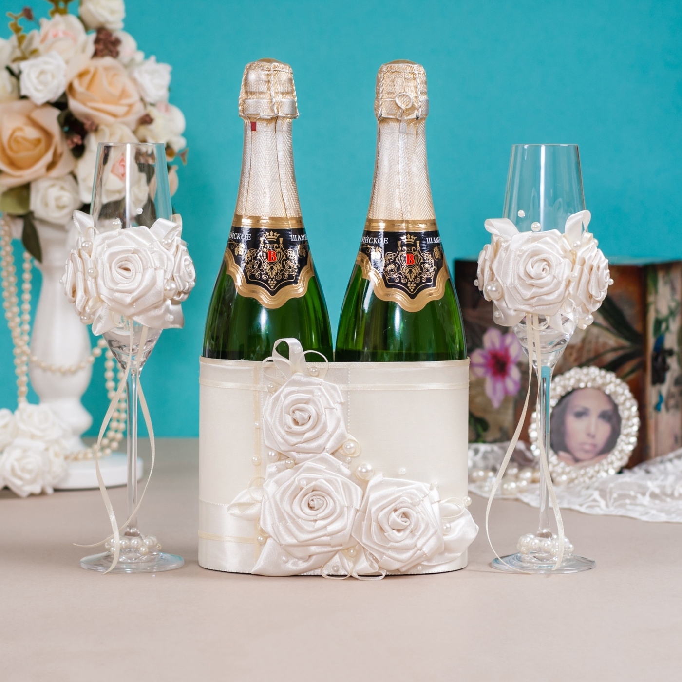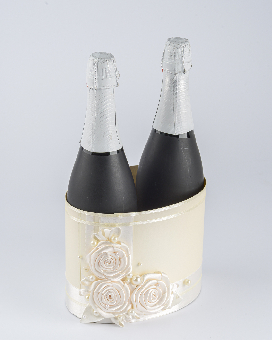 Украшение для свадебного шампанского "Портофино" в виде тубуса для двух бутылок с атласными розами айвори и жемчужными бусинами