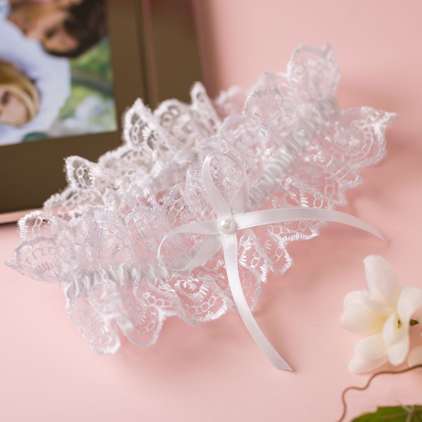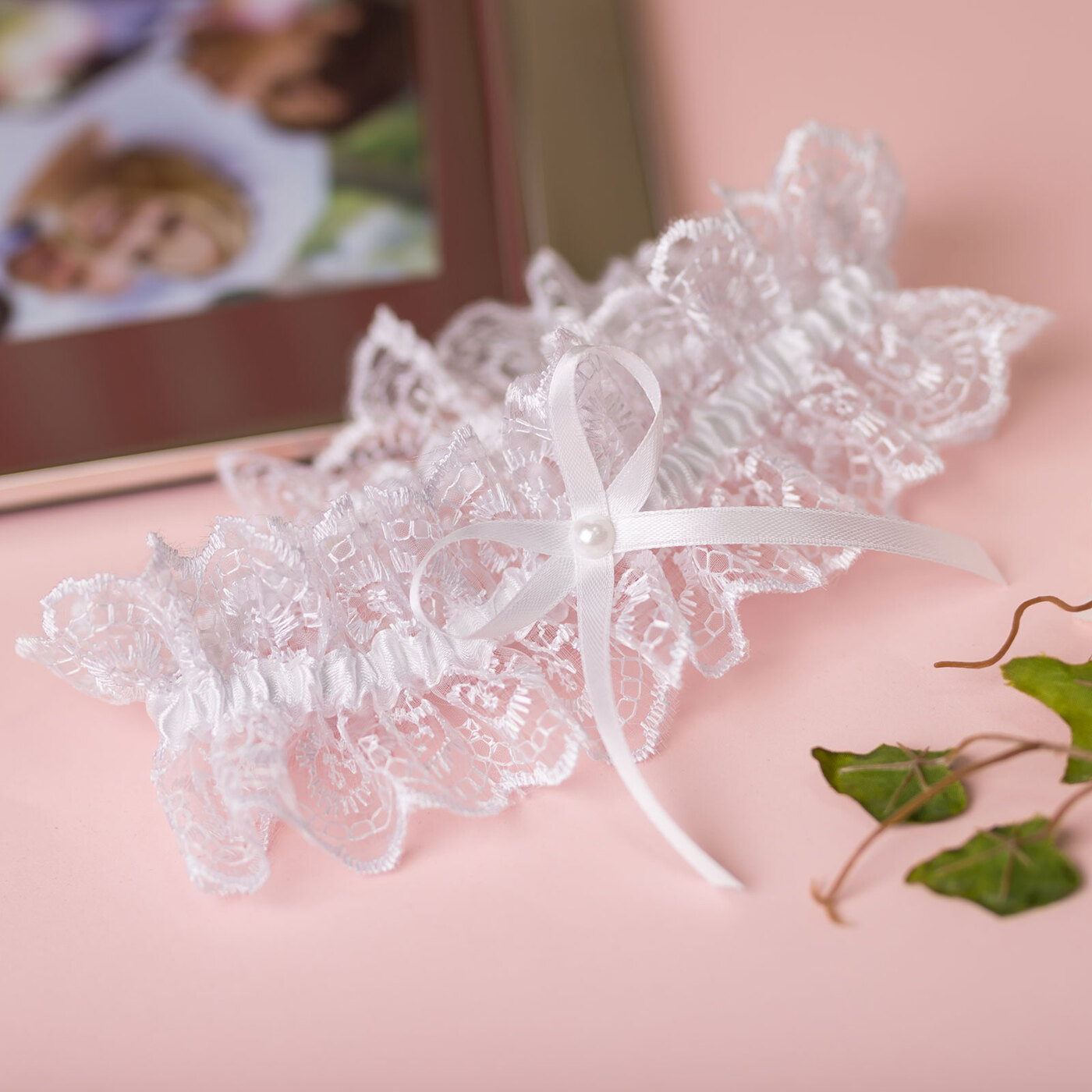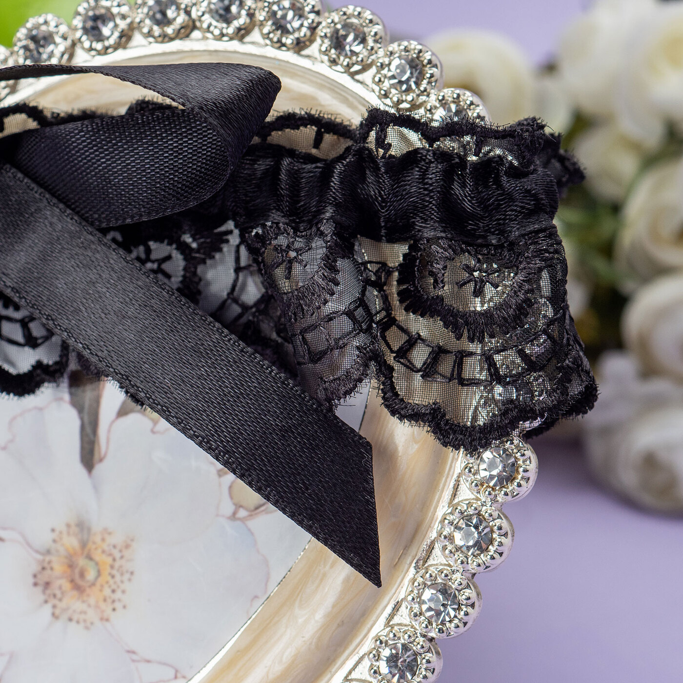 Дизайнерская подвязка для девушки на свадьбу, фотосессию и свидание из черного кружева с бантом из атласной ленты и темной бусиной