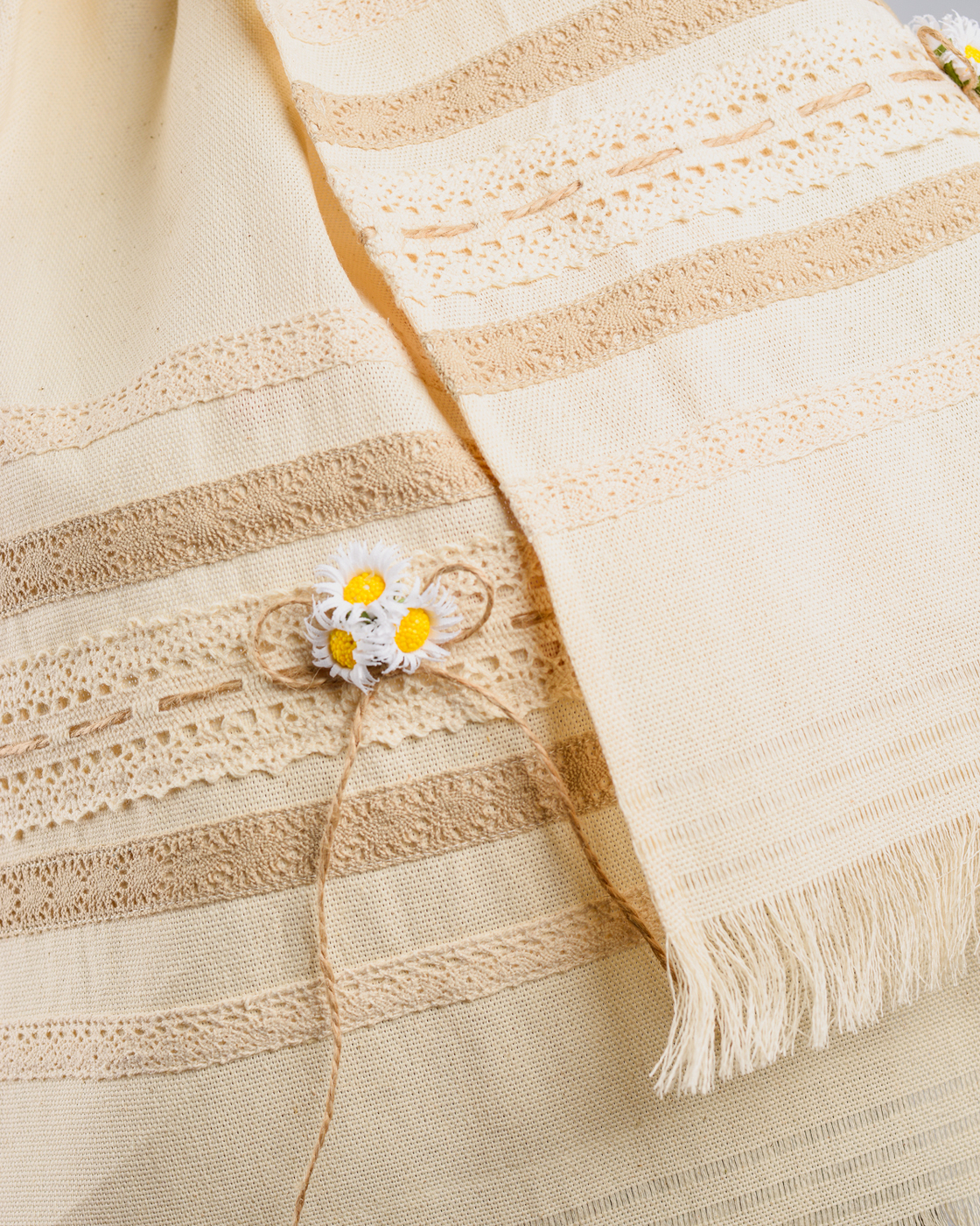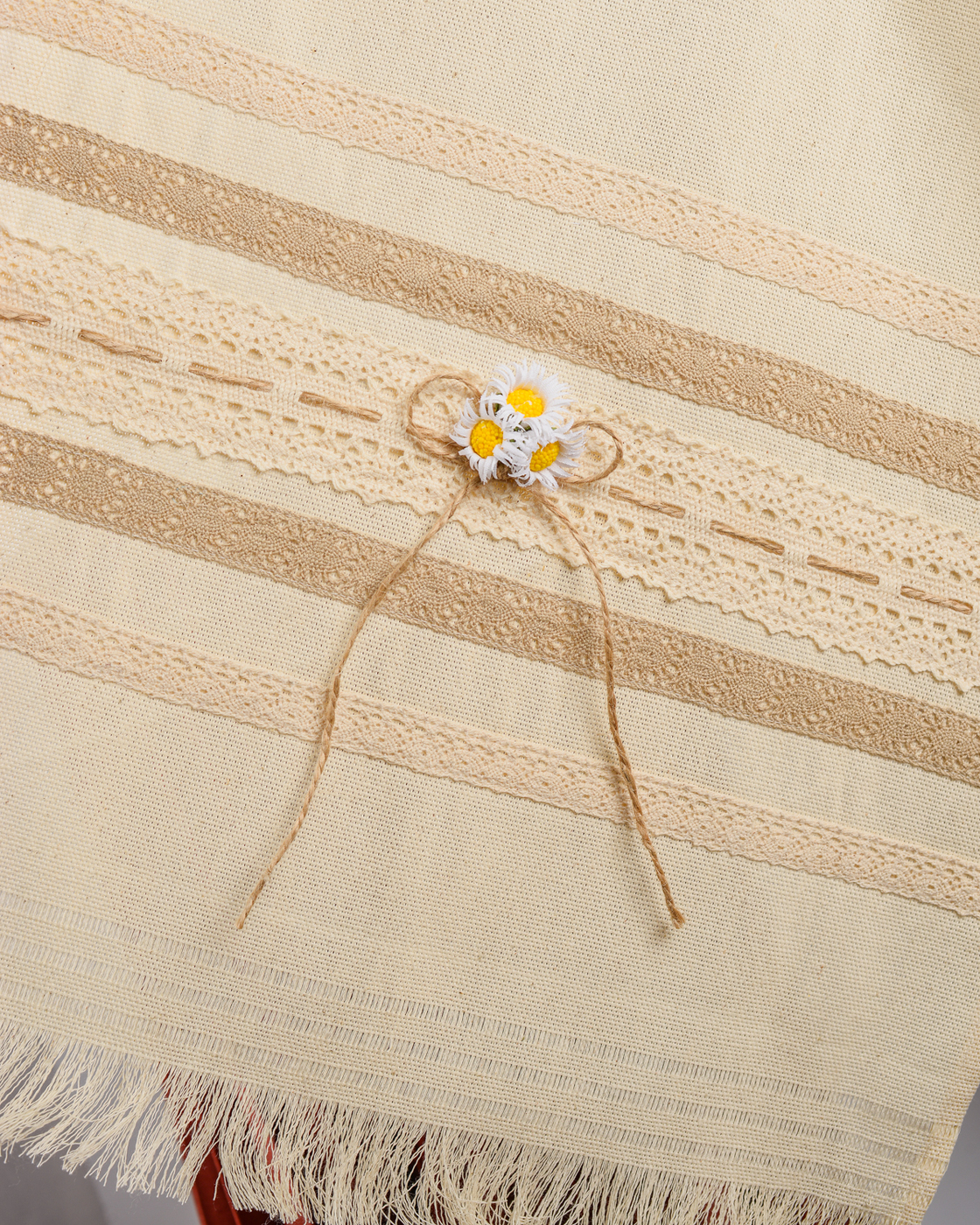 Свадебный рушник для молодоженов в эко-стиле "Рустикальная свадьба" из бежевого льна с вязаным кружевом, ромашками и тесьмой из бечевки