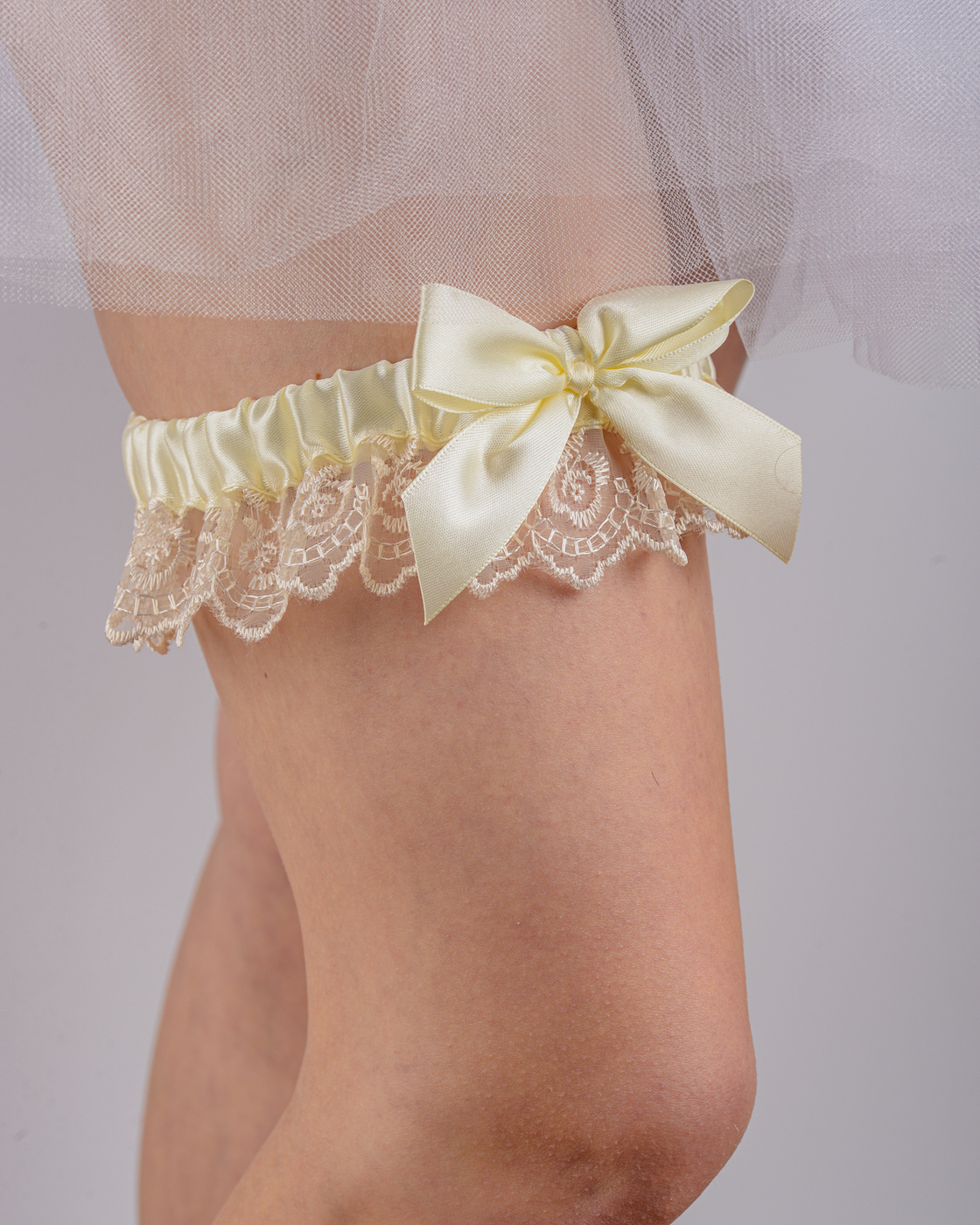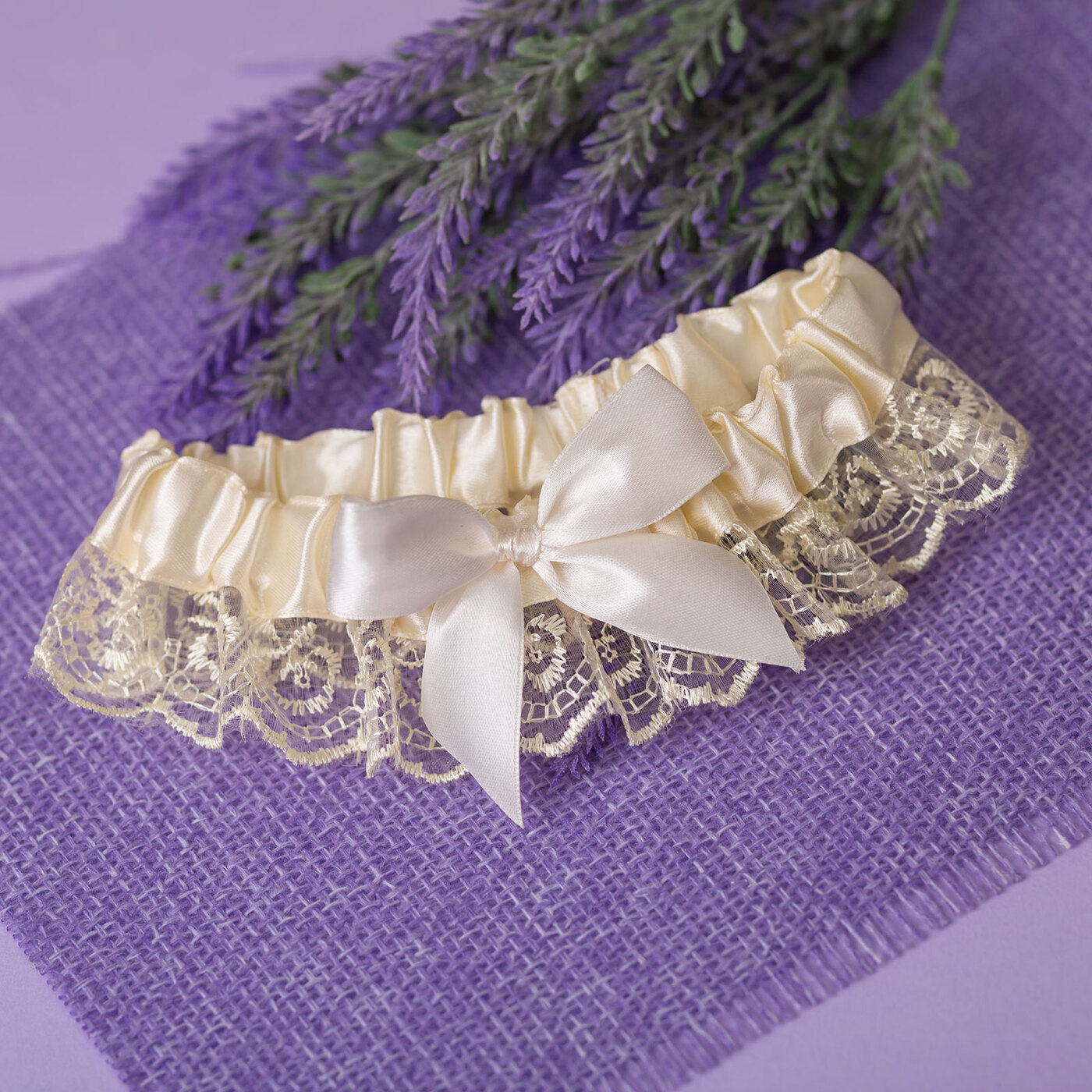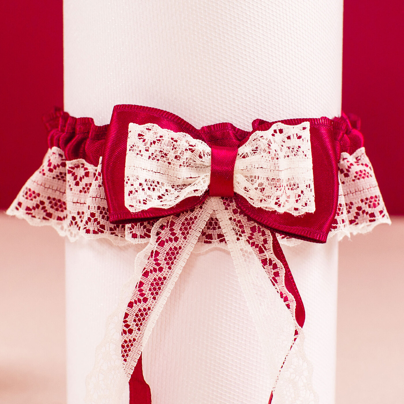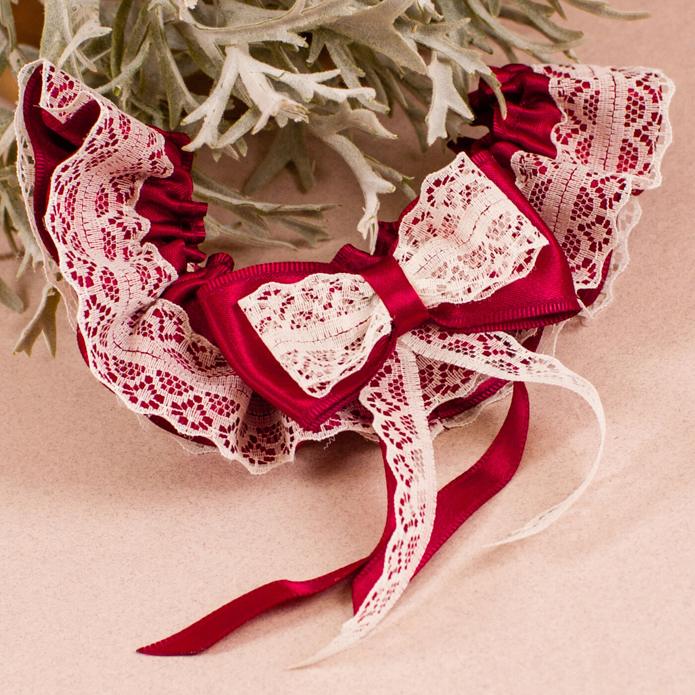 Свадебная подвязка для невесты "Марсала" из атласа винного цвета марсала с ажурным кружевом айвори и двойным бантом с лентами