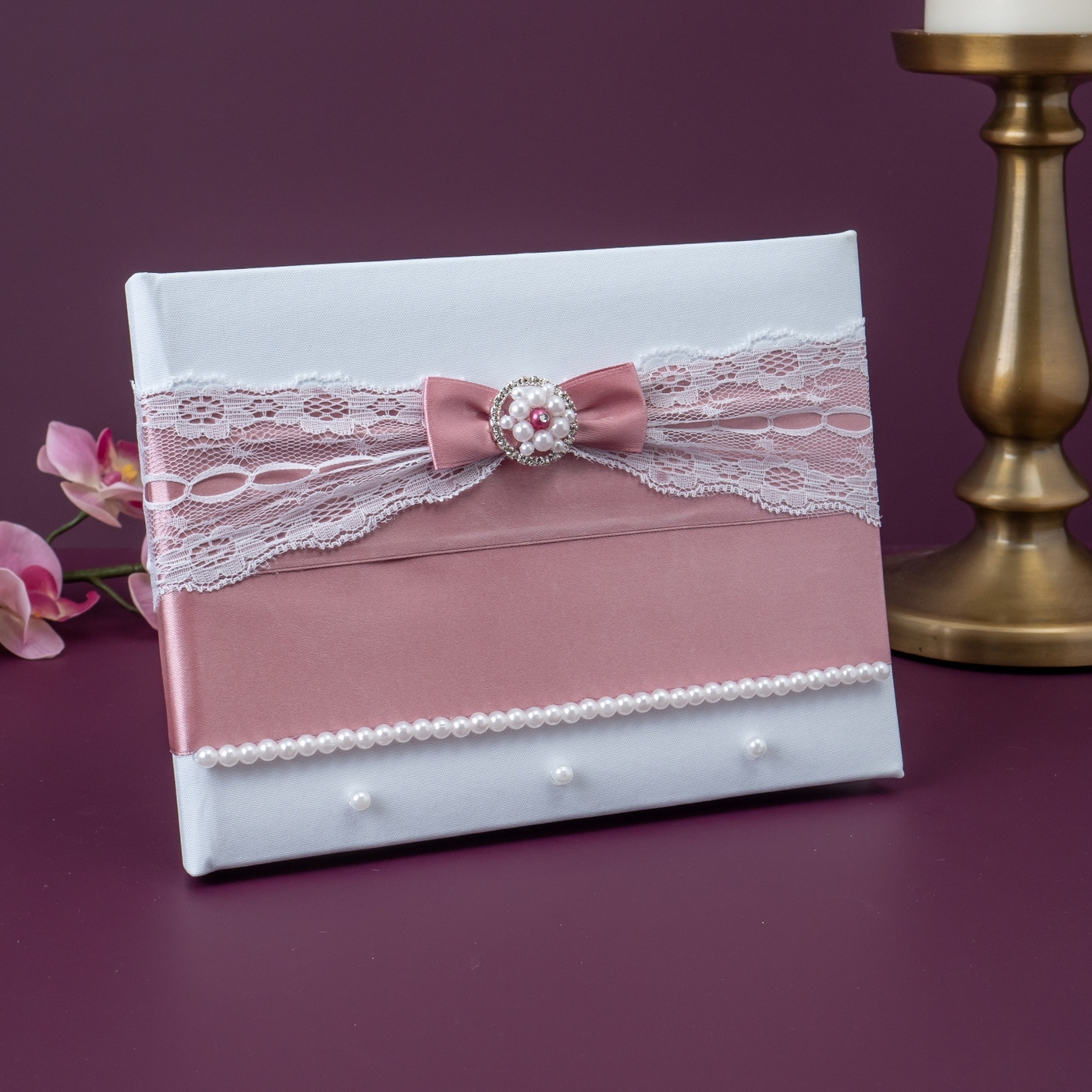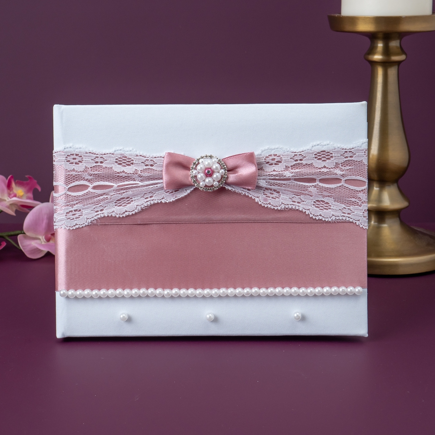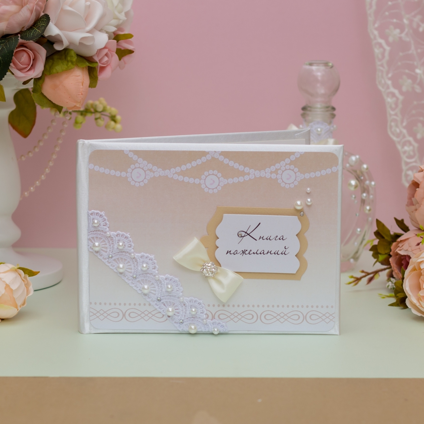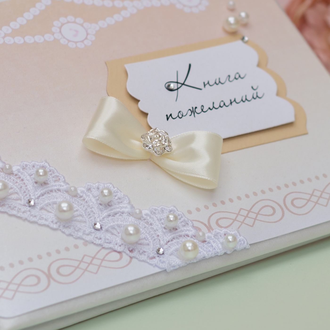Свадебная книга для записи поздравлений молодоженам "Жемчужная фантазия" с кружевным декором, перламутровыми бусинами и атласным бантиком