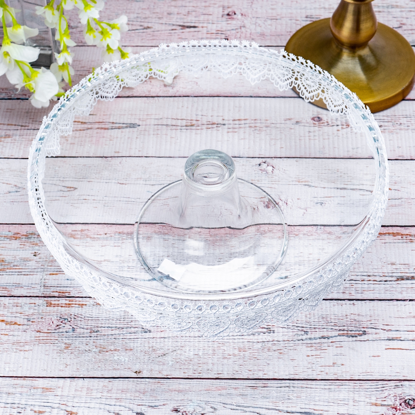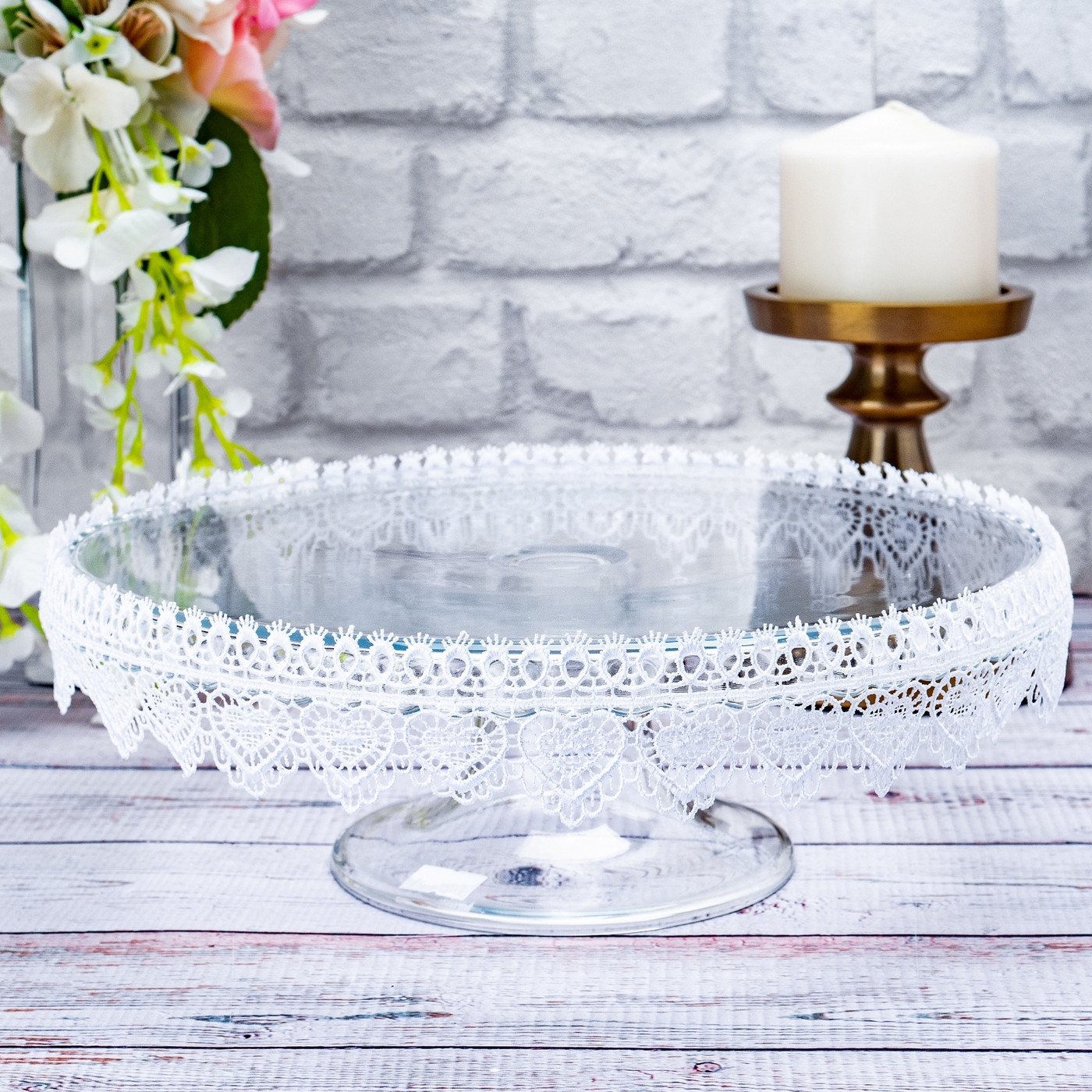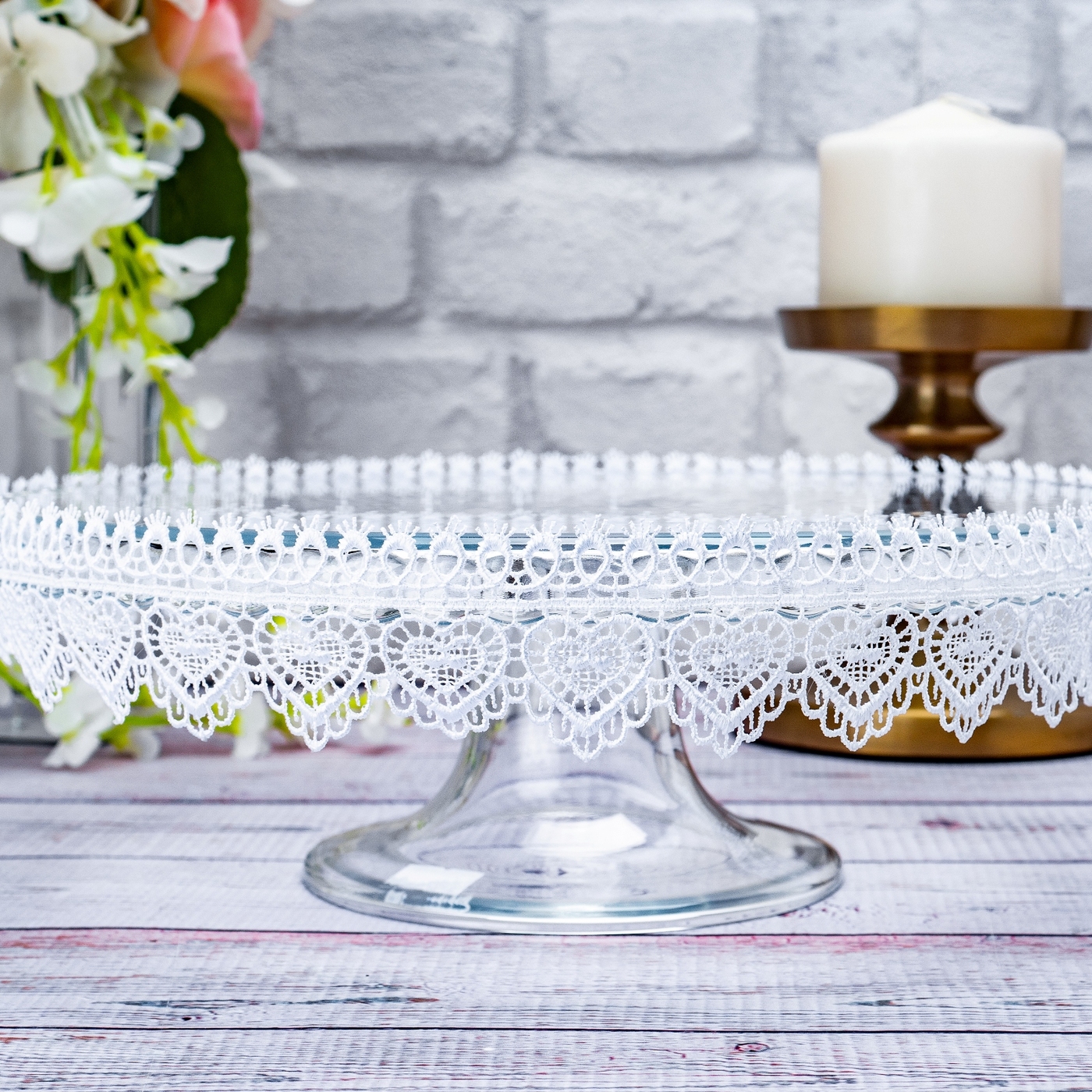Стеклянная подставка под свадебный торт молодоженов и для пирожных candy bar на широкой ножке, с белым кружевом ручной работы
