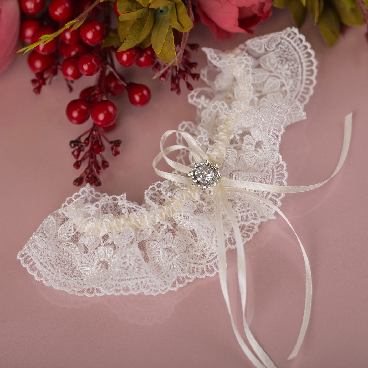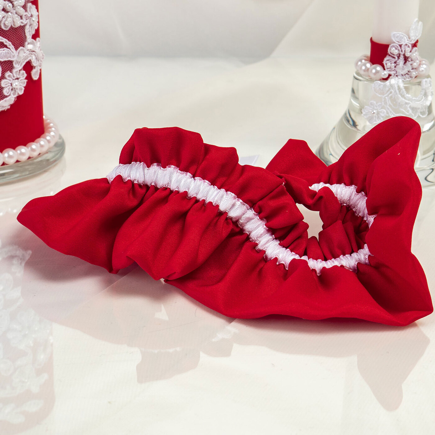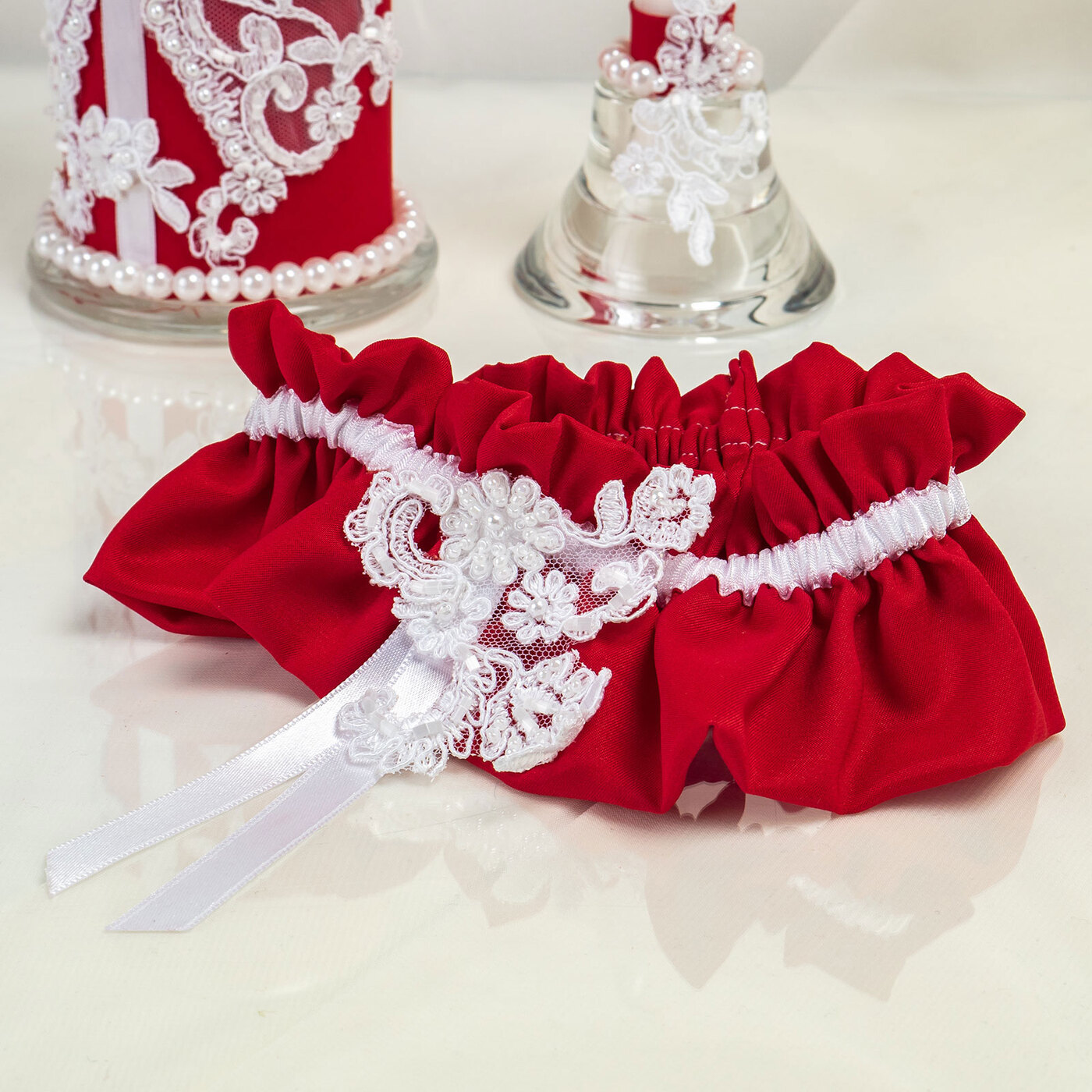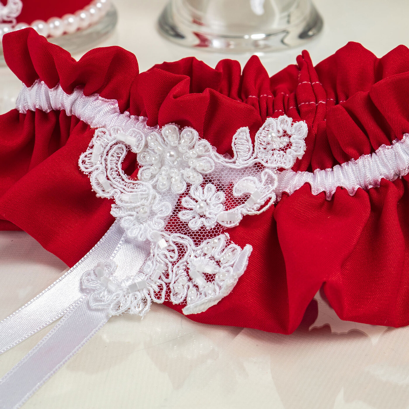 Широкая свадебная подвязка невесты "Аврора" из красного шелка с белой тесьмой, с кружевом с цветочными узорами и бисером
