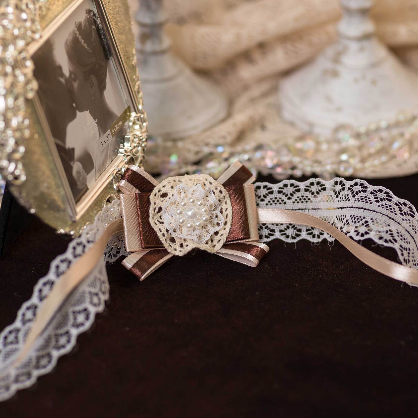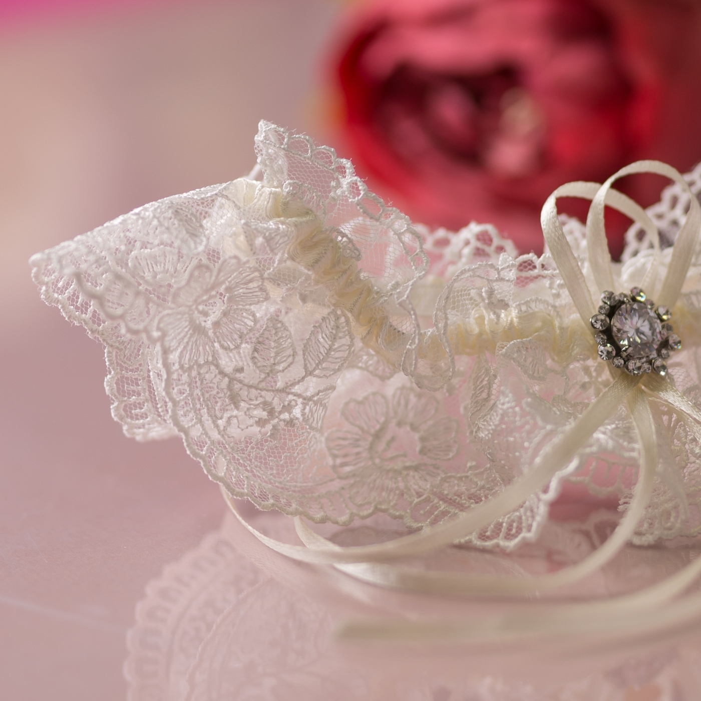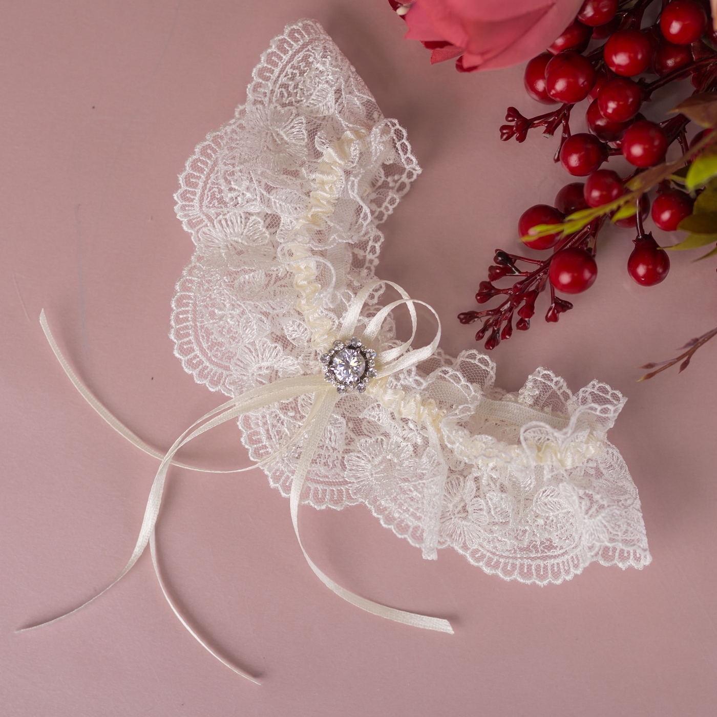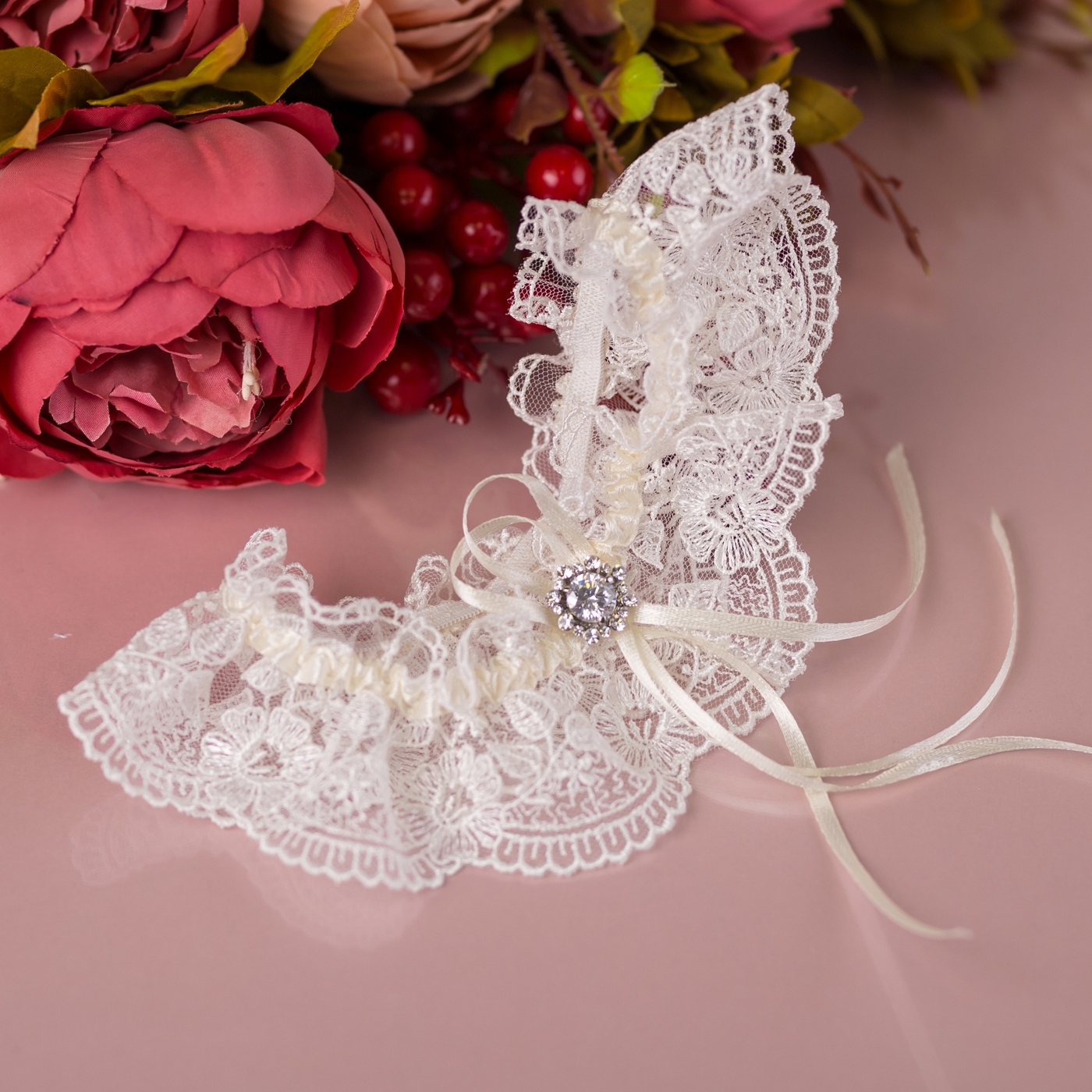 Широкая свадебная подвязка невесты "Аврора" из красного шелка с белой тесьмой, с кружевом с цветочными узорами и бисером