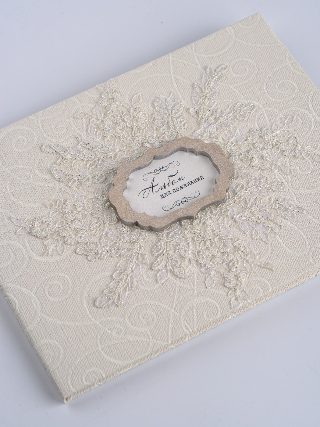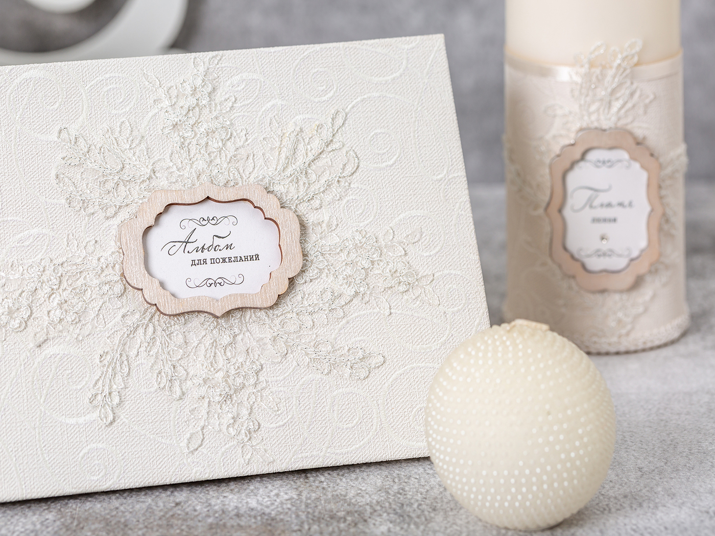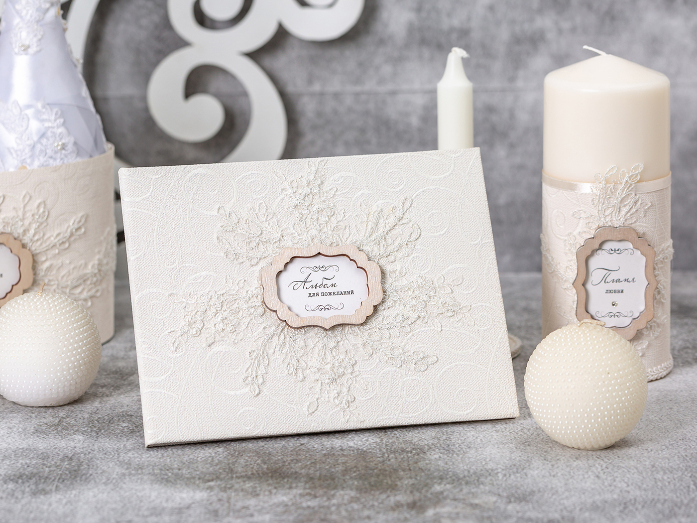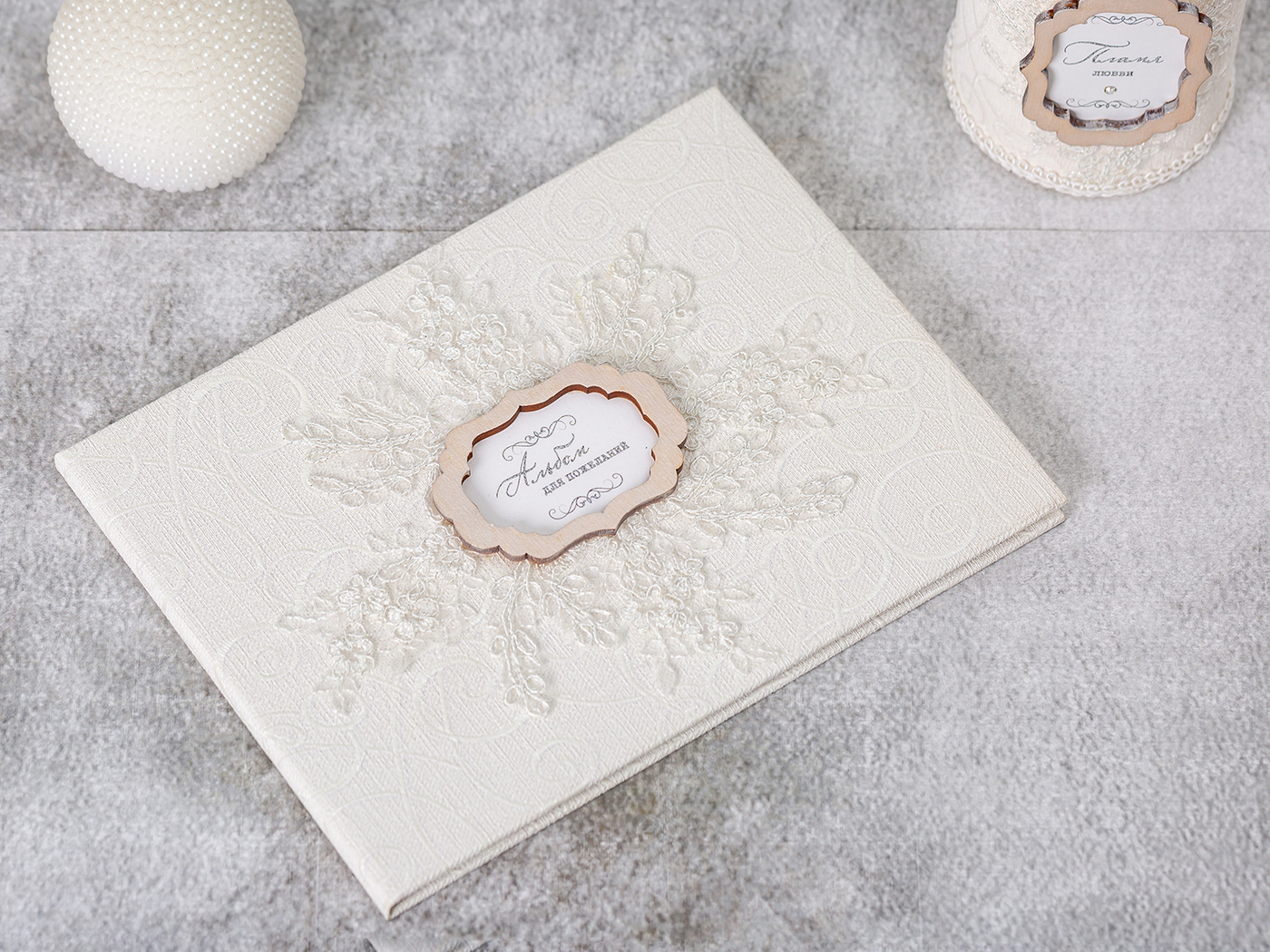 Альбом для пожеланий молодоженам на свадьбу "Мелодия любви" с фактурной обложкой айвори, белым кружевом и деревянной фигурной рамкой