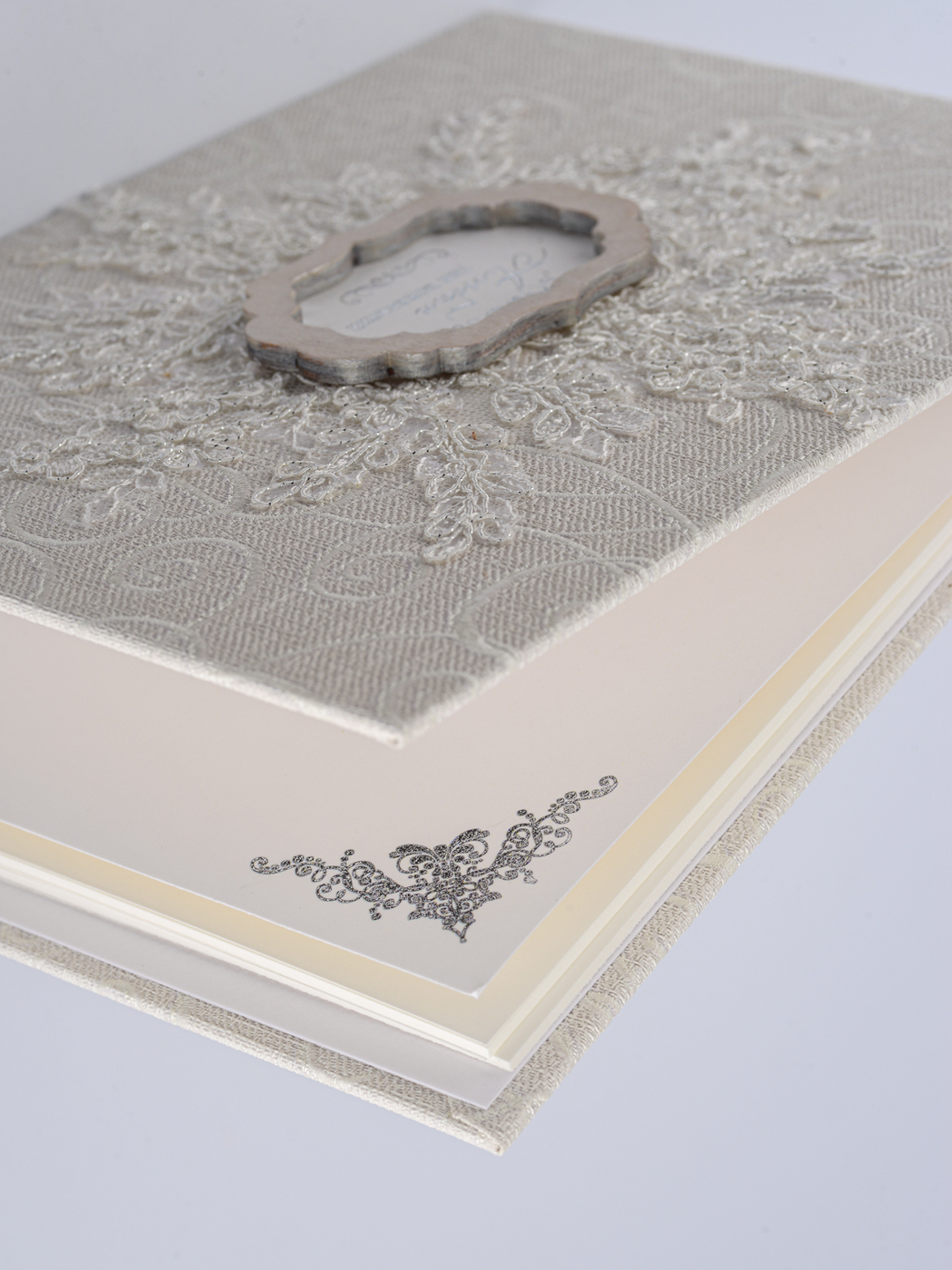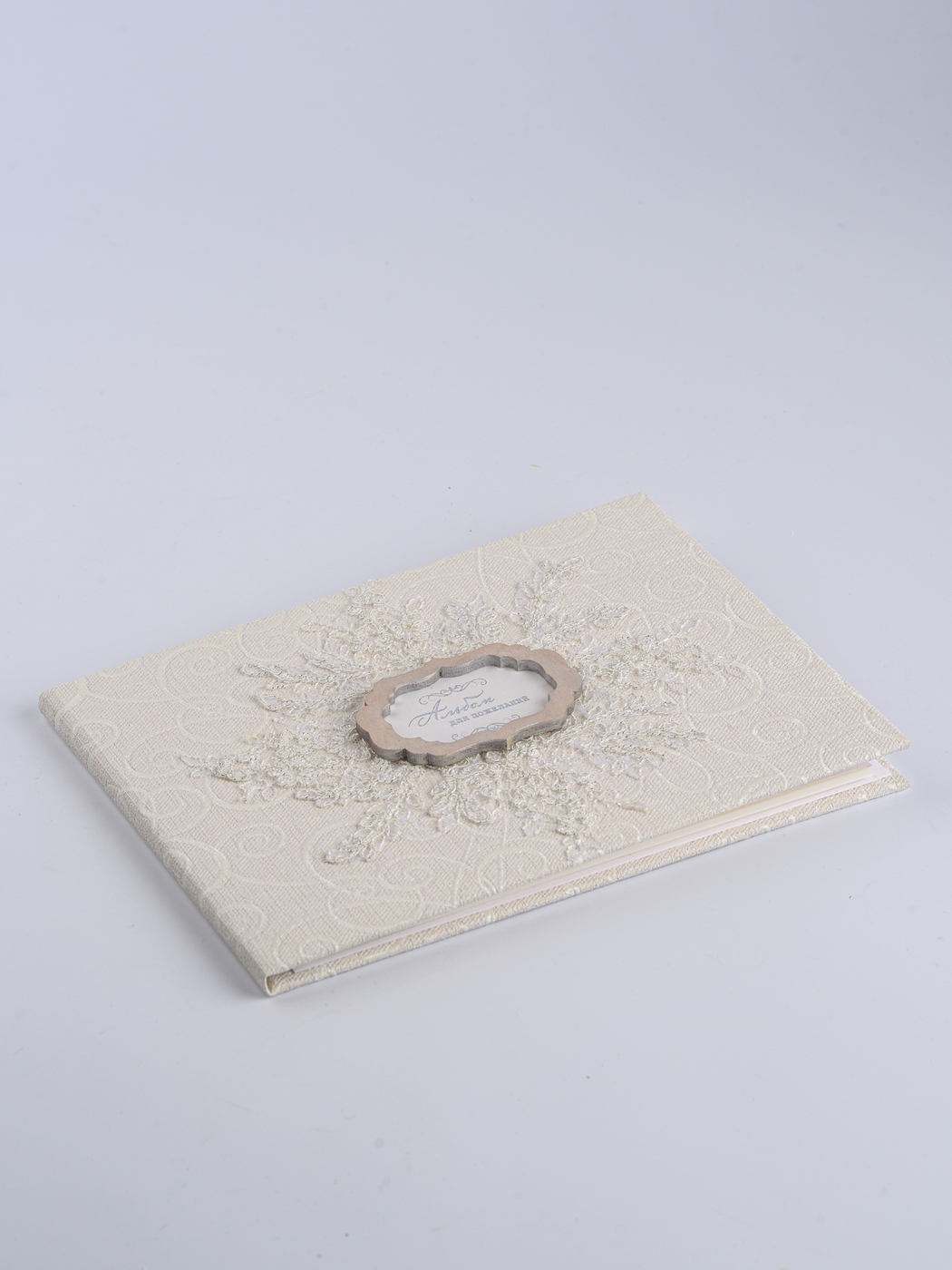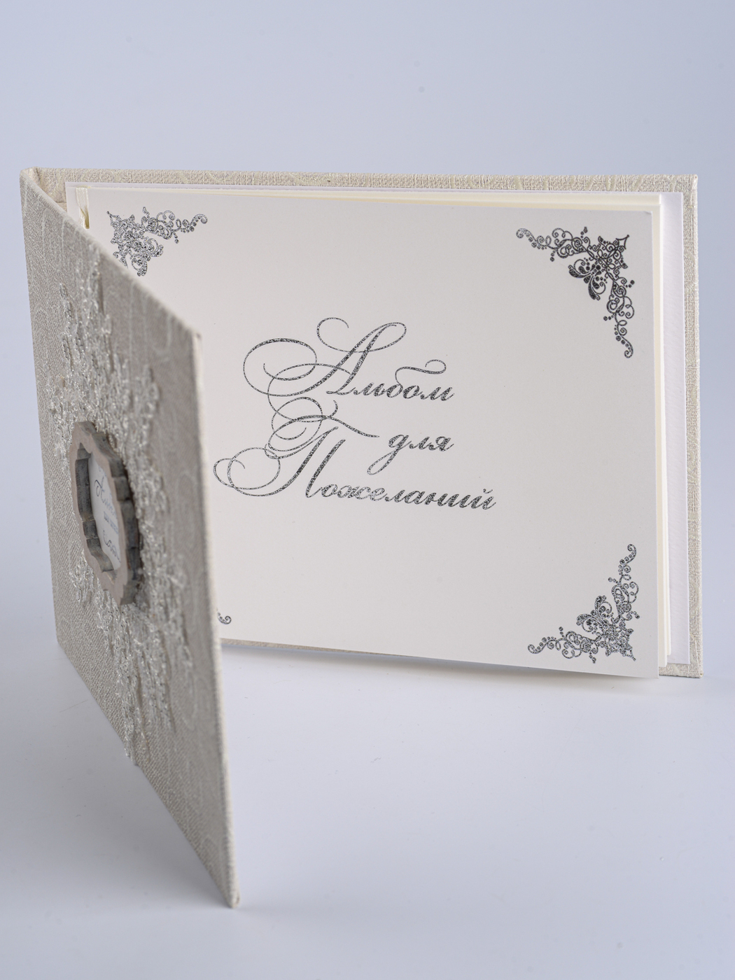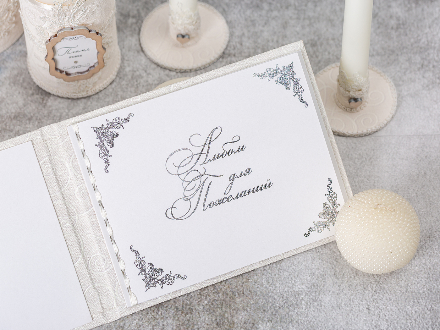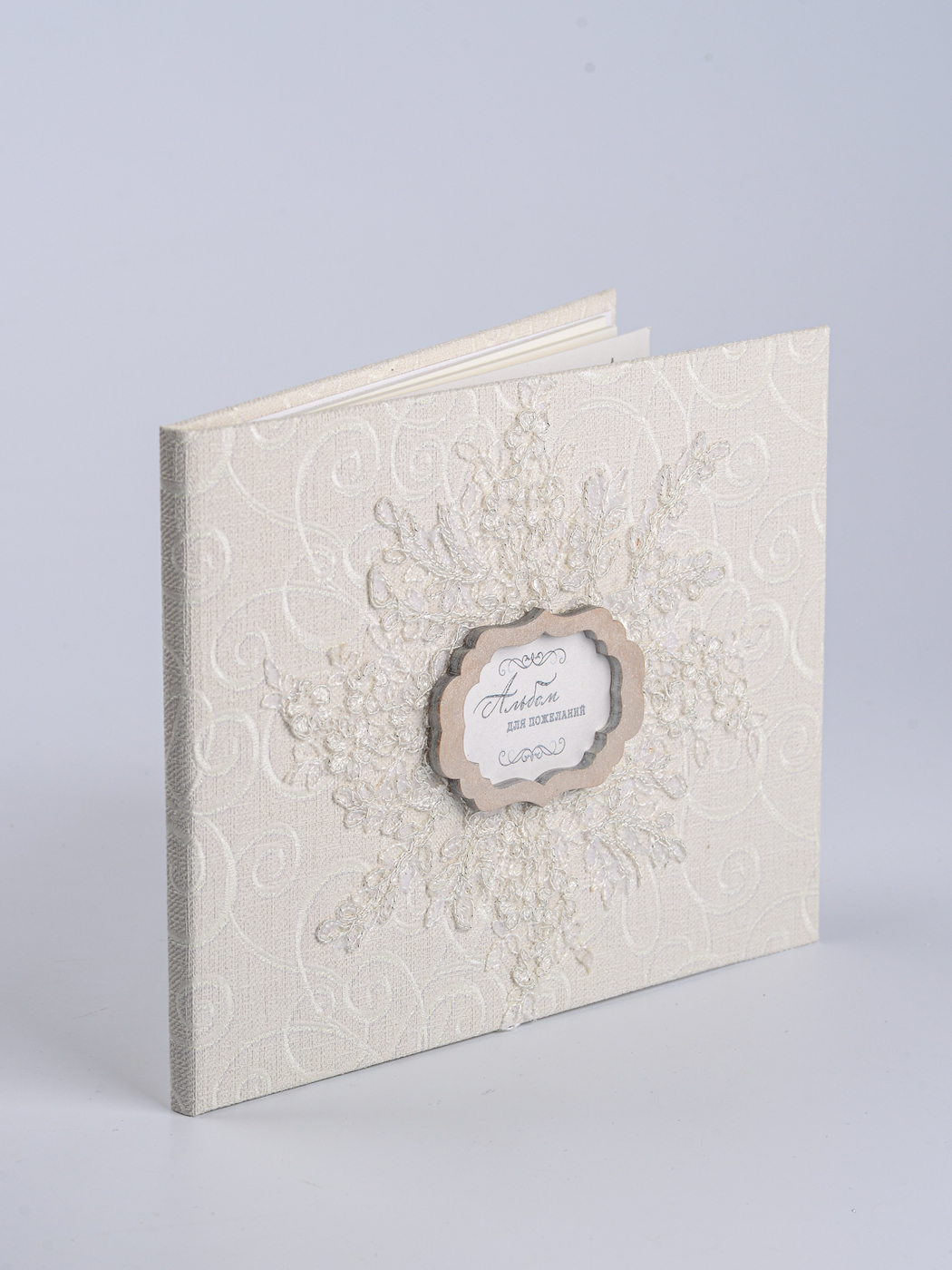 Альбом для пожеланий молодоженам на свадьбу "Мелодия любви" с фактурной обложкой айвори, белым кружевом и деревянной фигурной рамкой