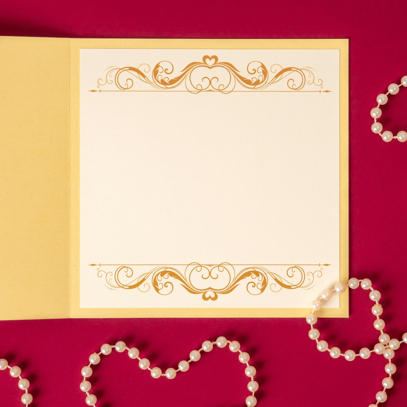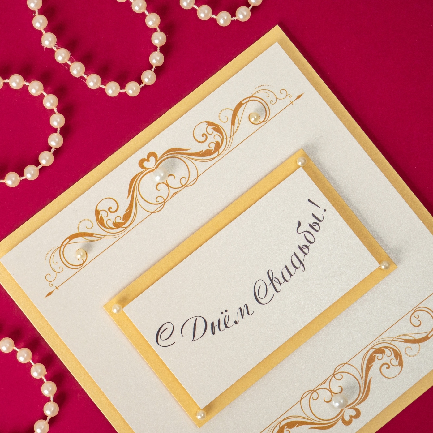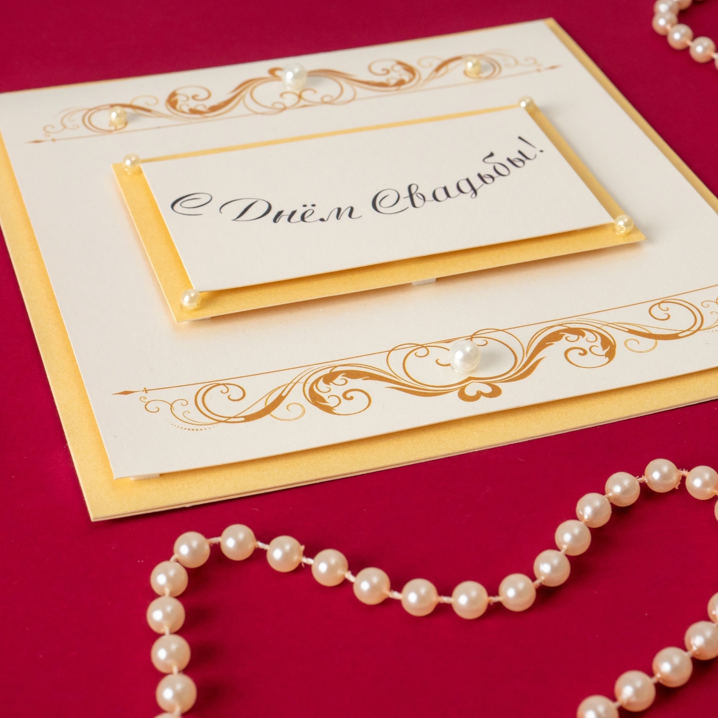 Стильная открытка "С днем свадьбы" из коллекции "Сказки Востока" в желтых тонах с золотыми вензелями, жемчужными бусинами и надписью
