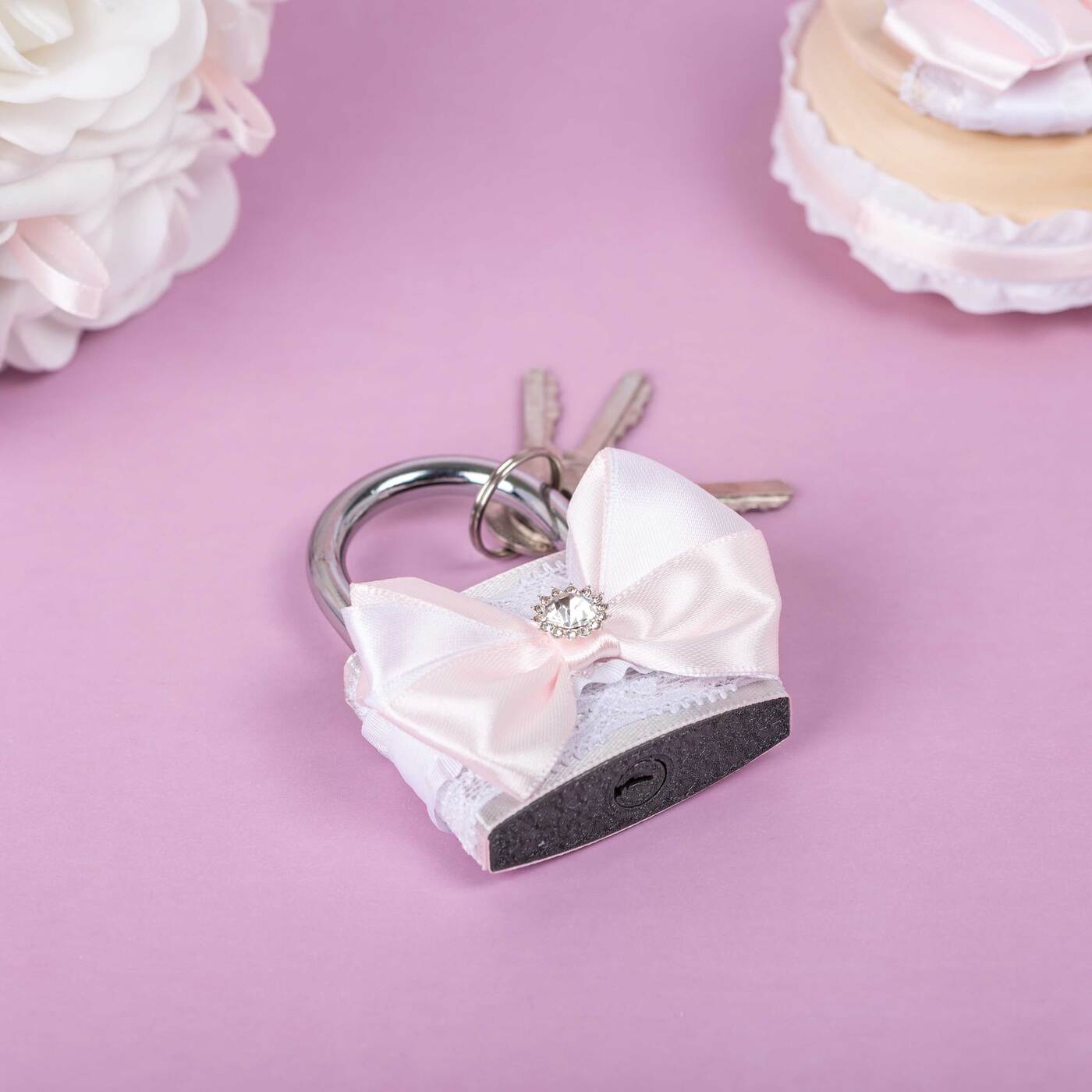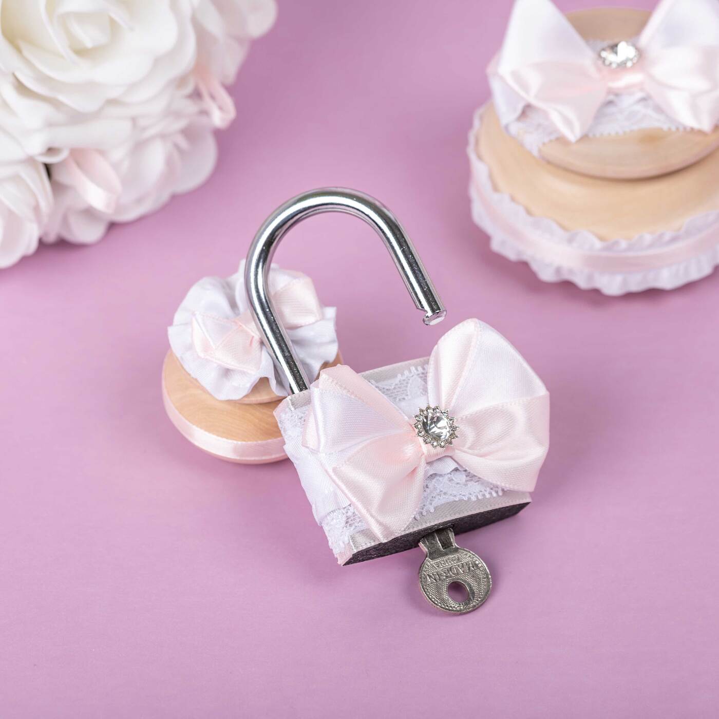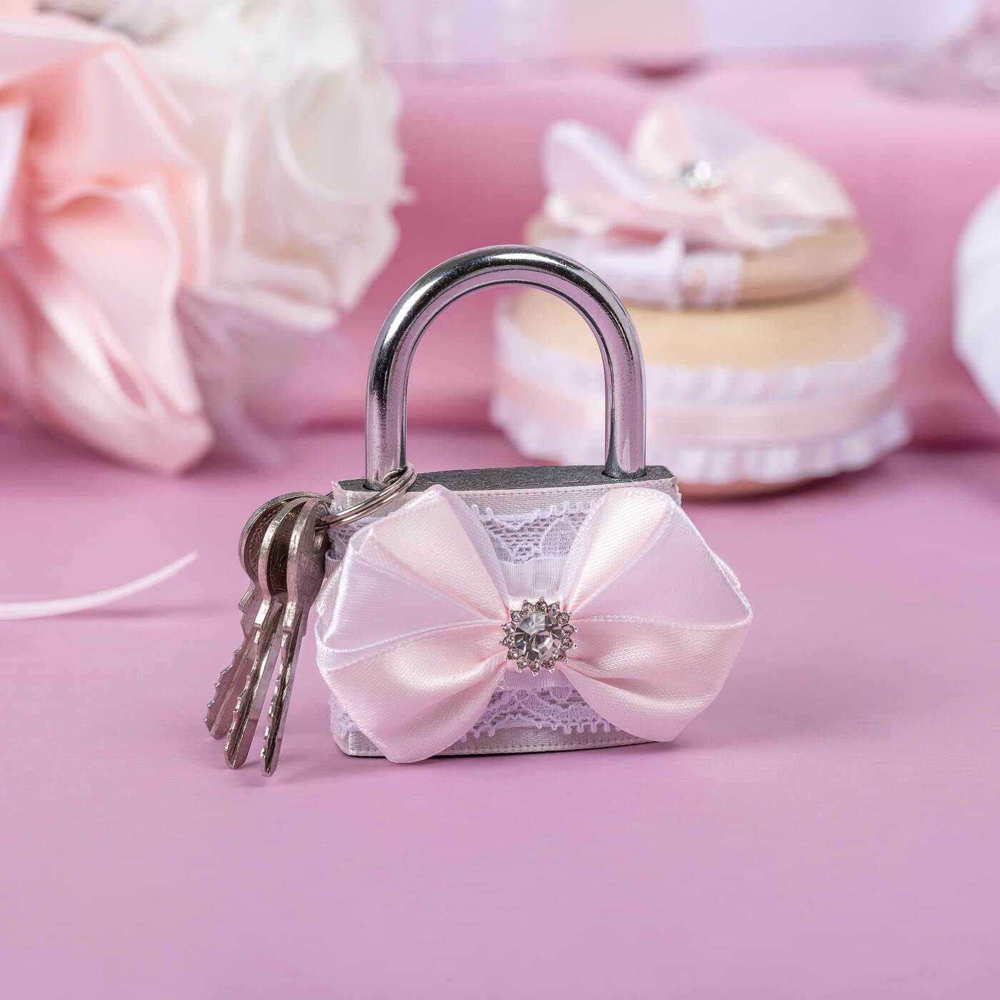 Свадебный замочек любви для молодоженов "Нежность" с розовым бантом из атласа, белым кружевом и сверкающей брошью из крупного кристалла