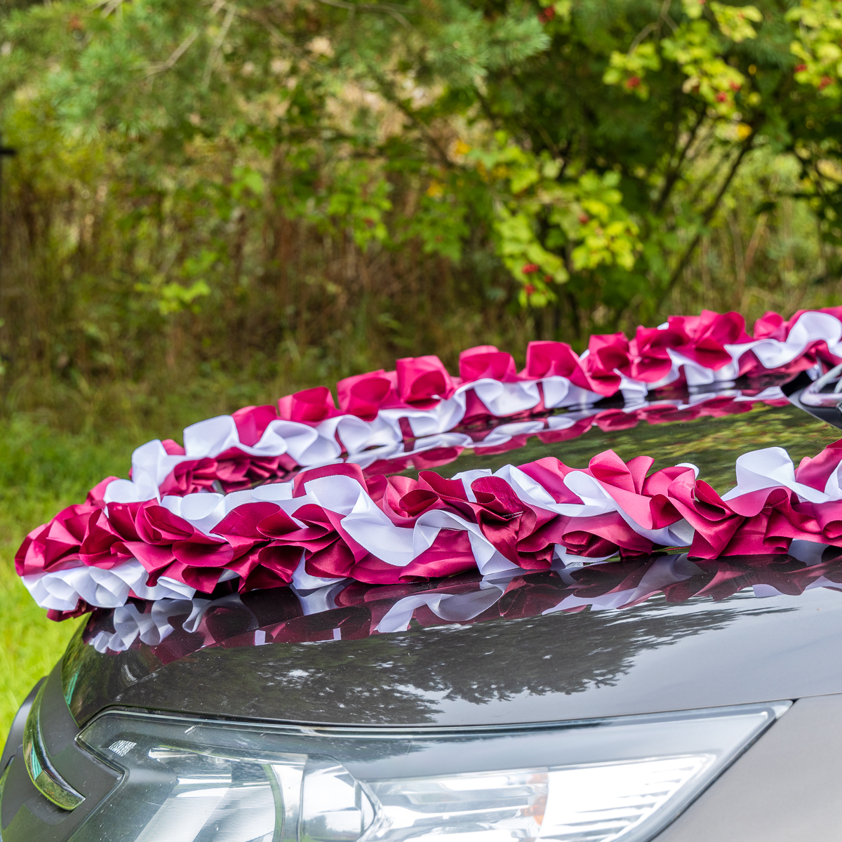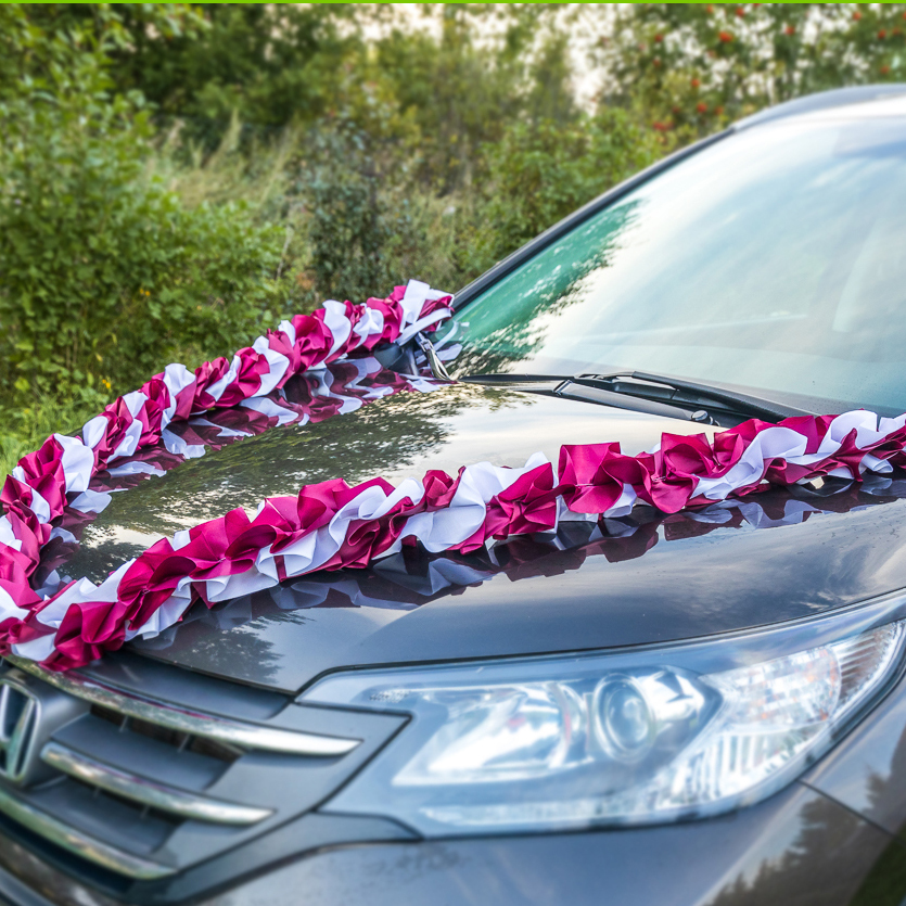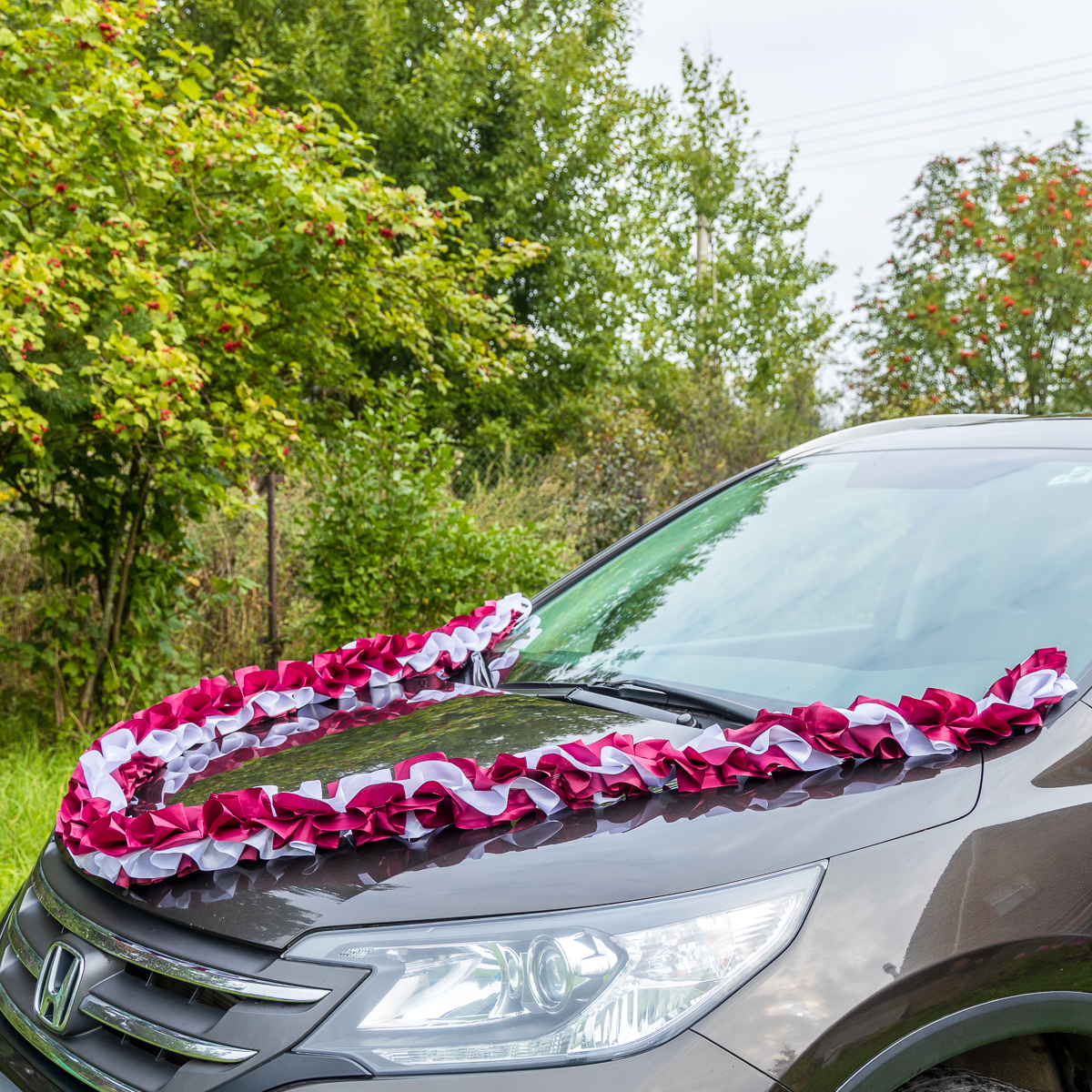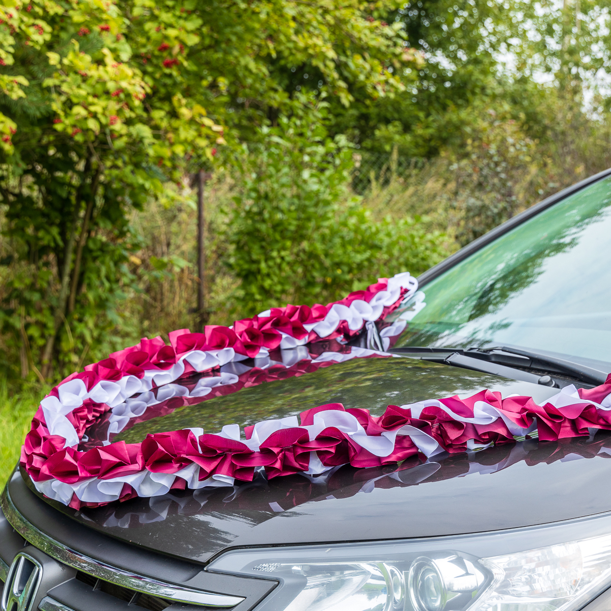 Двухцветная лента - рюш из атласной ленты на капот свадебной машины, белая и ярко-розовая, 3 метра