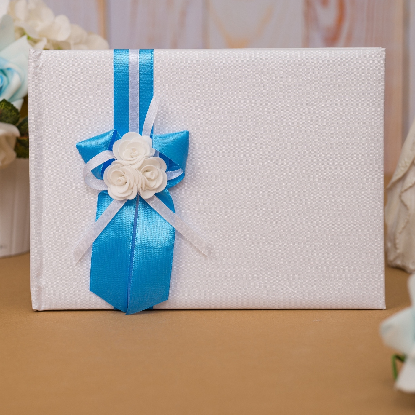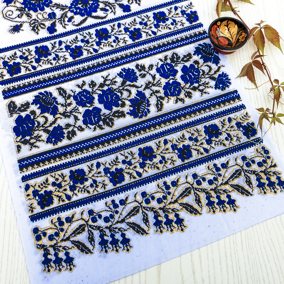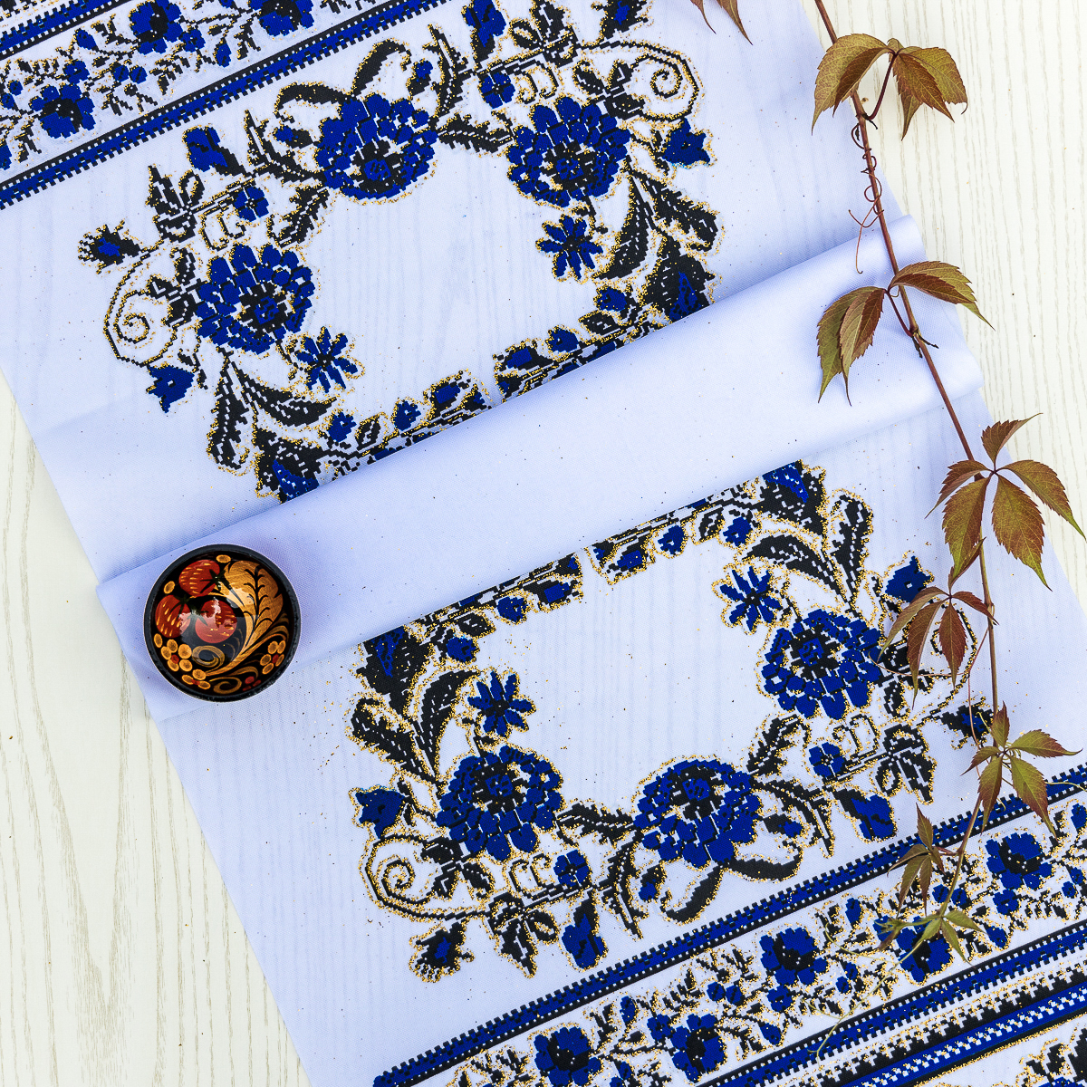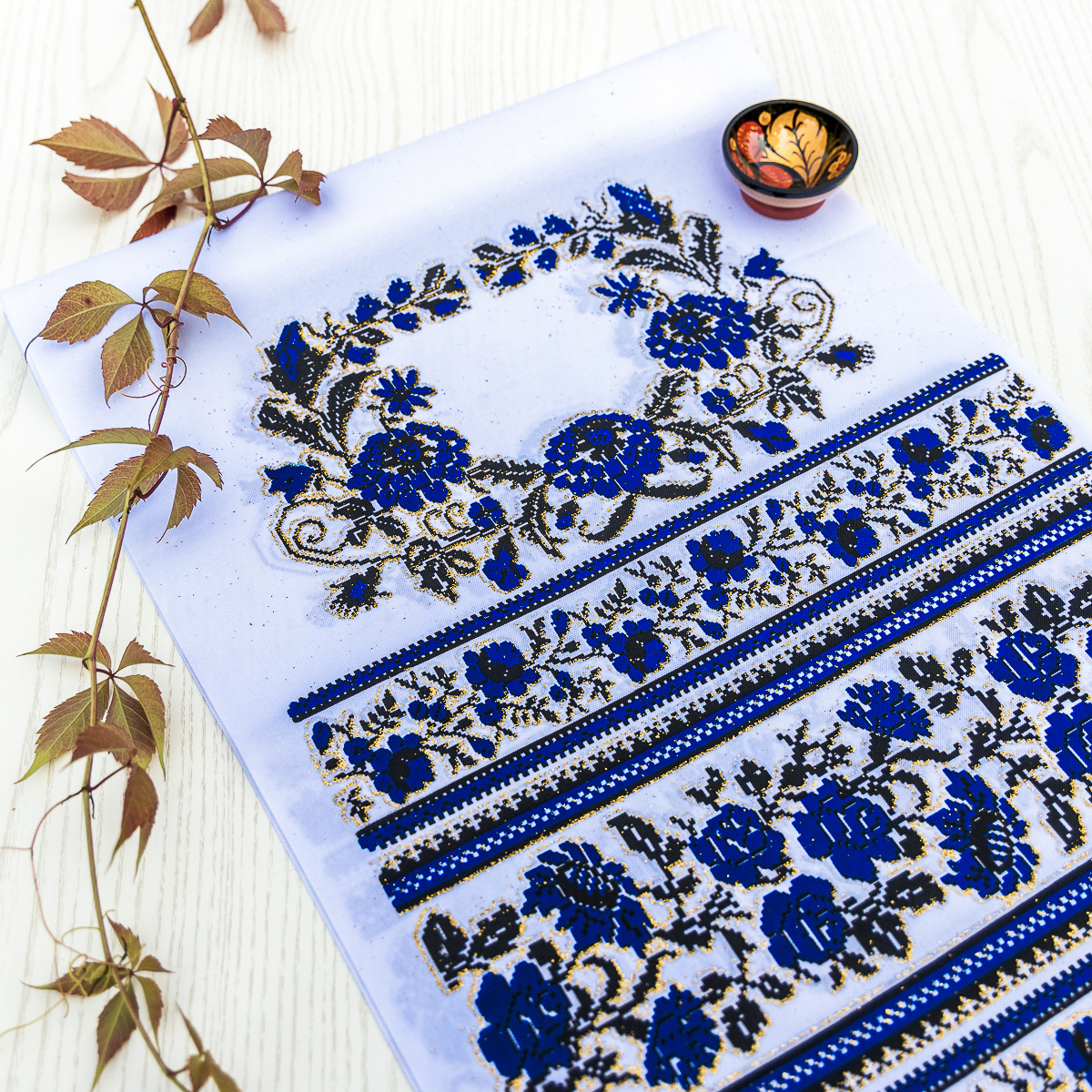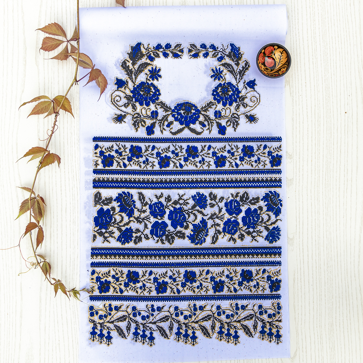 Свадебный рушник в славянском стиле на венчание молодоженов и для каравая с растительным орнаментом в синей и белой палитре