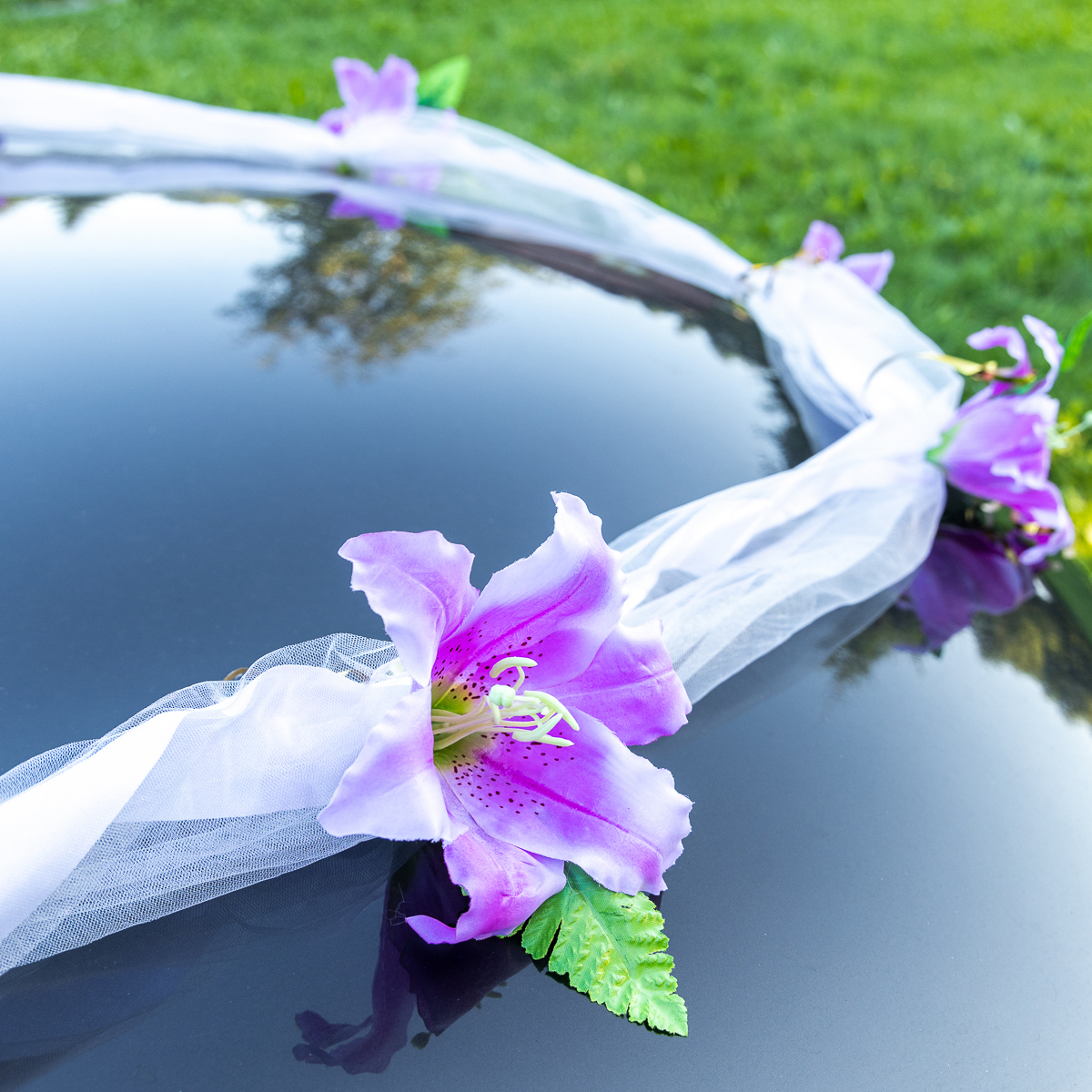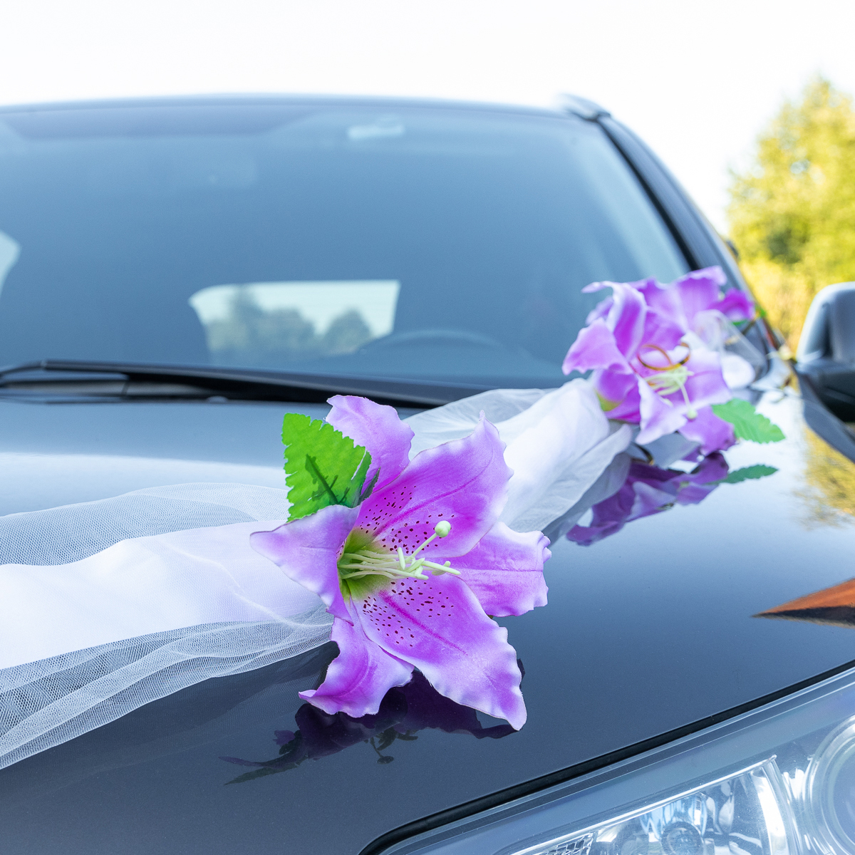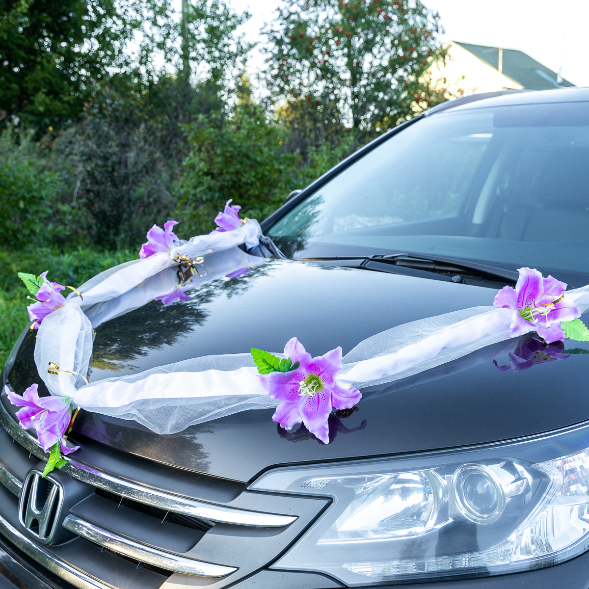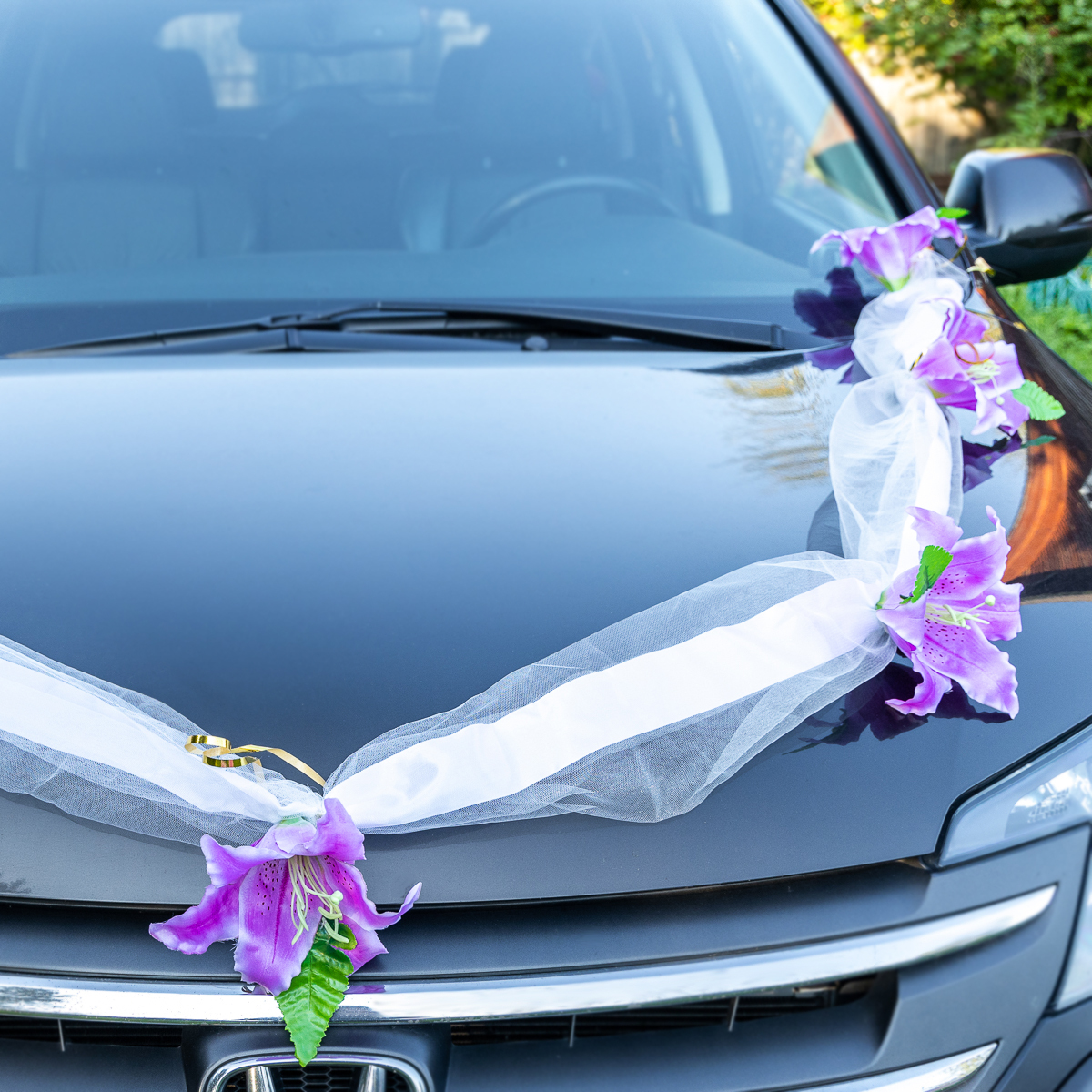 Фатиновая лента с цветами "Нежные лилии" на капот свадебного авто, с тканевыми цветами фиолетового цвета и зелеными листочками