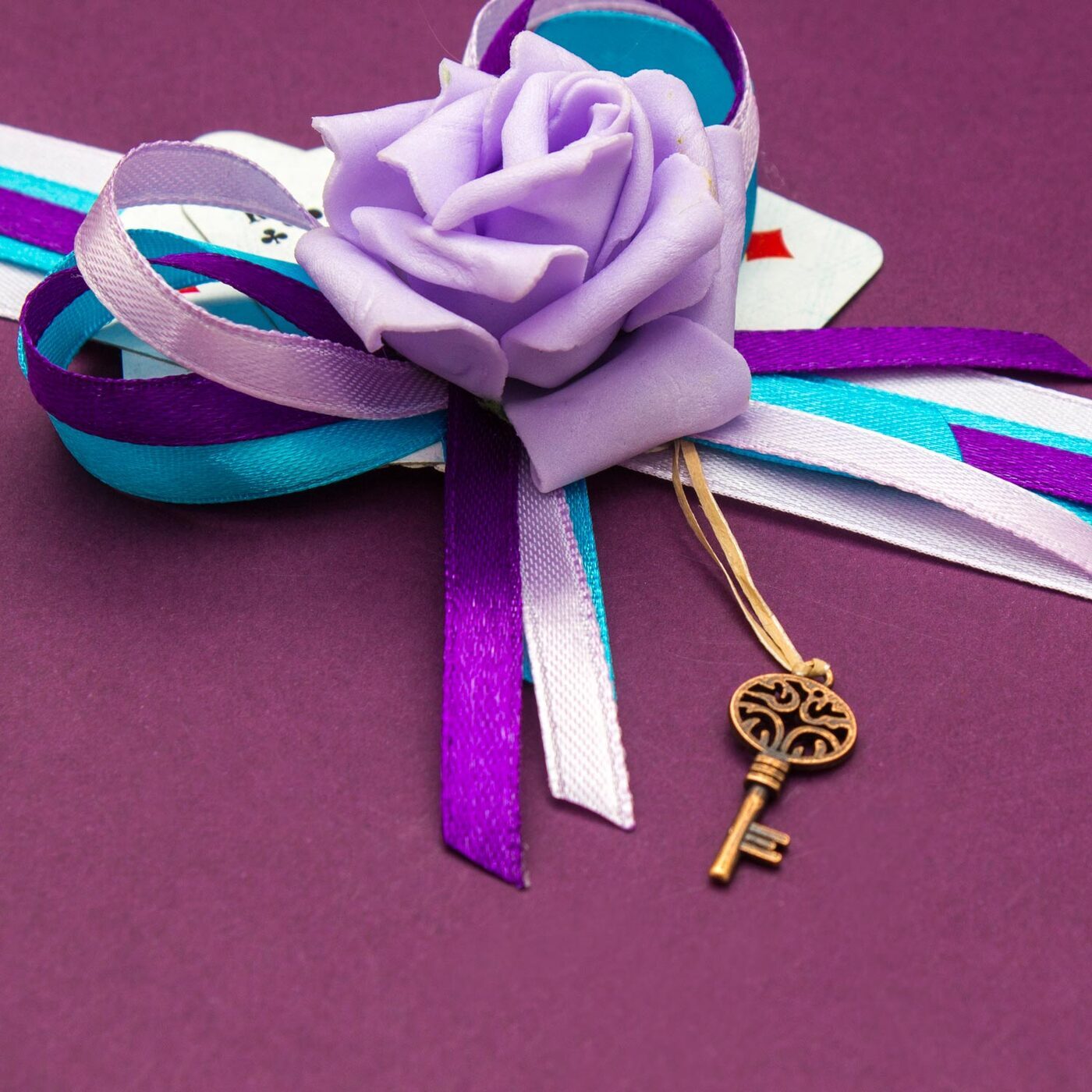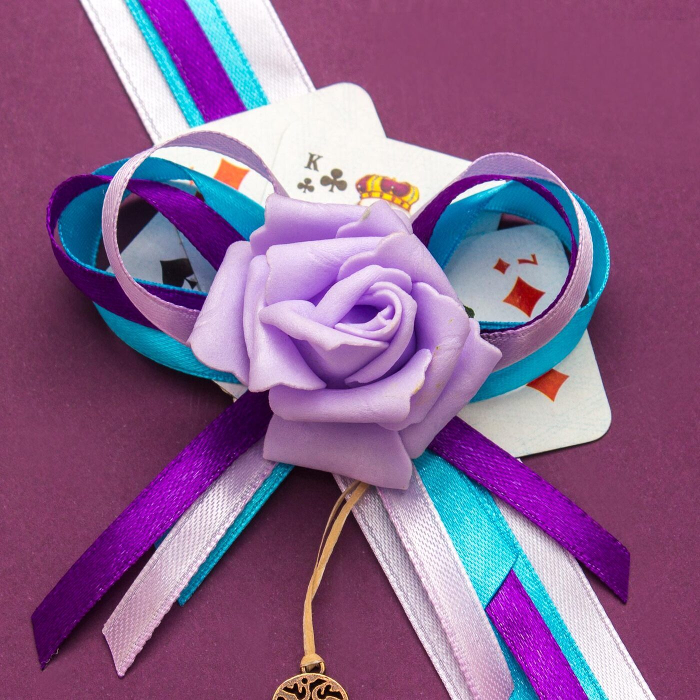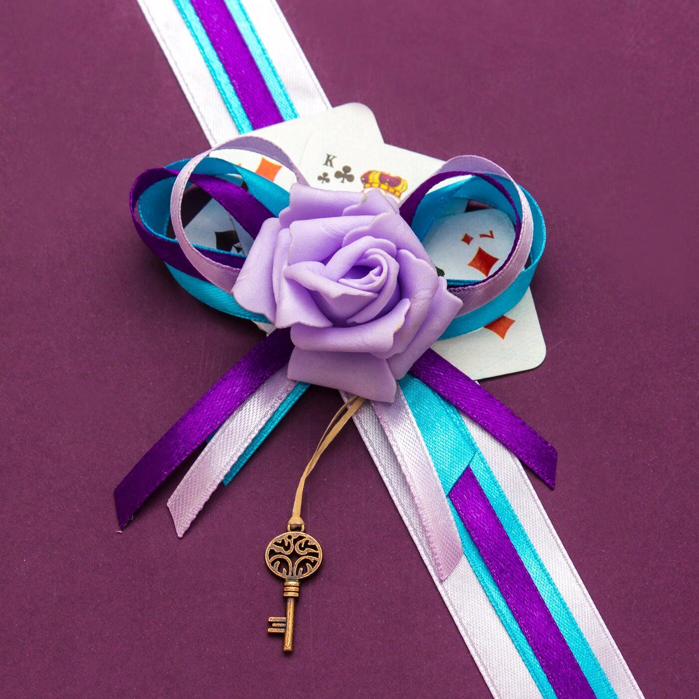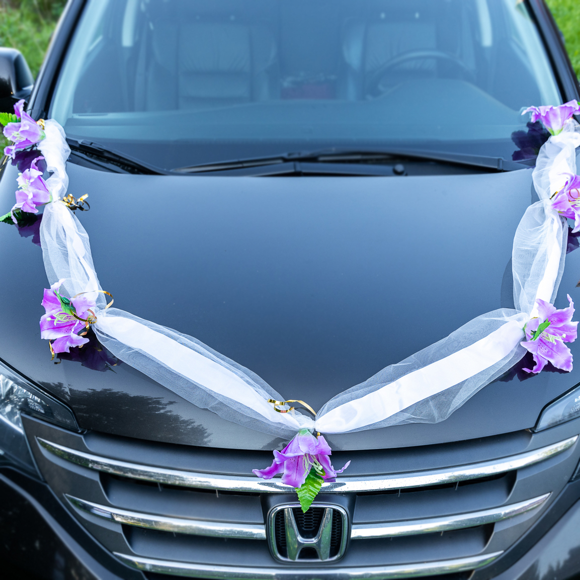 Фатиновая лента с цветами "Нежные лилии" на капот свадебного авто, с тканевыми цветами фиолетового цвета и зелеными листочками