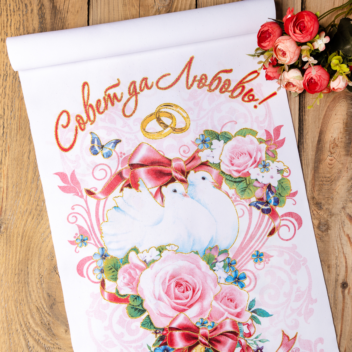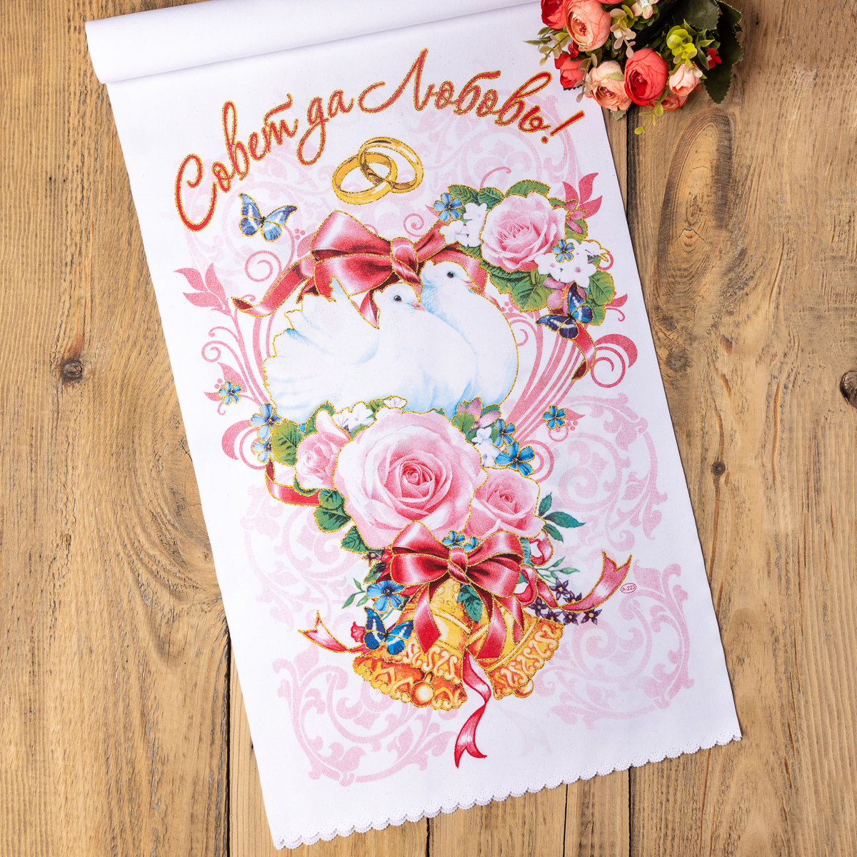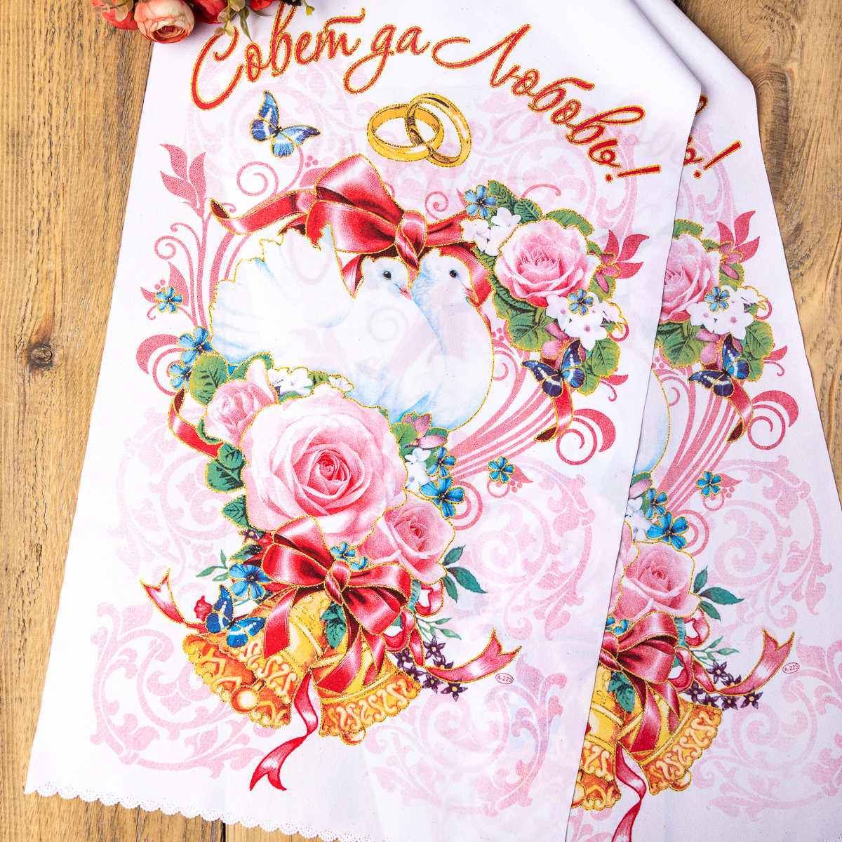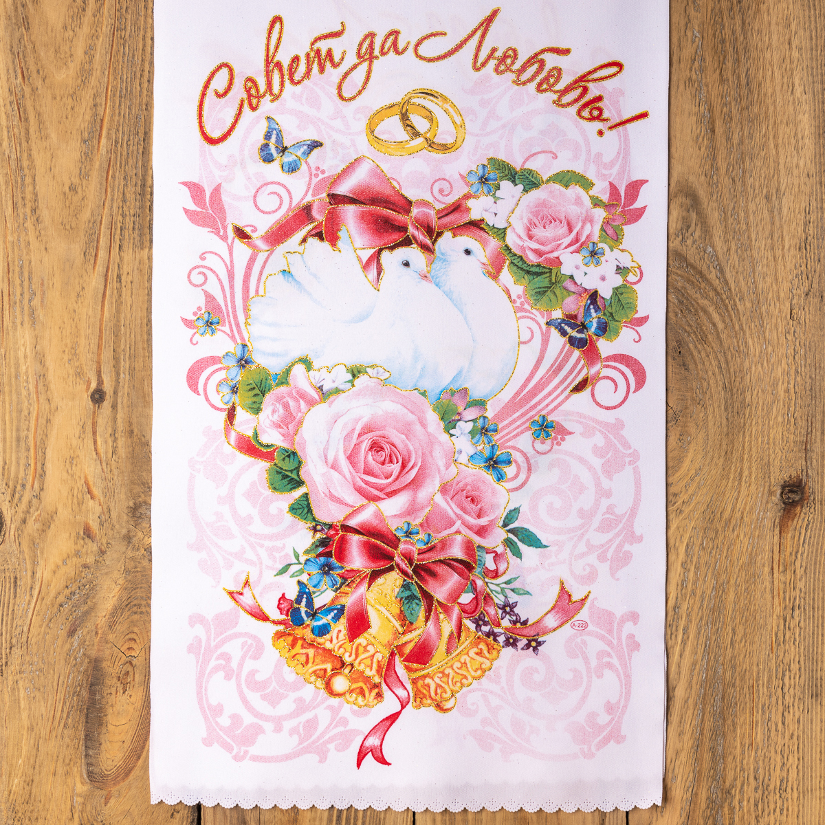 Рушник "Совет да Любовь" с голубками и обручальными кольцами для торжественной встречи молодоженов после ЗАГСа