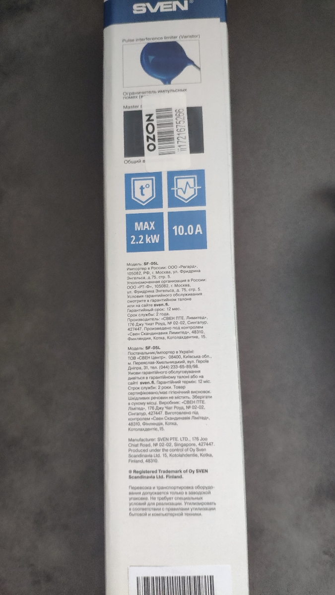 Фильтр SVEN SF-05L 3,0 м /5 розеток/ черный