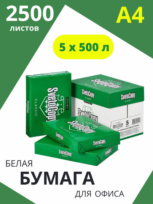 Бумага белая А4 для принтера / Офисная бумага А4 / Бумага Светокопи SvetoCopy для офиса, 2500 листов