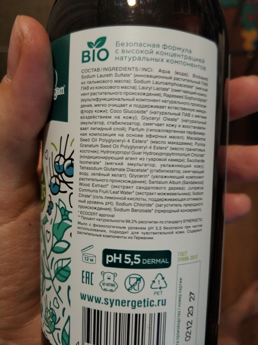 Гель для душа SYNERGETIC «Пачули и ароматный бергамот» увлажняющий, натуральный, 750мл