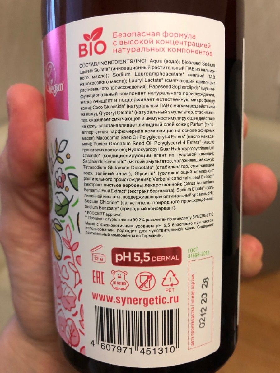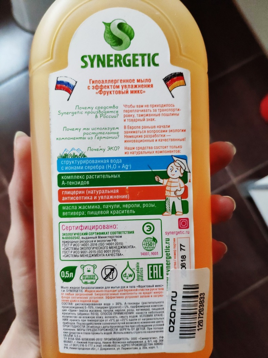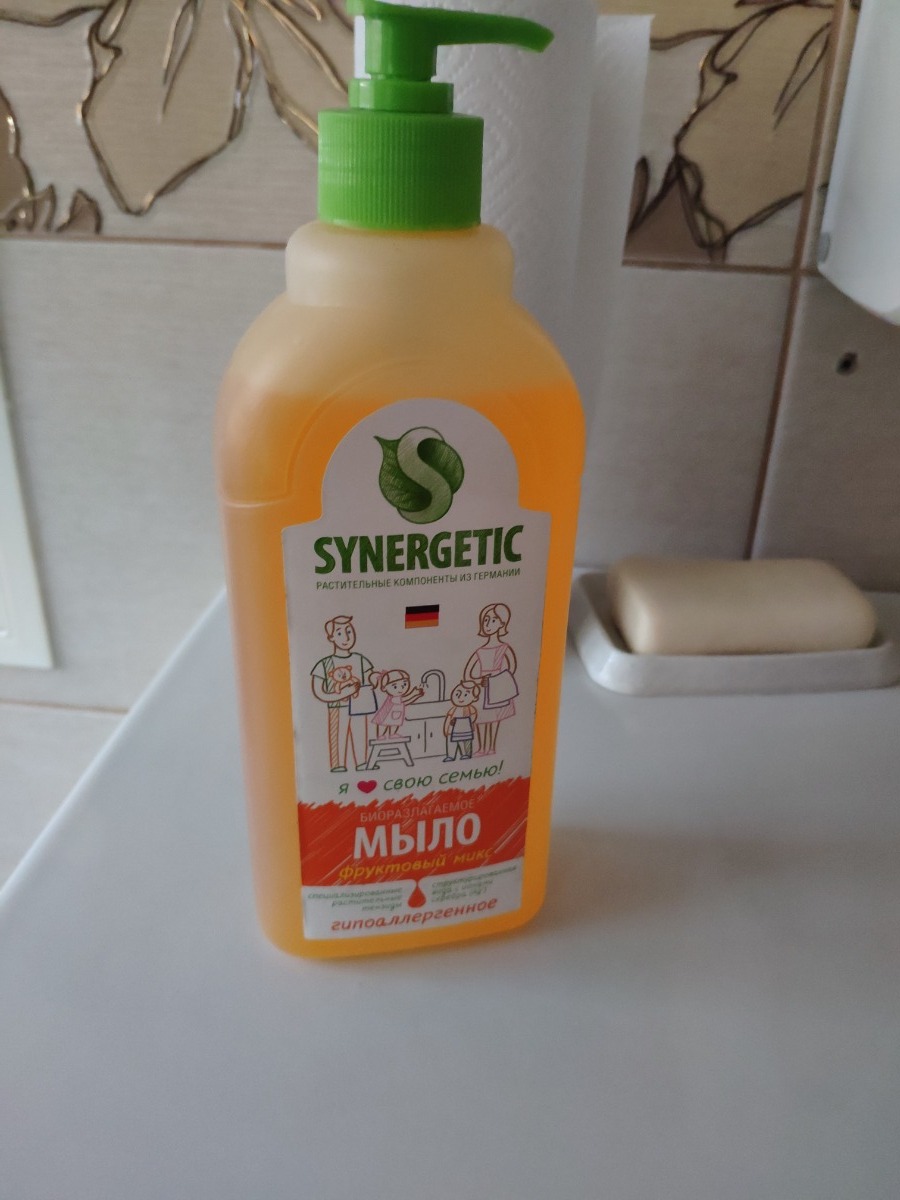 Жидкое мыло SYNERGETIC "Фруктовый микс" с эффектом увлажнения, гипоаллергенное, 500 мл