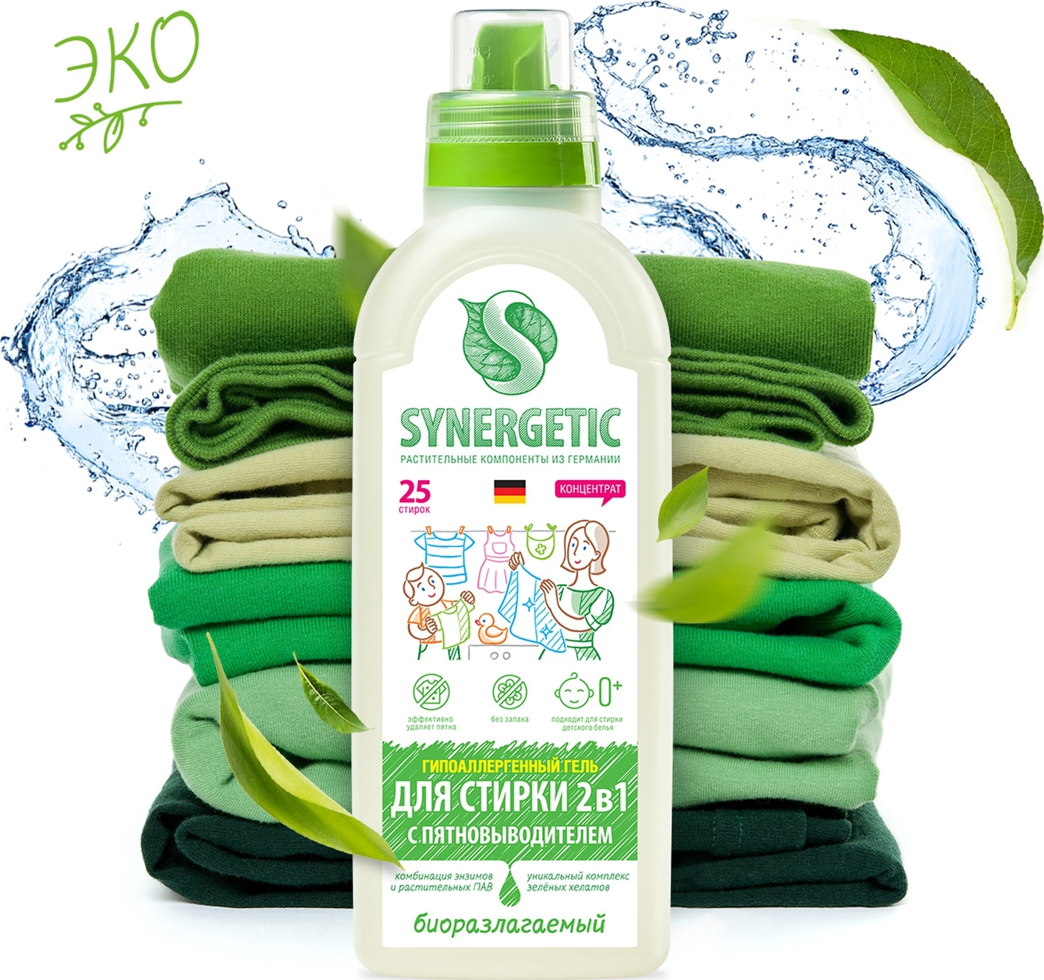 Гель для стирки 2в1 SYNERGETIC c пятновыводителем, концентрат, гипоаллергенный, 0,75л, 25 стирок