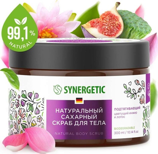 SYNERGETIC скраб для тела, подтягивающий "Цветущий инжир и лотос", сахарный, 300 мл