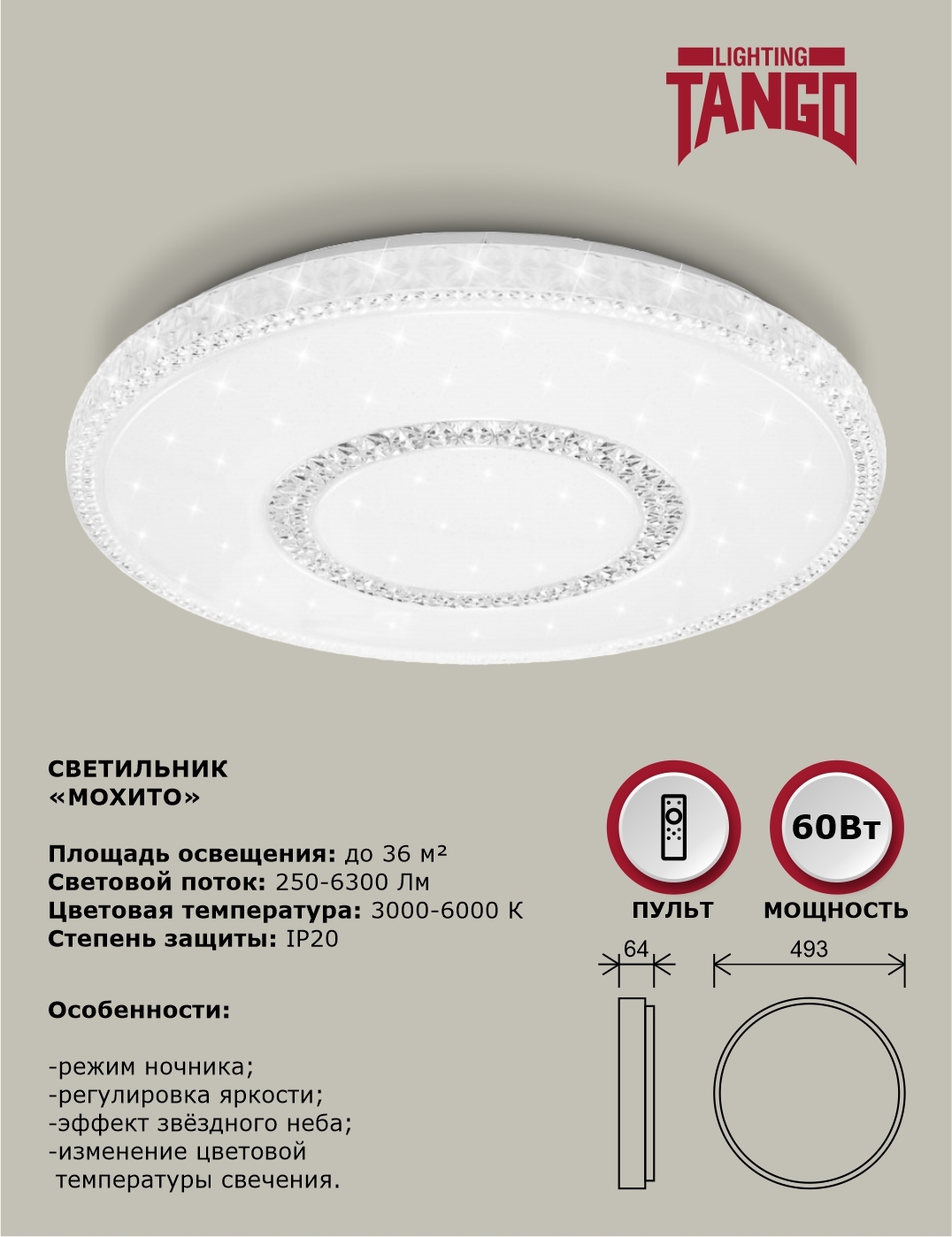 Потолочный светильник Tango Cветильник LED настенно-потолочный "МОХИТО" 60 Вт с ИК ДУ , LED, 20 Вт