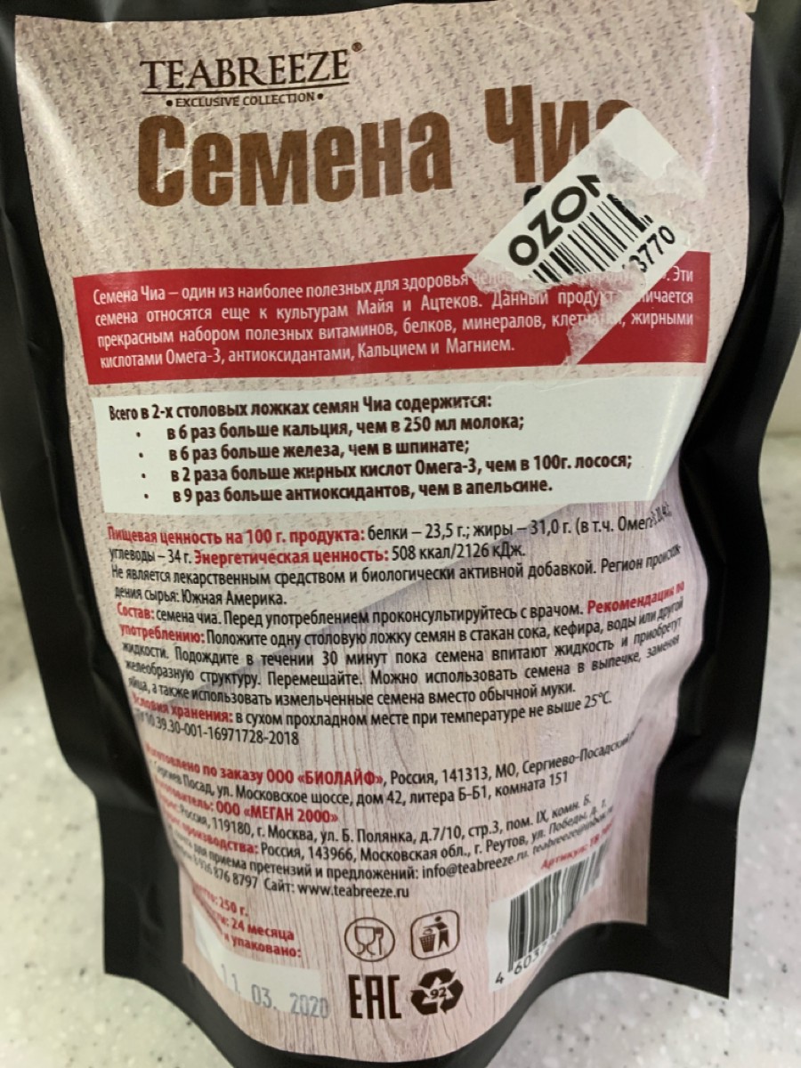 Семена ЧИА TEABREEZE белые, в пакете ЗИП-ЛОК, 500 г.