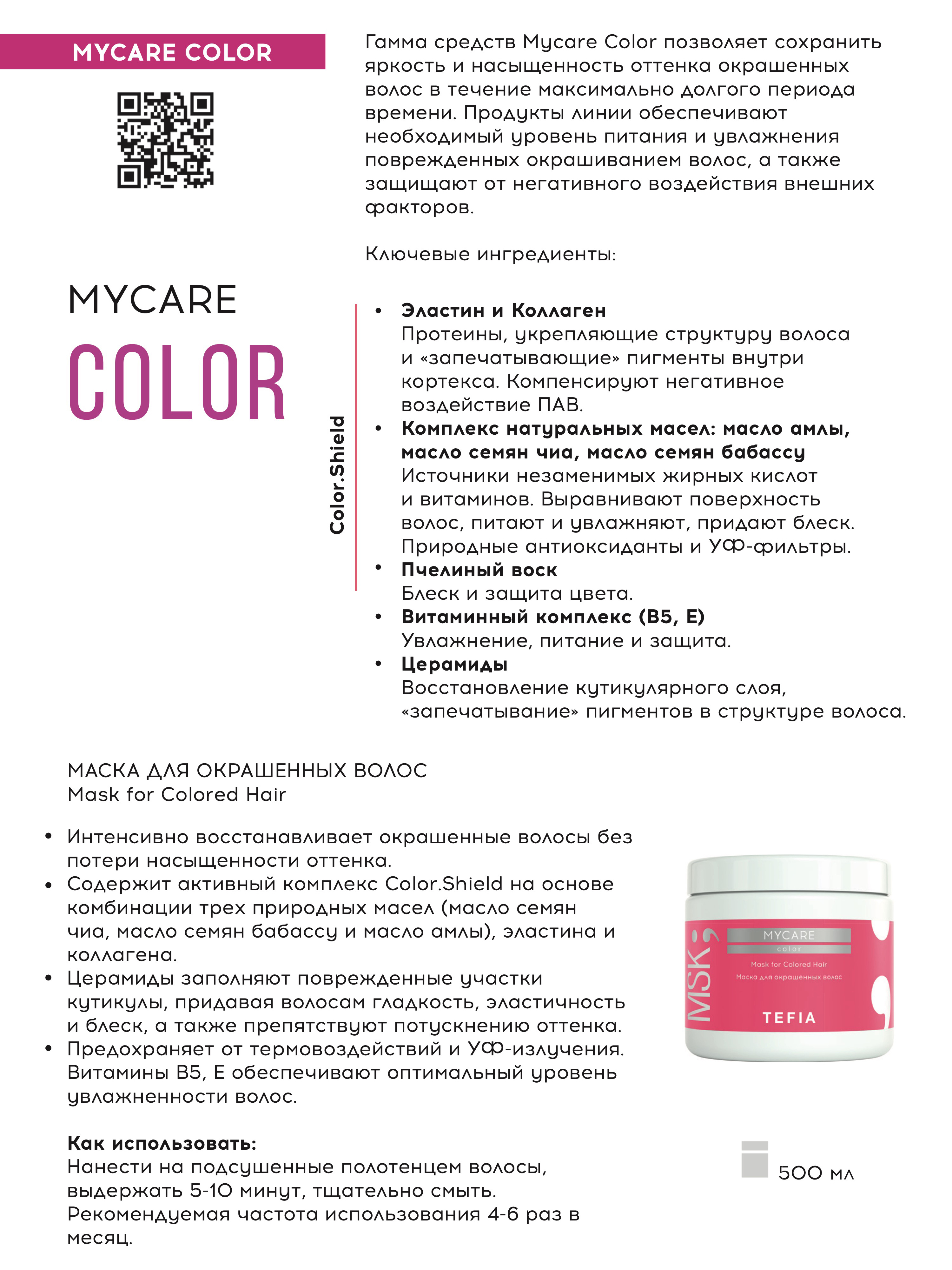 Tefia. Маска для окрашенных волос Mask for Сolored Hair, 500мл, Линия MYCARE