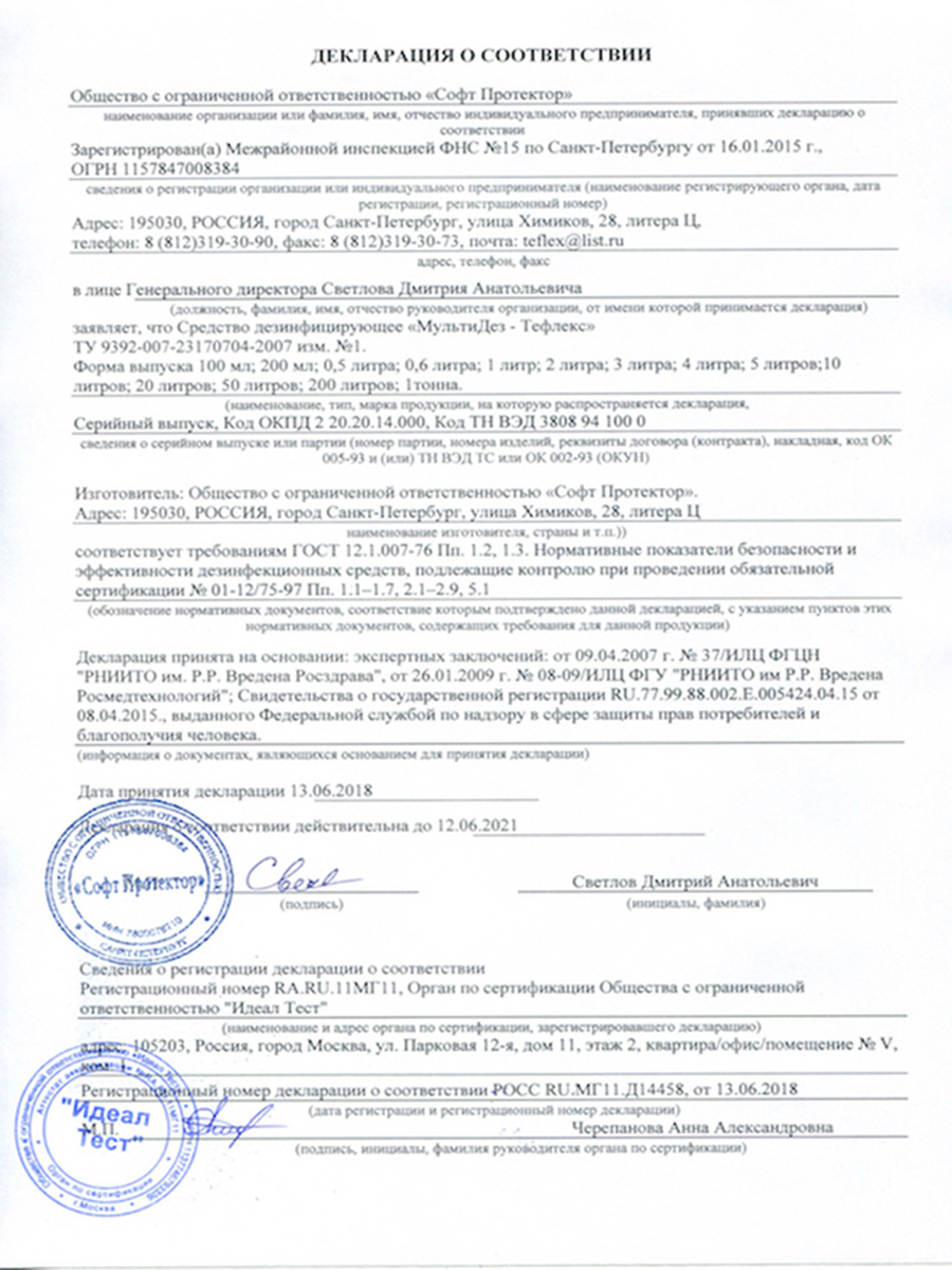 Защитный антисептик для дезинфекции кожи рук Тефлекс с дозатором, без спирта, без запаха, 1 литр