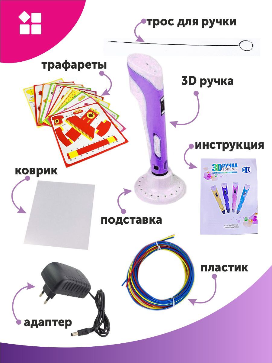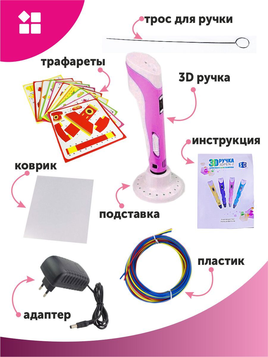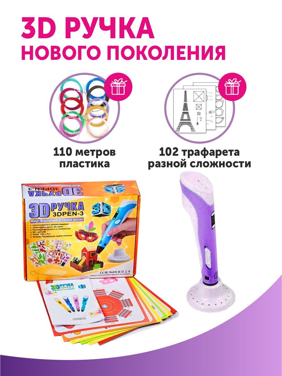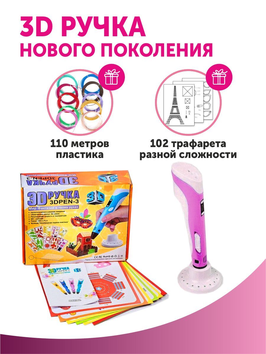 Тёмка 3D ручка и 110м. пластика и Набор трафаретов в комплекте в подарок, набор для детей, розовый