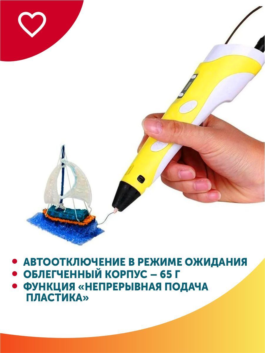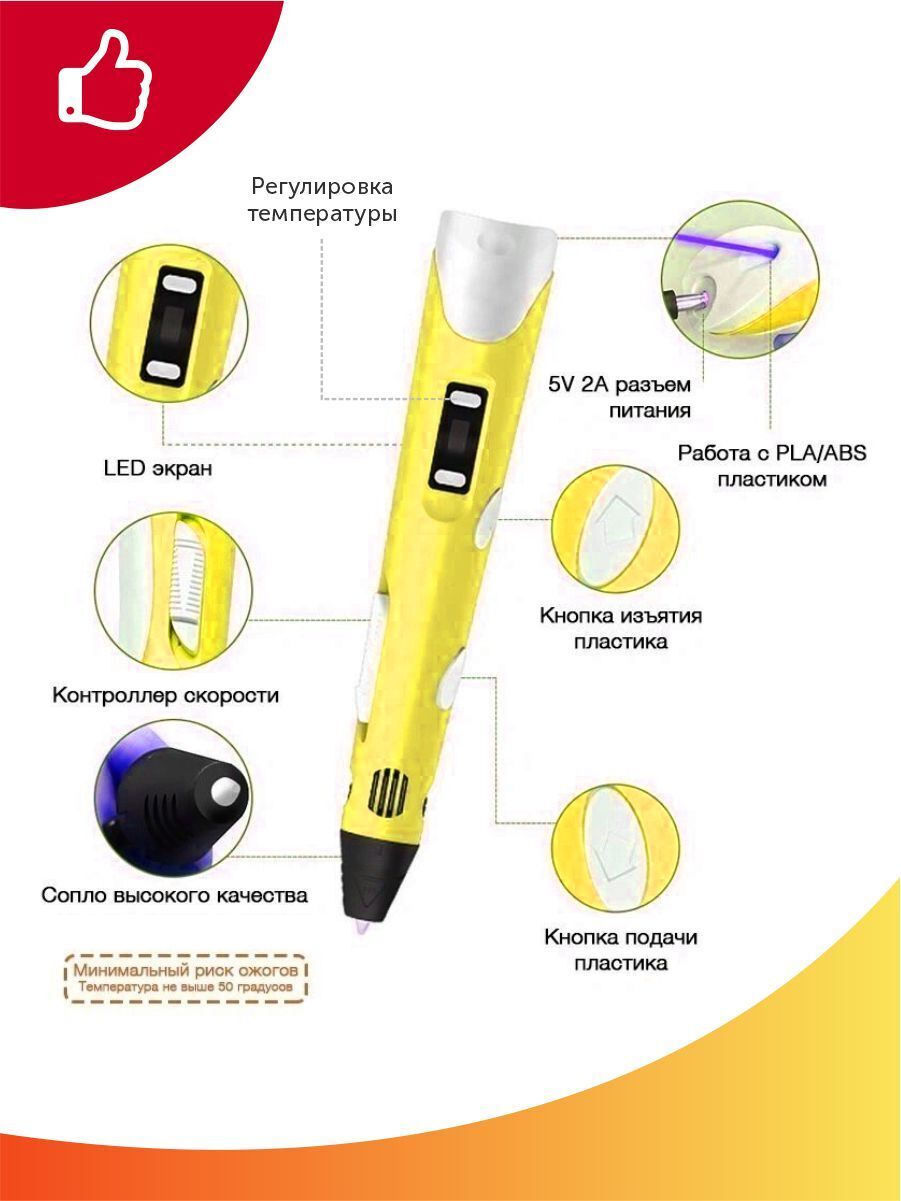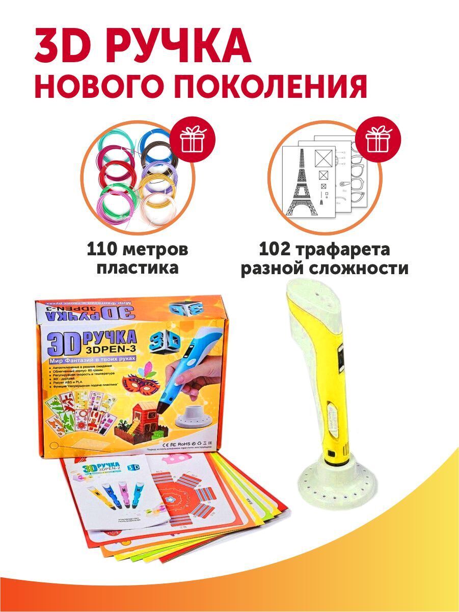 Тёмка+3D ручка и 110м PLA пластика и Набор трафаретов в комплекте, набор для детей, жёлтый
