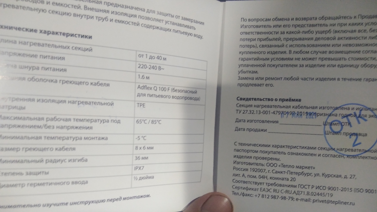 Греющий кабель Теплайнер в трубу, 2м 20Вт