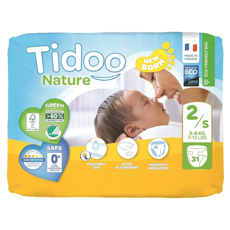 Эко подгузники детские Tidoo 2S (3-6 кг) 31 шт. Коэф-т Биоразлагаемости 60%. Франция