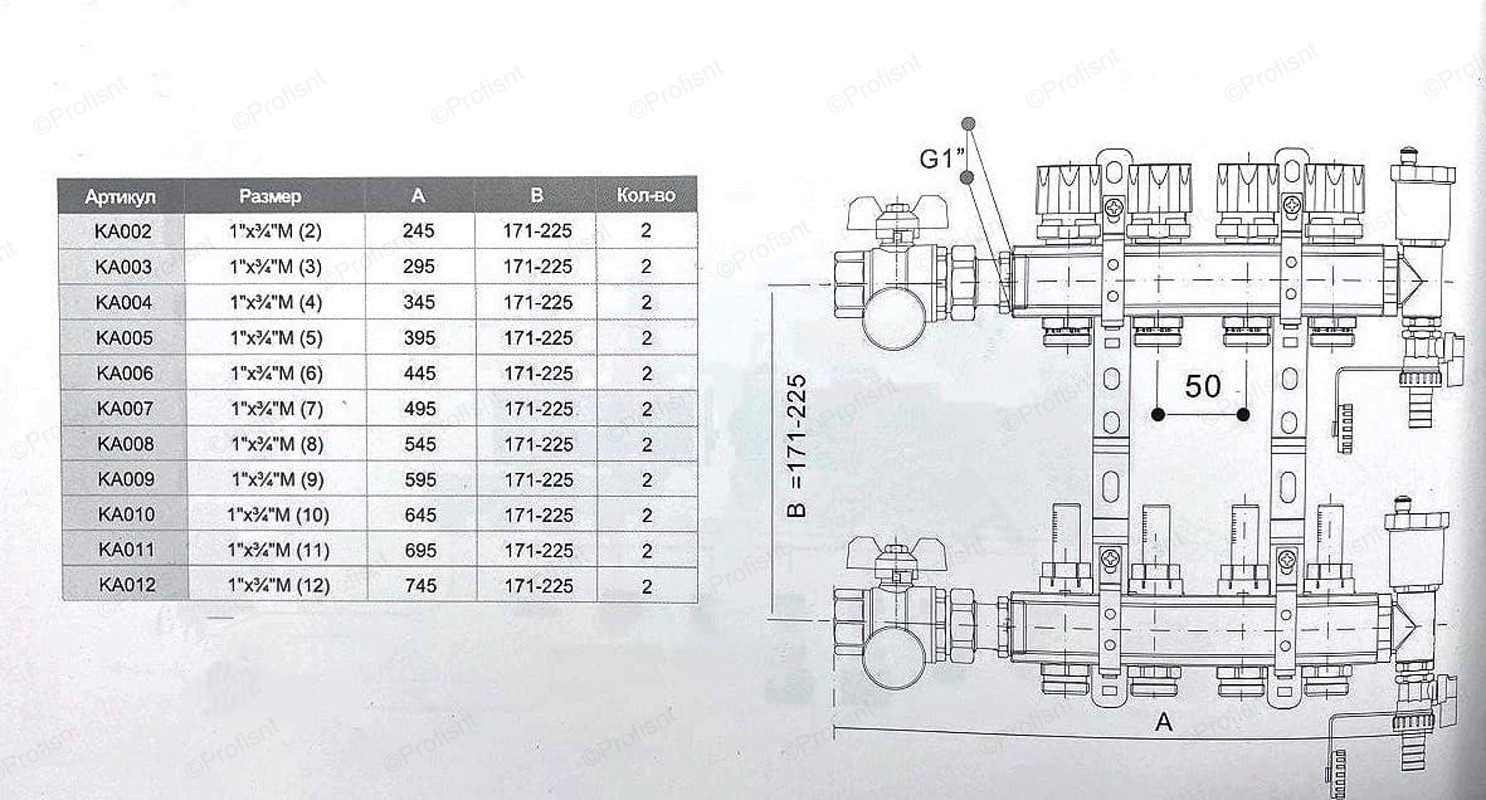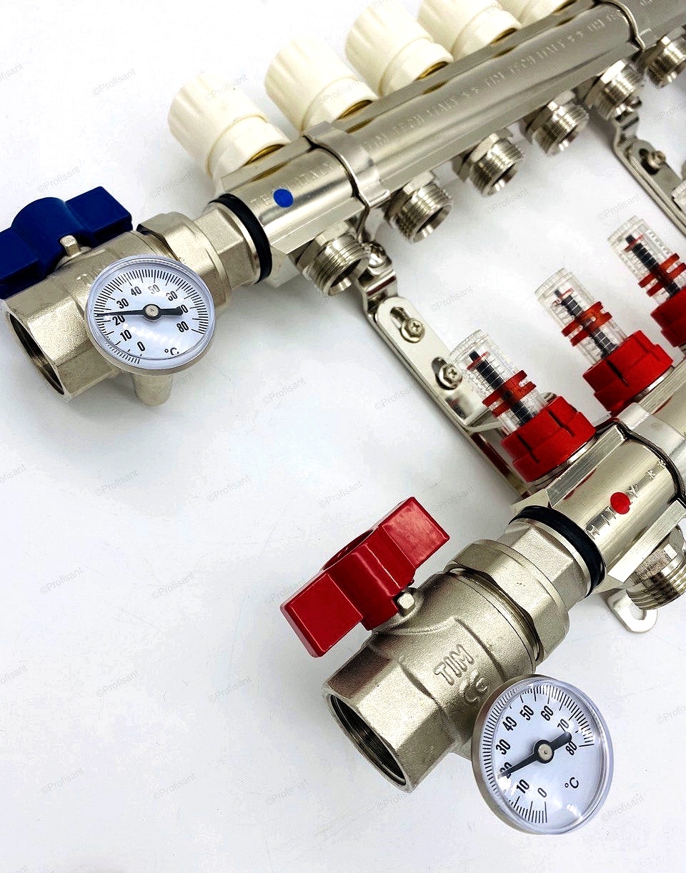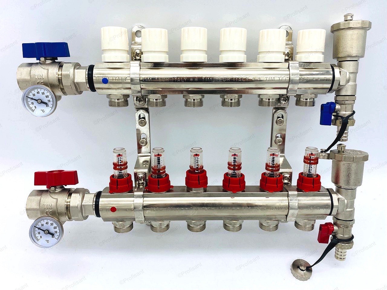 Коллекторная группа TIM - 1" на 4 контура 3/4" (нерж. сталь с расходомерами и сливными кранами)
