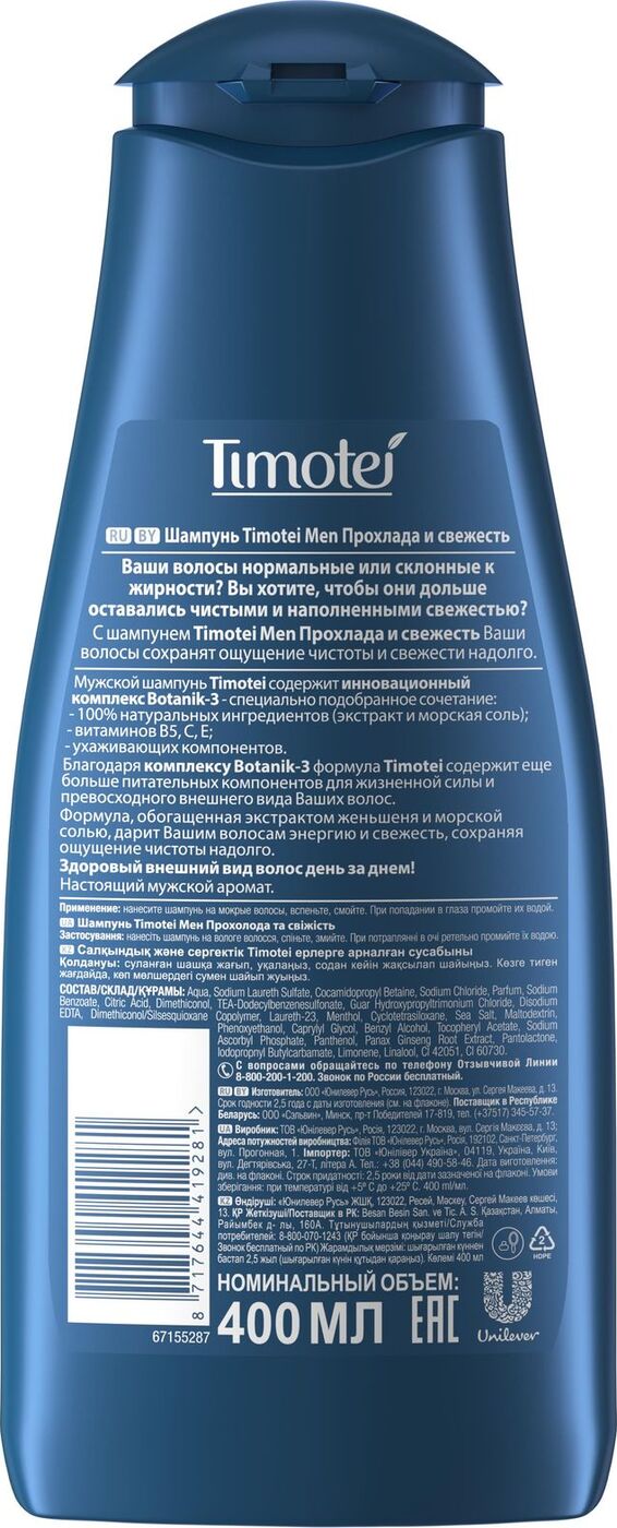 Шампунь Timotei Men Прохлада и свежесть, для нормальных и жирных у корней волос, 400 мл