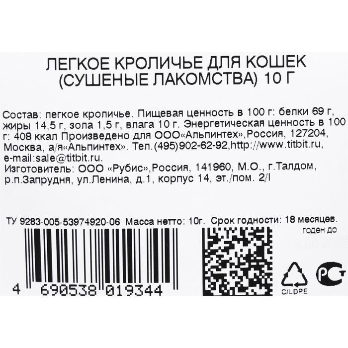 Сушеные кроличьи легкие Titbit для кошек 10 г/Жевательные лакомства для кошек с витаминами
