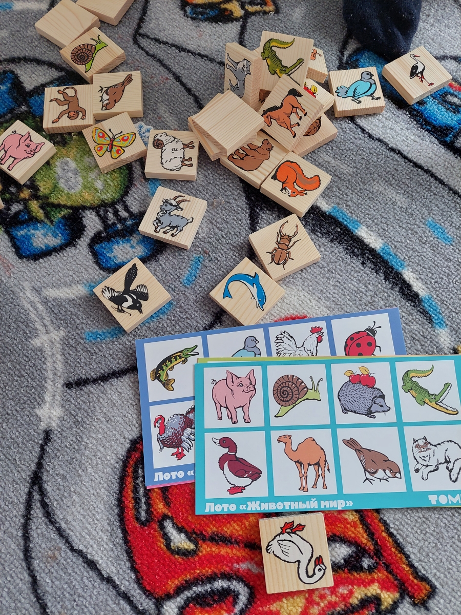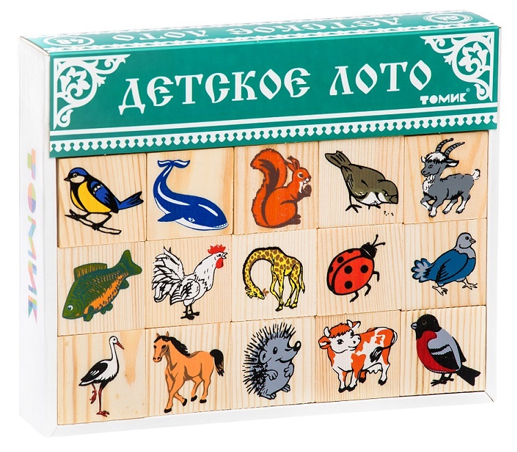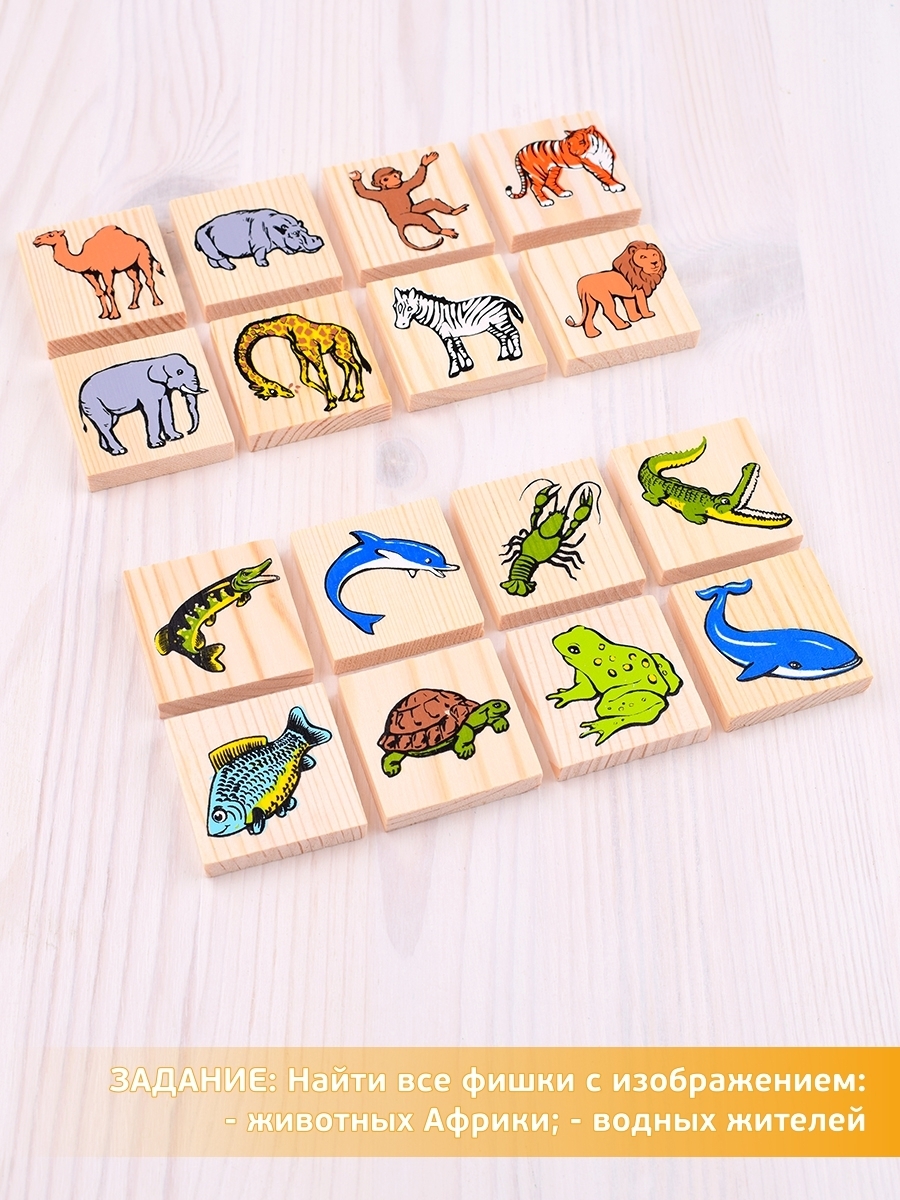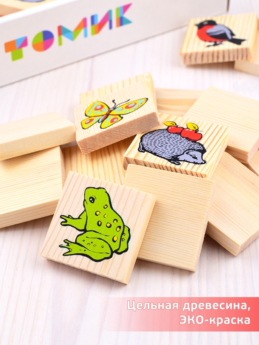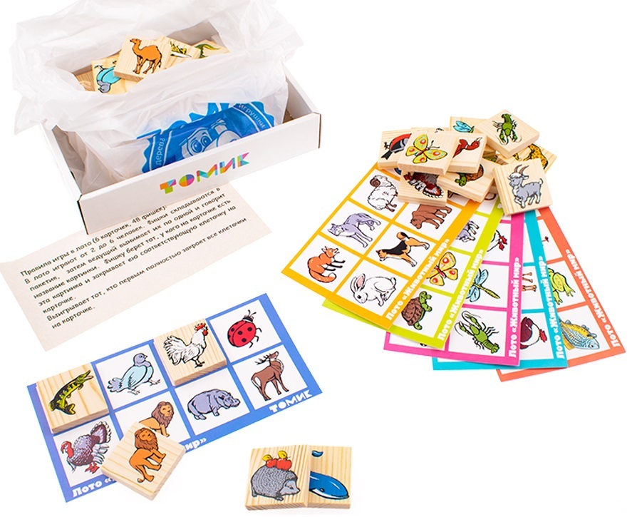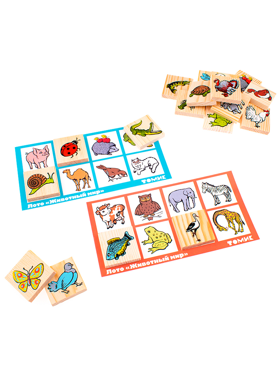 Деревянное лото Томик "Животный мир", развивающая настольная игра для малышей, 6 карточек + 48 фишек