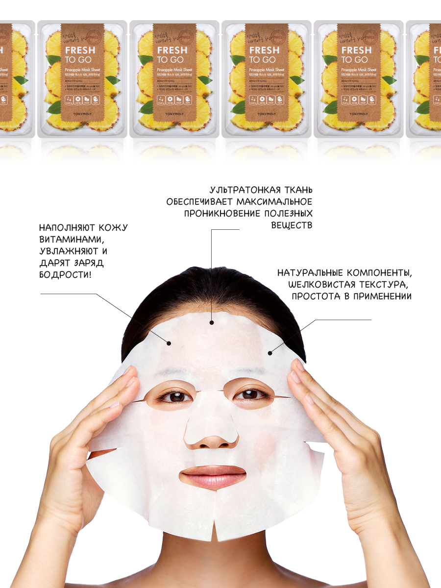 Tony Moly Тканевые маски для лица 5 штук с экстрактом ананаса / Корейские маски / Набор масок для лица Fresh To Go Pineapple Mask Sheet 5 Set
