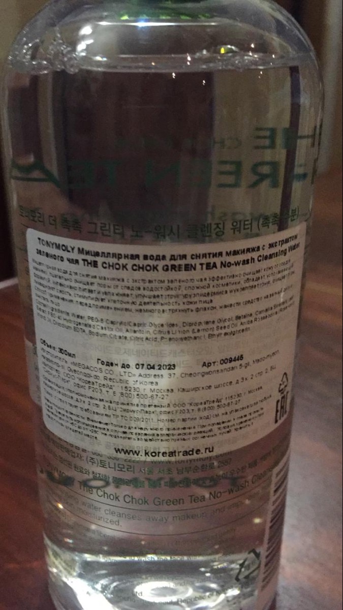 TONYMOLY Мицеллярная вода для снятия макияжа с экстрактом зеленого чая THE CHOK CHOK GREEN TEA No-wash Cleansing Water, 500 мл.