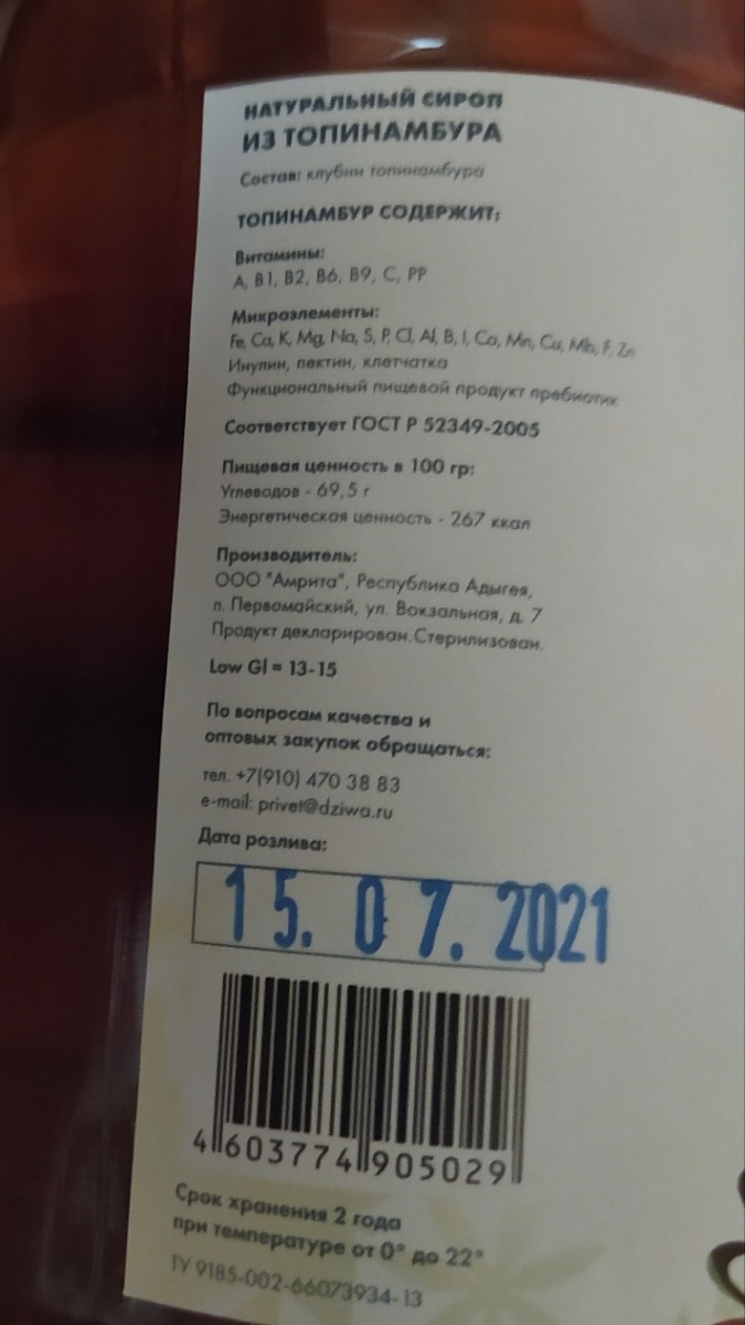 сироп ТОПИНАМБУРА НАТУРАЛЬНЫЙ ГУСТОЙ 74% 400гр *2 шт. в ст/б ТопСироп