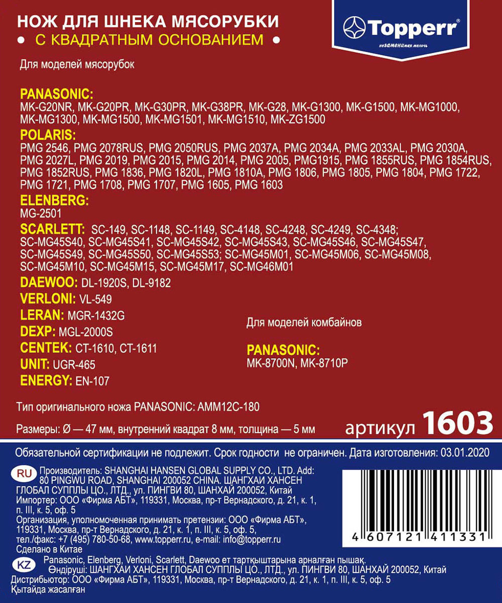 Нож для мясорубок Topperr 1603 для Panasoniс/Elenberg/Verloni/Scarlett/Daewoo