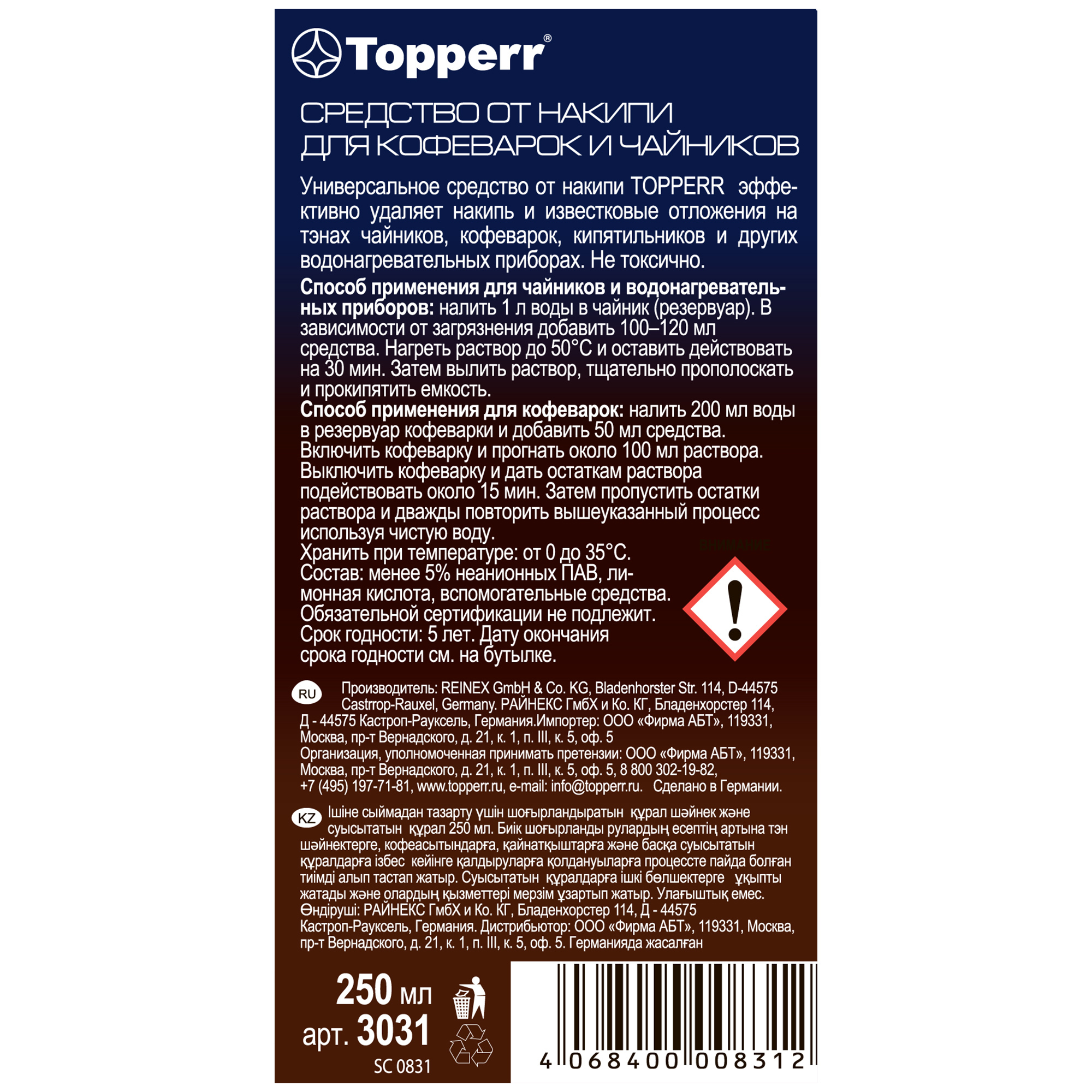3031, Средство от накипи "Topperr" для чайников и водонагревательных приборов, 250 мл