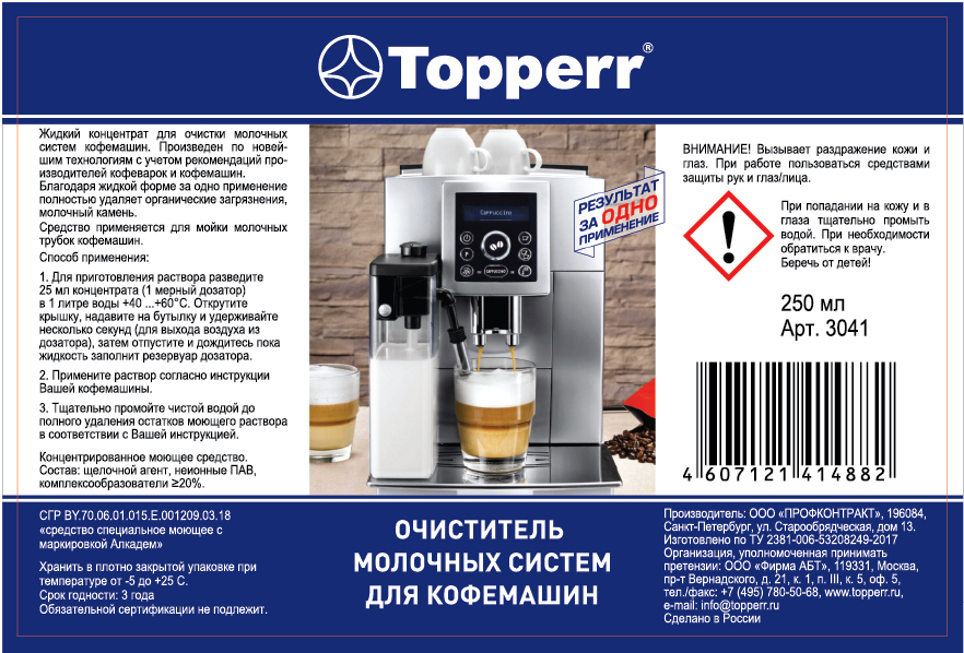 Cредство моющее для молочных систем кофемашин "Topperr", 250 мл (3041)