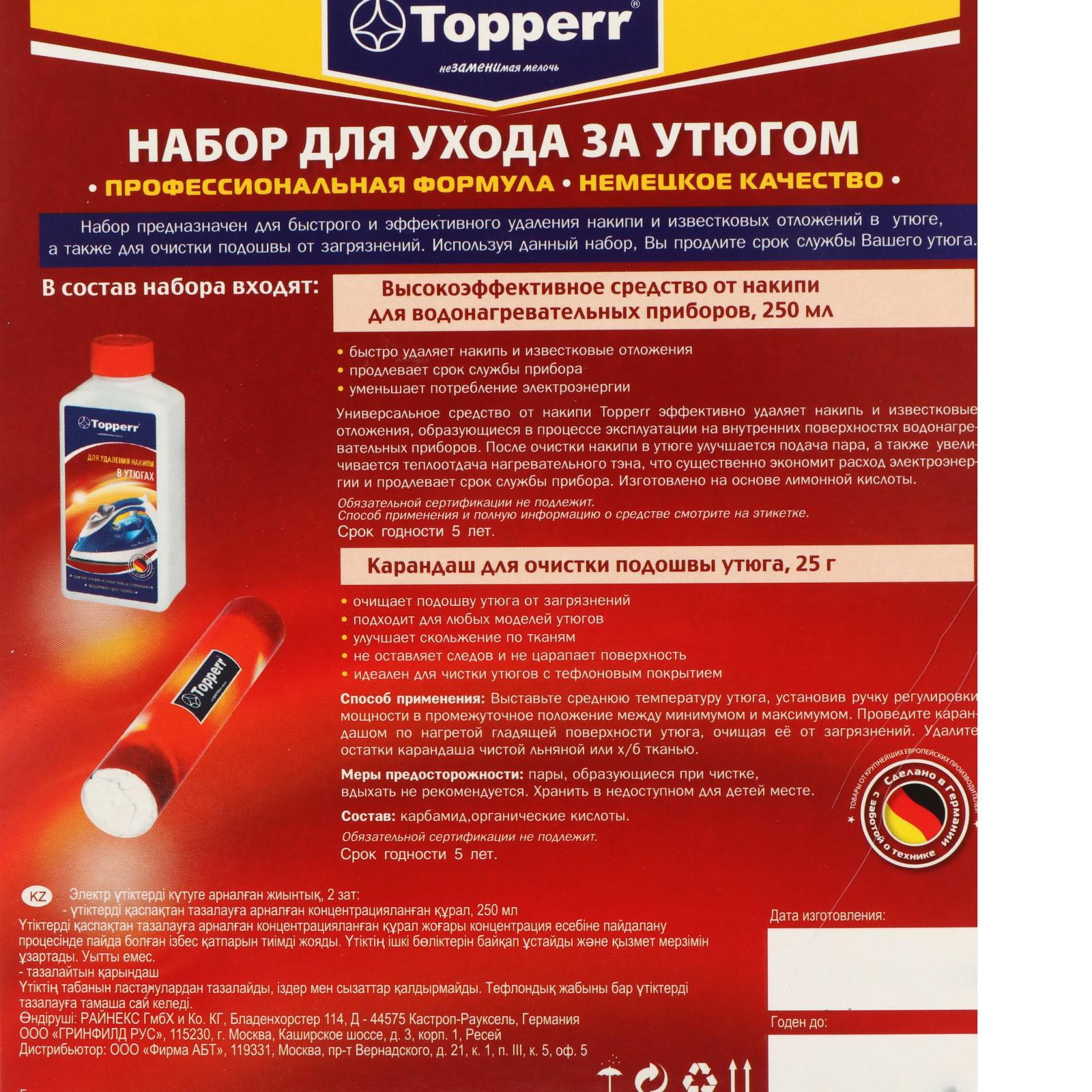 Набор для ухода за утюгом Topperr 2 предмета: средство+чистящий карандаш