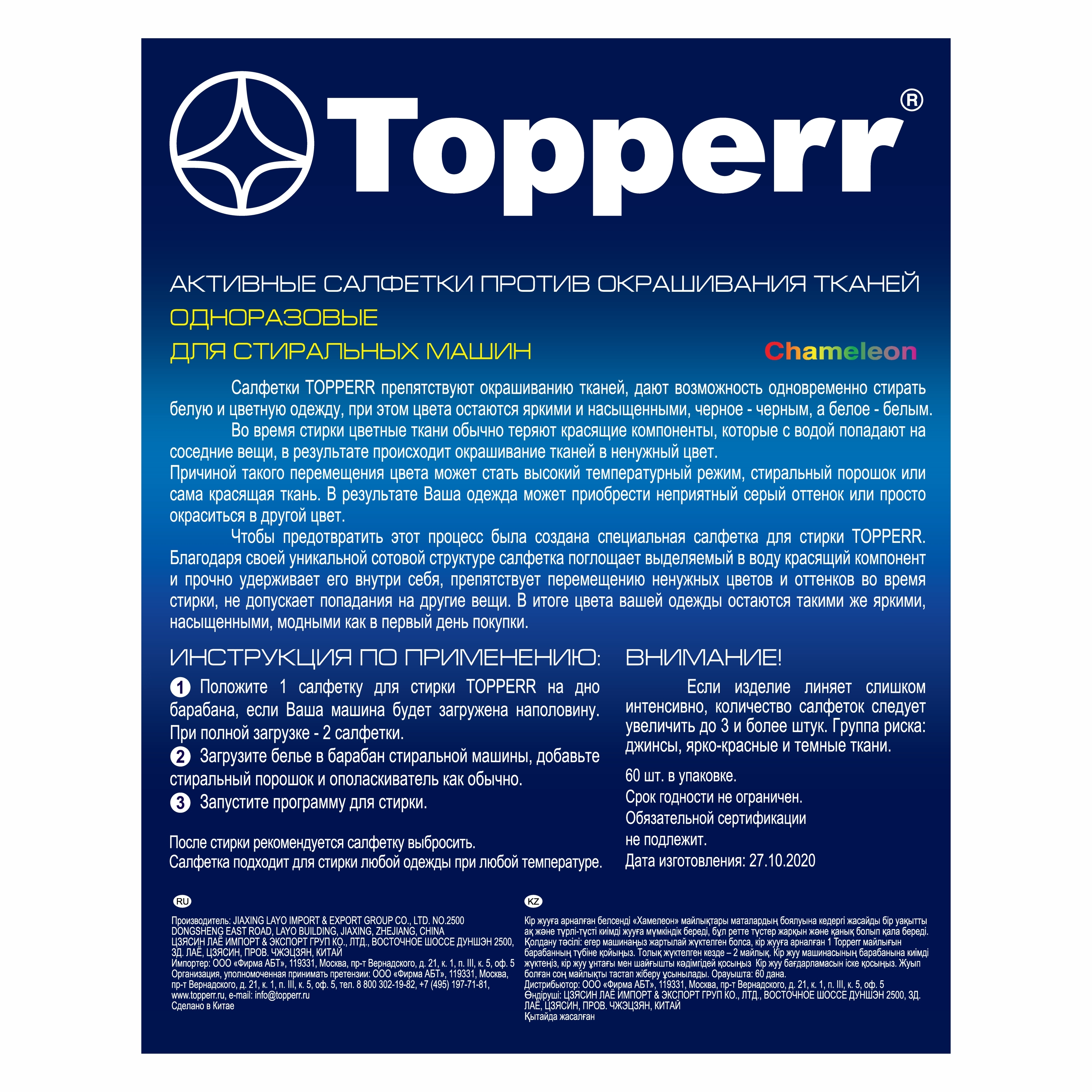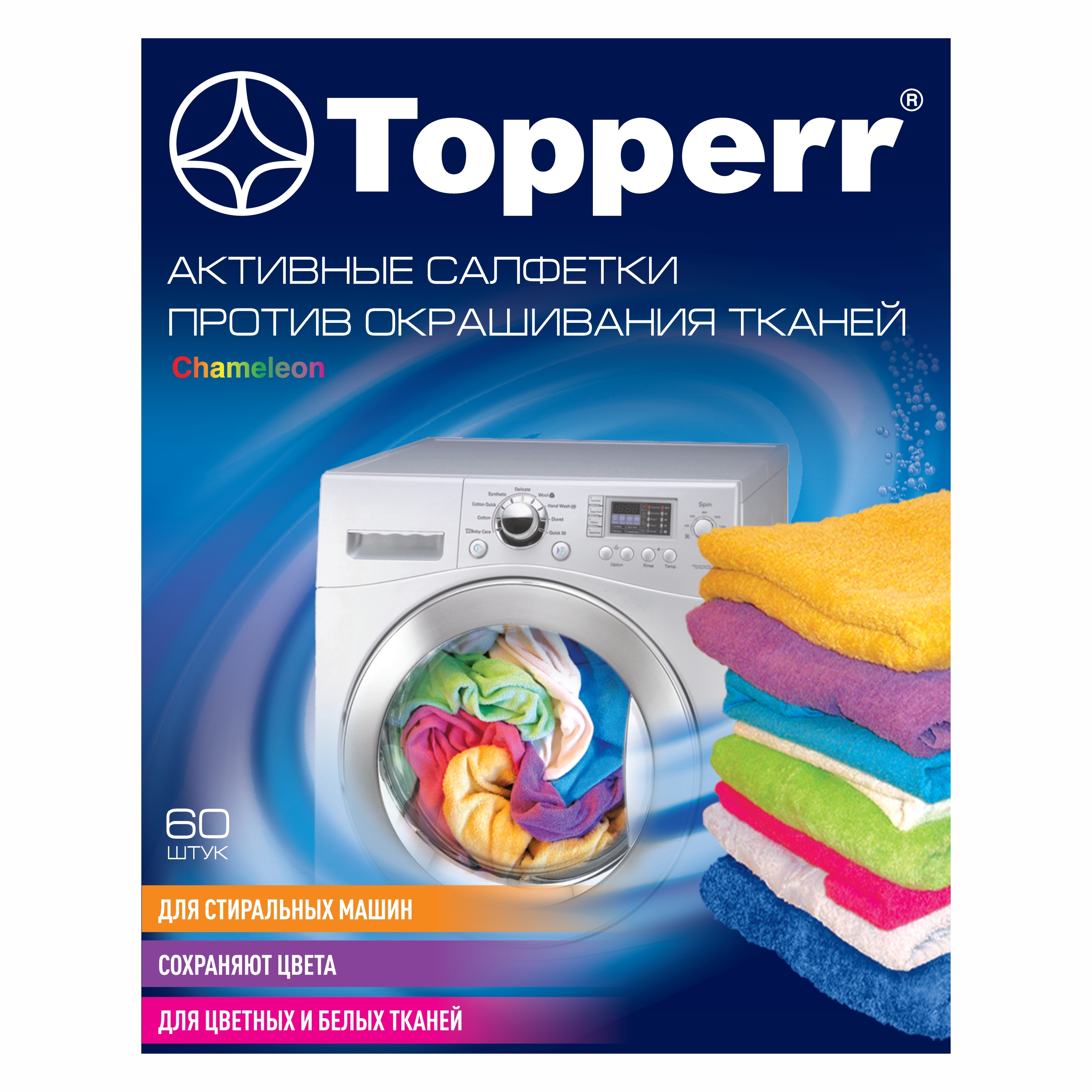 3227 Topperr Салфетки Хамелеон для улавливания цвета при стирке, 60 шт. в коробке