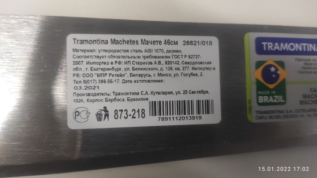 Мачете Tramontina 873-218, длина лезвия 46 см