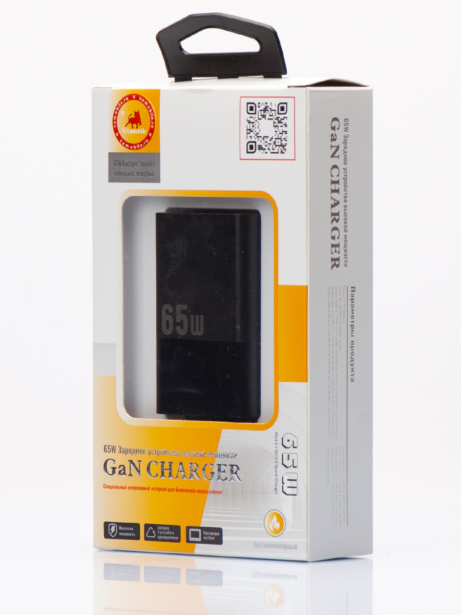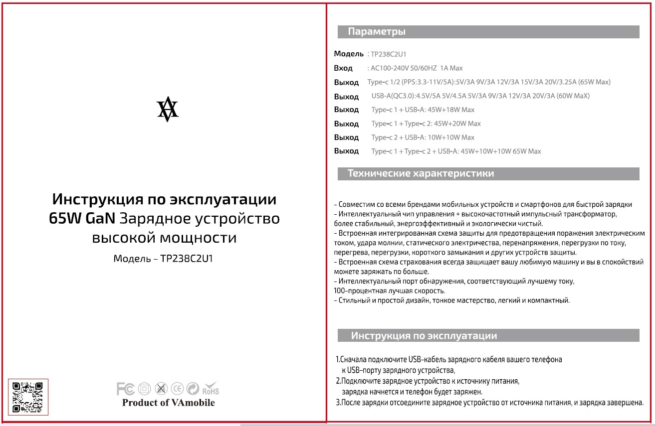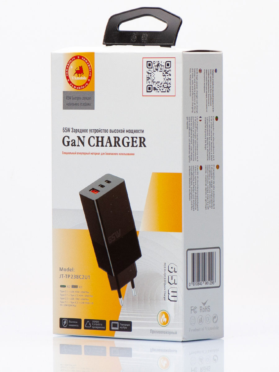 Сетевое зарядное устройство VAmobile, 65W, 1 USB, 2 PD, огнеупорный материал, цвет: черный